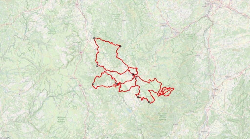 Ook een evergreen, tussen Le Béage en Les Estables, rond de ‘molshopen’ Mont Gerbier-de-Jonc en Mont Mézenc, met elkaar verknoopte wegen, waarop wij de pogo dansen, wakker geschud door een heleboel groen. Oh, hoe mooi is dat? In cijfers: 122, 631, 36, 378, 237, 215, 278, 410, 262 – zet voor elk een D, ook voor een blijvende glimlach.