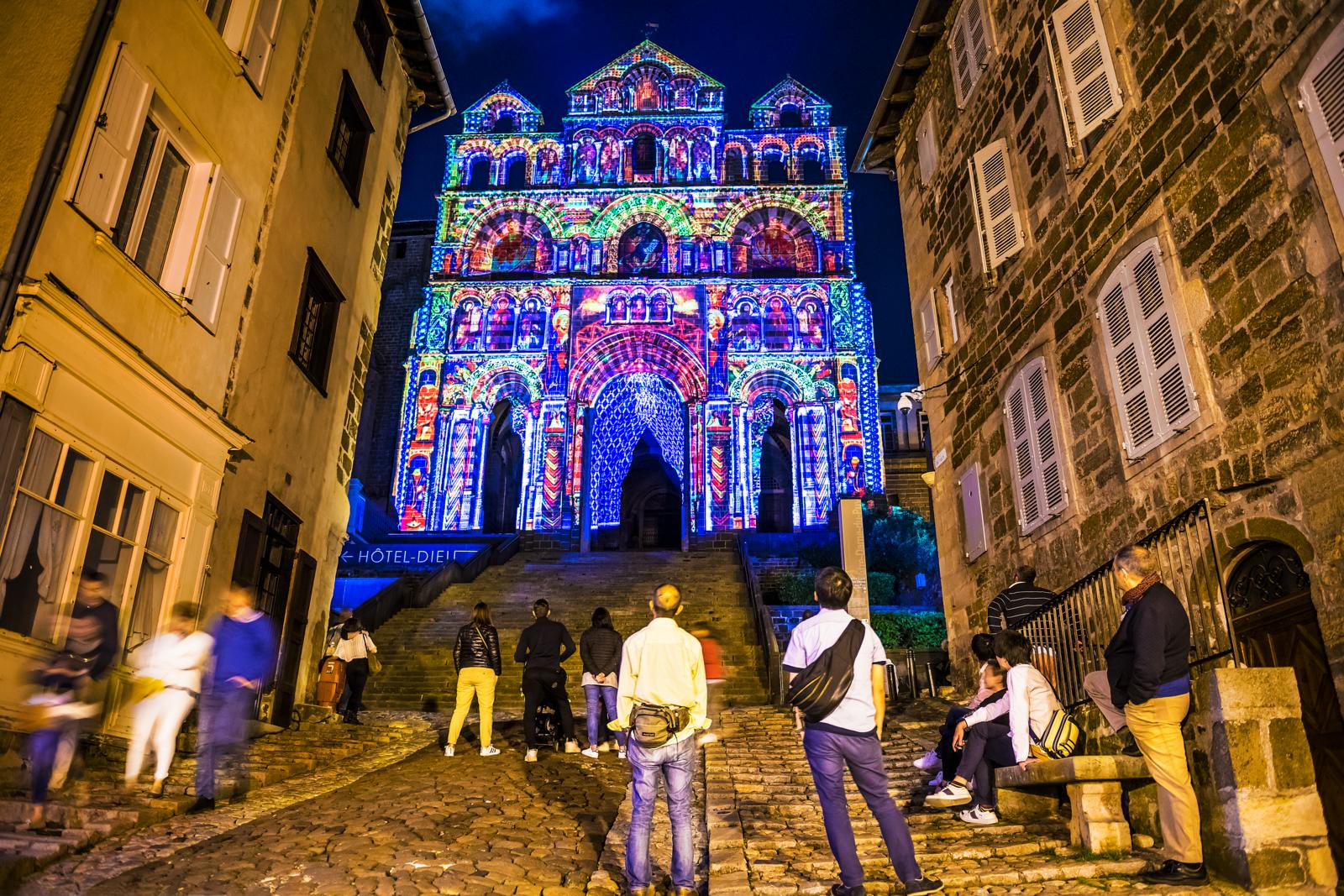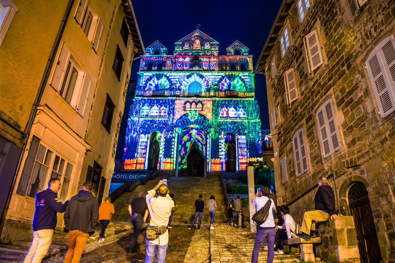 Wat een geweldige start! Deze zaterdagavond heeft het ruimte-tijdcontinuüm het bijzonder goed met ons voor. De geluksbrenger is de dame aan de hotelreceptie, die ons de tip geeft voor Puy de Lumières, een spectaculaire lichtshow op enkele van de meest markante plekken in deze met een hemelse skyline gezegende stad met drie vulkaankegels. Merci beaucoup! Ook al wordt de nacht iets korter, we zwijmelen mee met de stroom mensen die door de oude straatjes naar de publieke vertoning bij de kathedraal Notre Dame de l’Annonciation trekt. Als zoiets al in de duistere middeleeuwen had bestaan, zouden zelfs de meest ongelovige zielen bekeerd zijn of angstig zijn weggevlucht voor wat zij als duivelswerk zouden beschouwen. Wanneer hoog bovenaan een brede trap de gevel van Onze Lieve Vrouw van de Verkondiging in steeds nieuwe, fantastische kleedjes verschijnt, terwijl andere motieven op de kerkmuren worden geprojecteerd, lijkt het wel of het door een goddelijke hand gestuurd wordt.