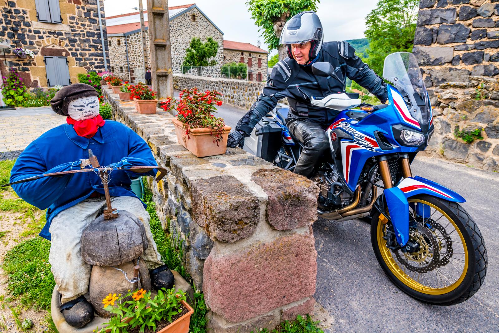 Langzaam zijn we gewend aan de DCT van de Africa Twin. In plaats van te schakelen, draaien we alleen we de richting om. En daarmee ook het landschap. Na de hoogvlaktes en kloven van de Allier in het westen van Le Puy, rijden we nu grofweg richting het oosten. Naar de vulkanische bergketens, gevormd door de ochtendzon naar veelbelovende ‘molshopen’. Voor Chadron eerst een korte liaison van D27 en Loire, die dicht bij elkaar door de vegetatie schommelen. Dan een déjà-vu: is dat niet de hoed van Bob Marley, het groen-geel-rode ringding, dat in Goudet de kerktoren beschermt tegen Petrus’ grillen? Nee, we hebben niet geblowd. Wel kunnen we onder een linde op het kerkplein een dutje doen, zonder meteen als zwervers weggejaagd te worden.