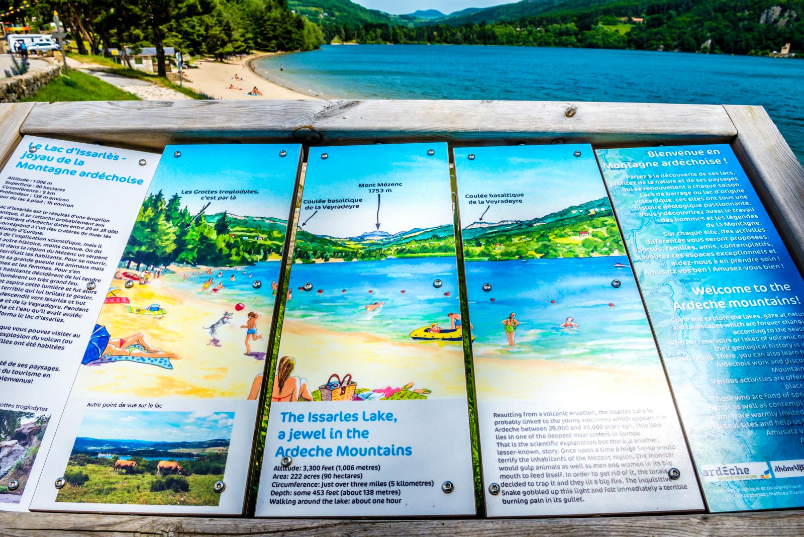 En dromen in het plus beau Arlempdes, een dorpsschoonheid met bijna twaalf dozijn inwoners, van een roltrap. Steil gaat het, beter: zou het gaan, omhoog naar een rotsachtig plateau met de resten van het eerste kasteel aan de Loire, die 30 kilometer verderop ontspringt. Fenomenaal moet het uitzicht daarboven zijn – vanuit vogelperspectief. Maar een paar krukasomwentelingen verder, bij de zwemplek naast de D54 richting Vielprat, is het dat ook. Het kratermeer Lac d’Issarlès, een turkooisblauw juweeltje ‘in de bergen van de Ardeche’, met een zandstrand, camping, gastronomische infrastructuur en zelfs een traiteur-slagerij. Echt een blijvertje.