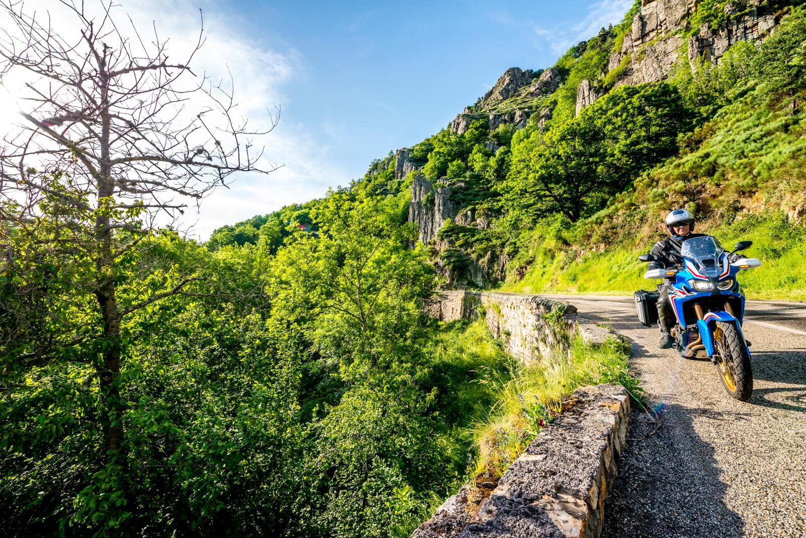 We rijden via de D589 tot Saint-Privat-d’Allier, waar het echt gaat beginnen. ‘Route de la Bête’ – de route van Het Beest – staat op een bord en het is waarachtig om bij te knielen. Pelgrims op weg naar Santiago de Compostella wandelen omhoog naar Rochegude, naar de kapel Saint Jacques en een oude wachttoren, om te genieten van het panoramisch uitzicht op de kloven van de Allier. Wij ook, maar dan toch liever per mobiele uitkijkplatforms, die vanaf een nog hoger perspectief als twee kleurrijke stippen op de D301 naar het diep uitgesneden rivierdal slingeren. Tot de motoren naar beneden slingerend Prades bereiken. We koelen af aan de oever van de Allier, een populaire zwemplek, omringd door de basaltorgels van Prades, die als versteende orgelpijpen de lucht in rijzen.