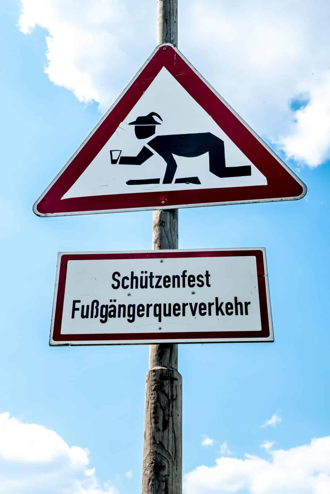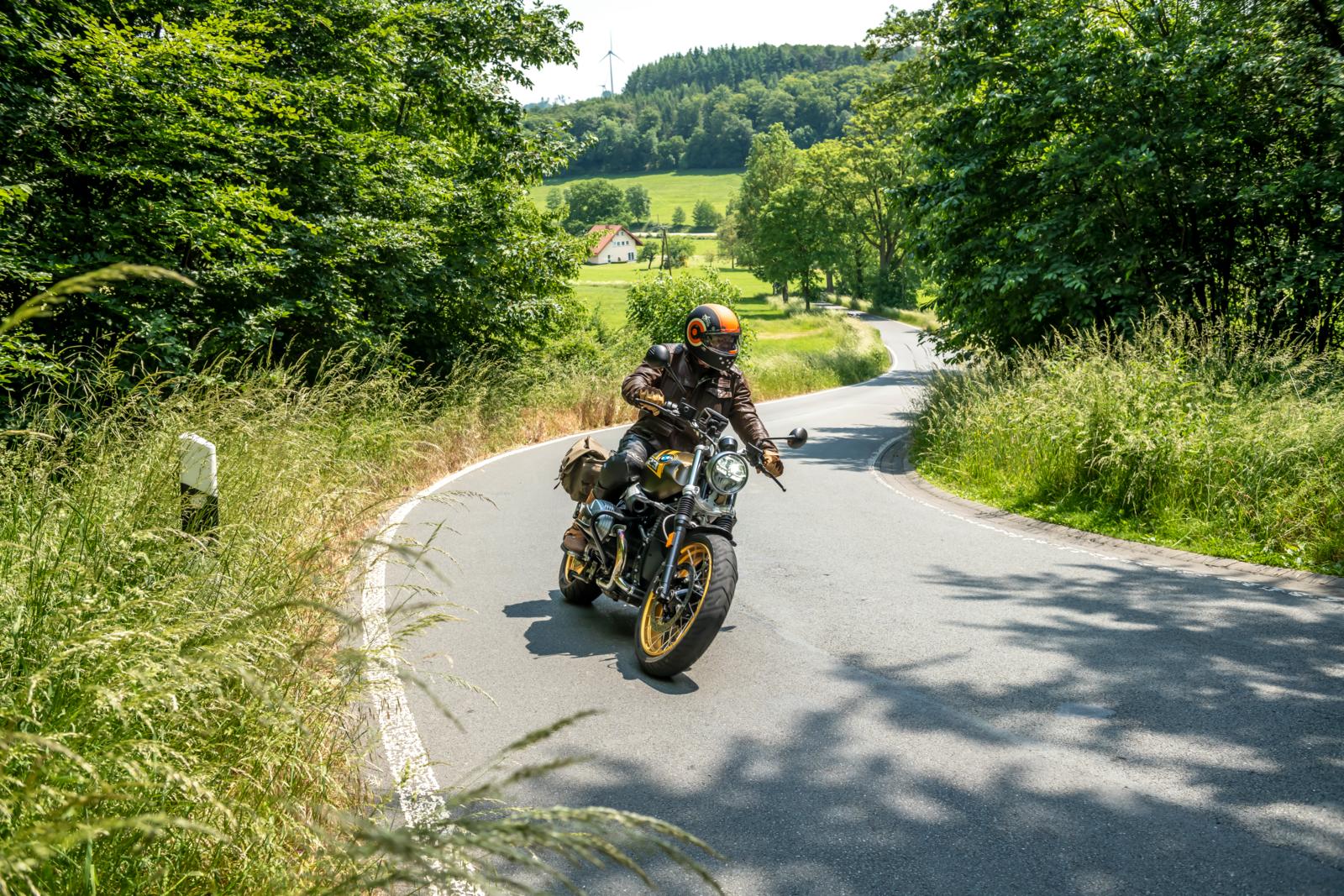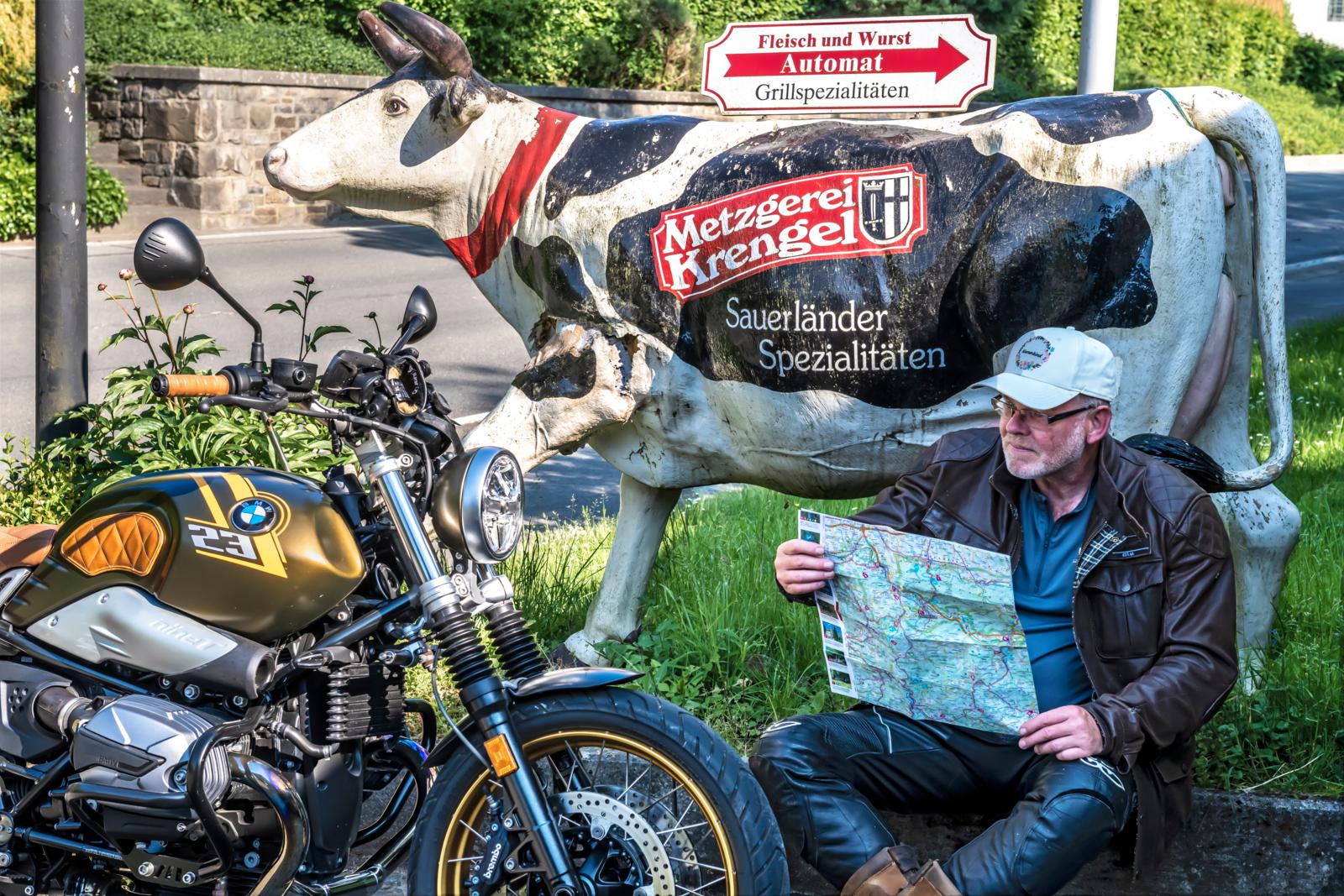 Nog iets vergeten? Juist, de ‘Bermudadriehoek van Sauerland’. Dus op naar de vrolijke, bochtige wegen. Deze dag rij ik samen met Uwe en zijn mooie BMW R nineT Scrambler, in Kalamata Metallic Matt en met gouden spaakwielen. Vanuit Arnsberg, niet over de Ochsenkopf die op weekenden en feestdagen voor ons gesloten is, maar vanuit Neheim langs het klooster Oelinghausen richting Holzen en Asbeck. In de berm de eerste, dubbele geleiderails als indicatie dat het hier ook hard kan gaan. Maar als je de bocht eenmaal verkeerd hebt aangesneden, schakel je over naar de ‘tufmodus’. Uwe: ‘Dat is een hoek die rust verdient’ – wat betekent dat deze in de GPX-track gewoon buiten beschouwing blijft. Via Herdringen rijden we in een rustig tempo we naar Albringen en slingeren omhoog naar Eisborn. Daar waar de schuttersfeestmuziek zich mengt met het gebrom van de uitlaatpijpen, waarschuwt een bord voor voetgangersverkeer met promillage.