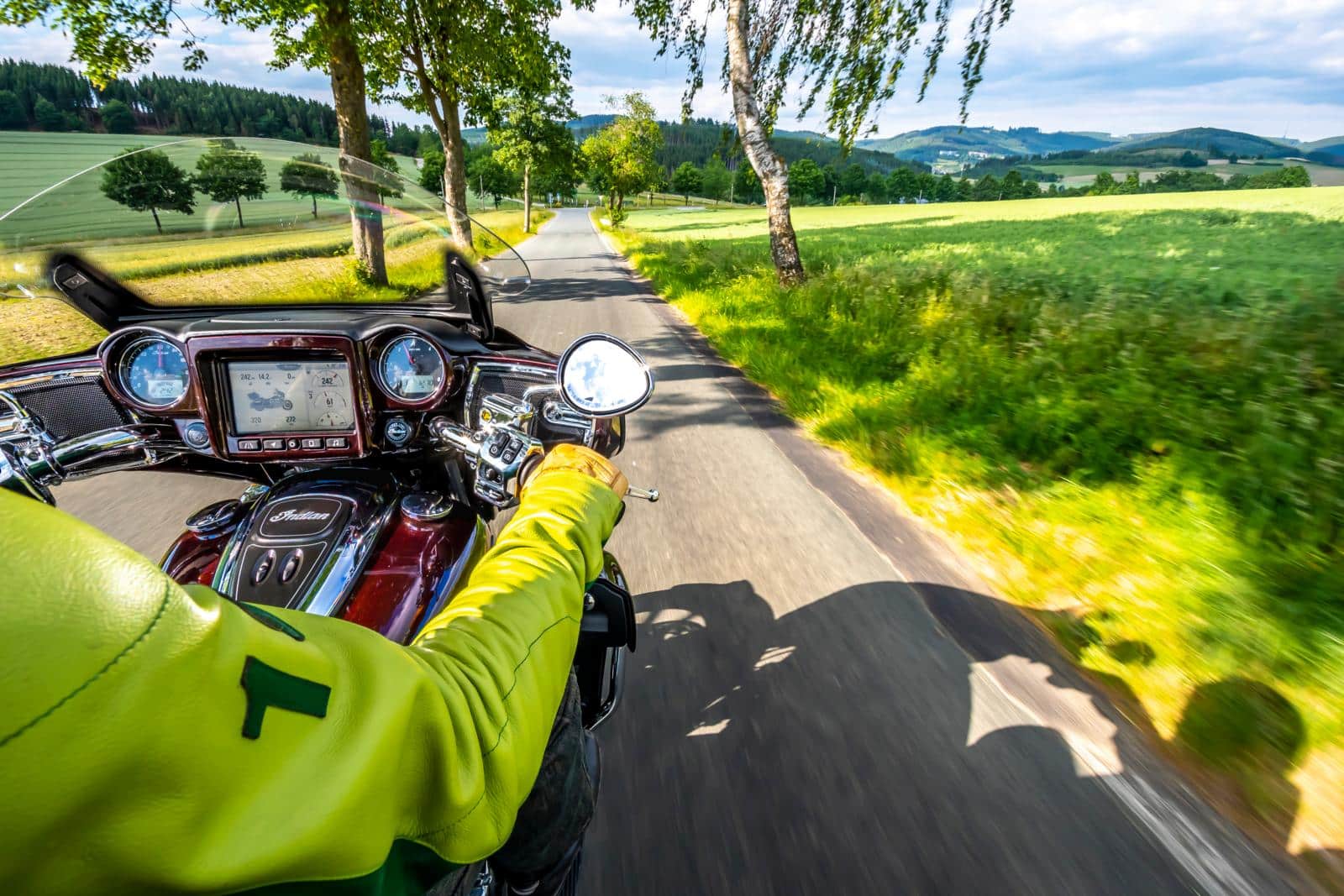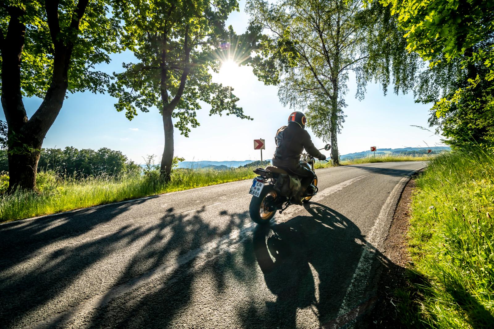 ‘Rondom de Sorpe ligt het Bermudadriehoek van Sauerland – daar verdwijnen de meeste rijbewijzen,’ grijnst Reinhard. Als eigenaar van het populaire landgasthuis ‘Zum Wilden Zimmermann’ in Hallenberg, dat geliefd is bij motorrijders, kent hij de scene door en door. Hij is mijn gids voor een rondje door het oostelijke deel van het Hochsauerland en trekt in plaats van zijn ‘boze’ KTM 1290 Super Adventure R de krachtige Indian Roadmaster Limited uit de garage. We verlaten het mooie vakwerkstadje, dat elke tien jaar het decor is voor Passiespelen, slaan van de B236 af naar Braunshausen en volgen de borden naar het Ruhewald. Plezierig slingert het smalle weggetje, nauwelijks breder dan de Indian, door het schaduwrijke groen, totdat het landschap opener en uitgestrekter wordt. De Medebacher Bucht, dat door het toeristenbureau wordt gepromoot als ‘Het Toscane van Sauerland’, is de regio met de meeste zonuren in Noordrijn-Westfalen. Het ligt in de regenschaduw van het 800 meter hoge Rothaar-gebergte, vandaar. Via Medelon, Glindfeld en Oberschledorn zigzaggen onze tweecilinders in ruime bochten door het zacht glooiende heuvellandschap. Maar van Düdinghausen naar Usseln rockt de route echt, waar we ‘de echte bergcircuits van Nuttlar naar Kallenhardt en van Meschede via de Stimmstamm naar Warstein vinden,’ zoals Reinhard onthult.