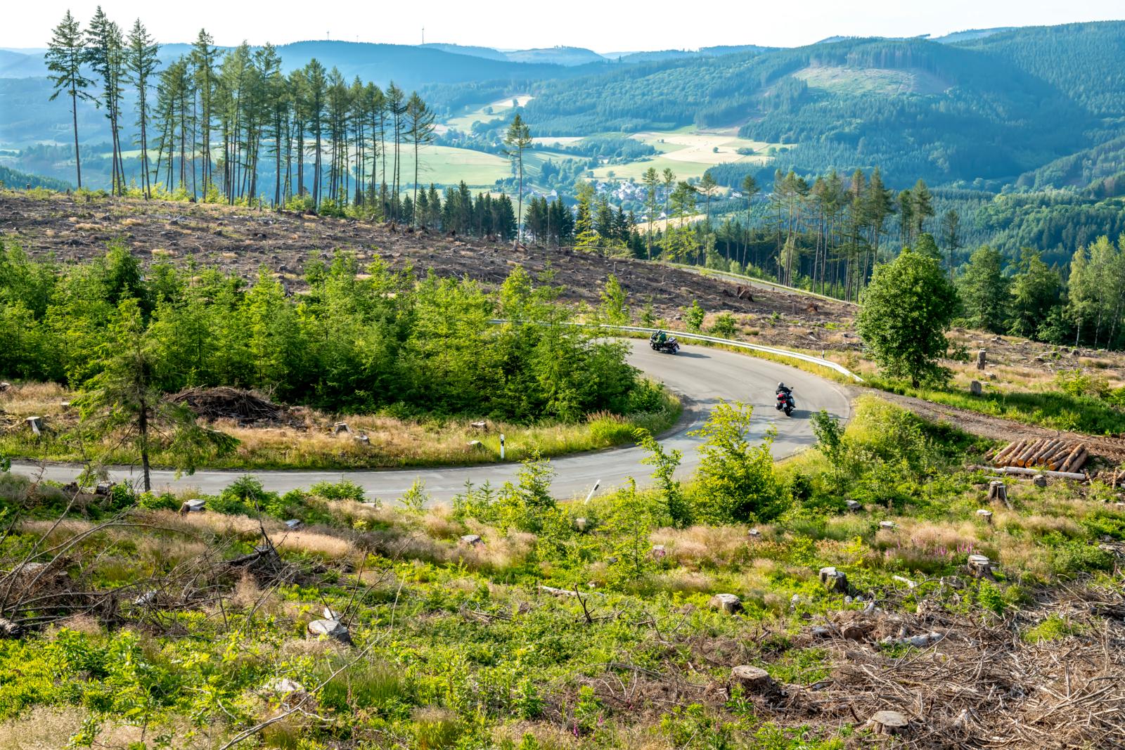 Mooi dat het geen zaterdag, zondag of feestdag is. Want dan zou de bochtige B236 van Oberkirchen omhoog naar Winterberg-Hoheley voor motoren gesloten zijn; legaal mag je daar op zulke dagen alleen naar beneden. Tja, beste knieschrapers, verder geen commentaar. Een omweg naar de Kahlen Asten – beslist niet het hoogste punt van Noordrijn-Westfalen, dat is de Langenberg bij Niedersfeld – en dan terug naar Hallenberg.