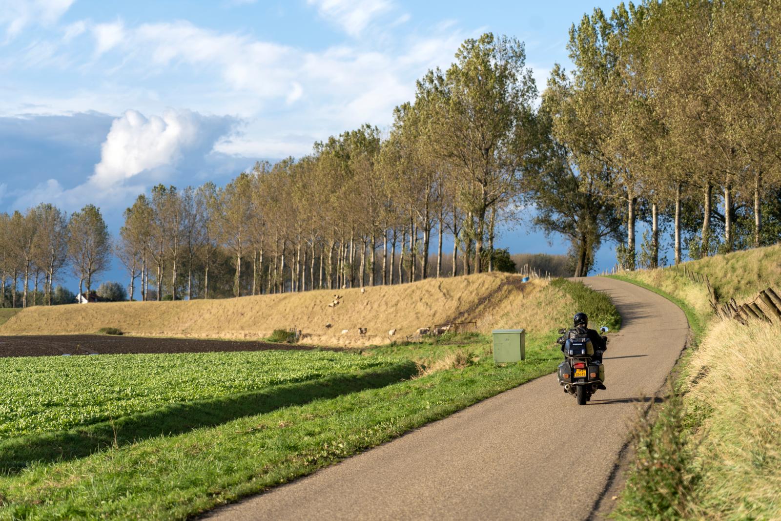 Bij het benzinestation in Zaamslag doen we een bakkie. Maar tanken doen we hier niet. Dat komt straks wel in België, zegt Levien. Over de Spuikreek rijden we de Sint Jansdijkweg van Schapenbout op. Die geeft een mooi uitzicht over de dakpannen. Vanaf de Fortweg West bij fort Sint Joseph schakelen we terug. We rammelen over de kasseien van de Waterhuisstraat en over de Hazelarenstraat verder over de Bontekoe. Da’s even wennen. Het wegdek trekt vreemd aan het stuur, een ervaring die we op asfalt zelden of nooit beleven. Het asfalt van de Provinciale Weg brengt ons naar de Ronduitweg, die overgaat in de Koninkjesdijk. In het open land voelen we ons inderdaad als ‘n koning te rijk.