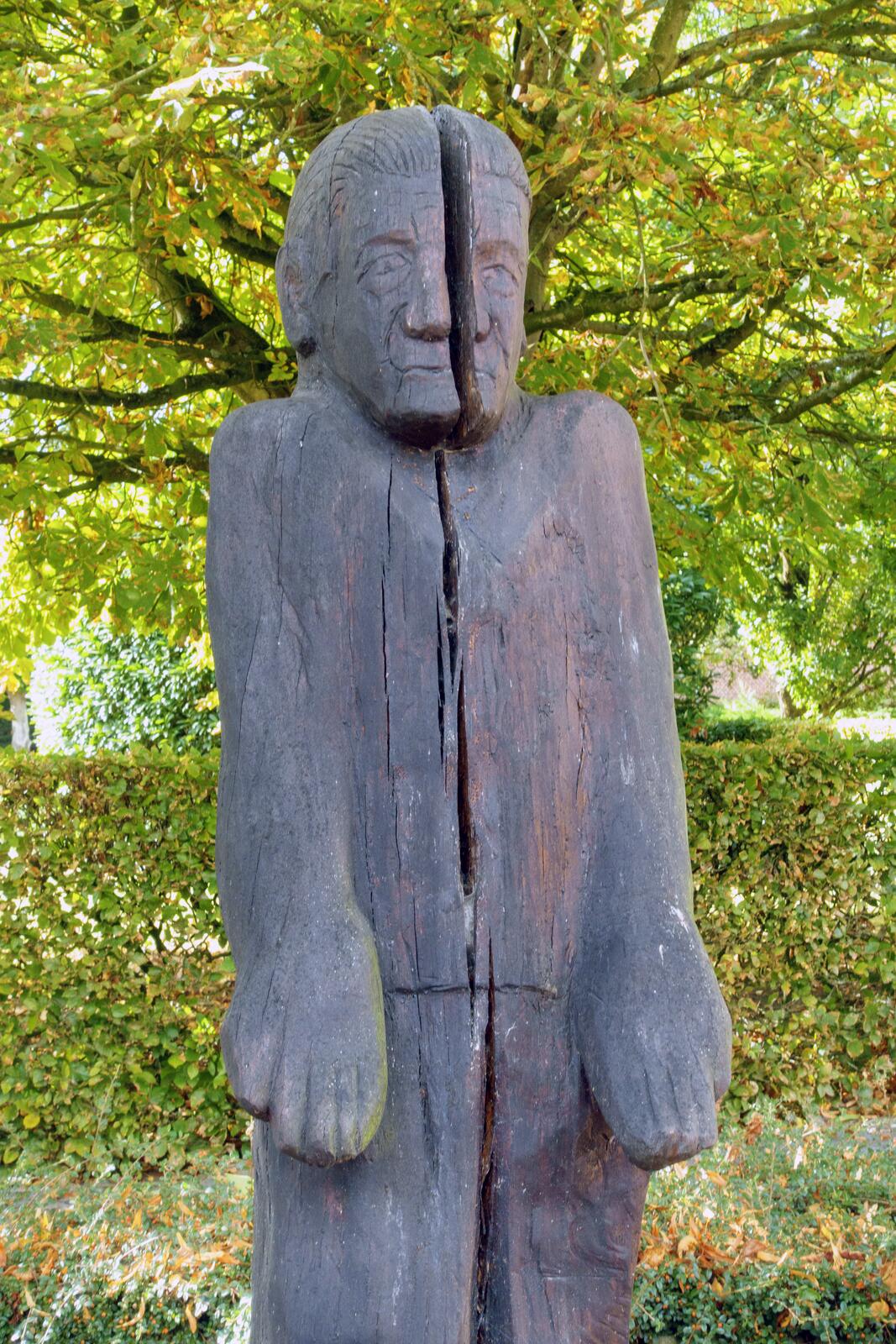 Verderop staat langs de weg een beeld van een gespleten mannetje. We zien er een symbool in van een fietser die over kasseien heeft gestoempt. Op de motor hebben lange veerwegen een voordeel, wielrenners moeten het met heel wat minder comfort doen.