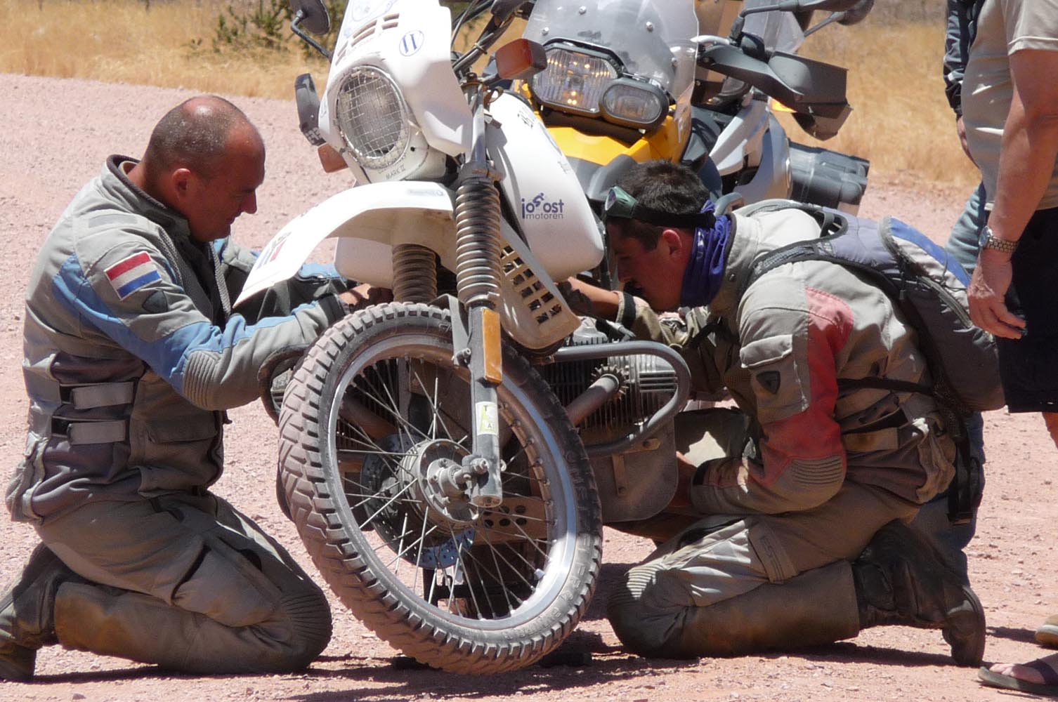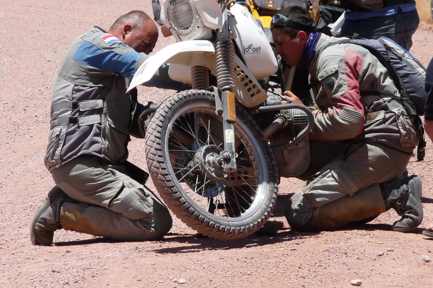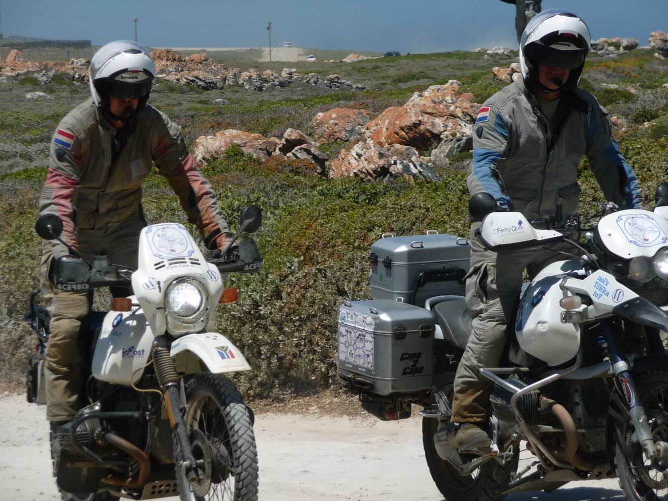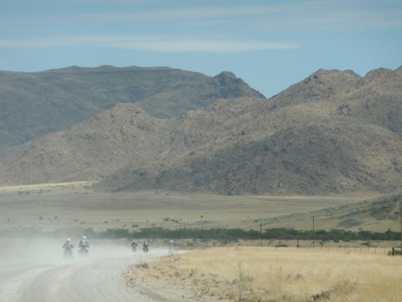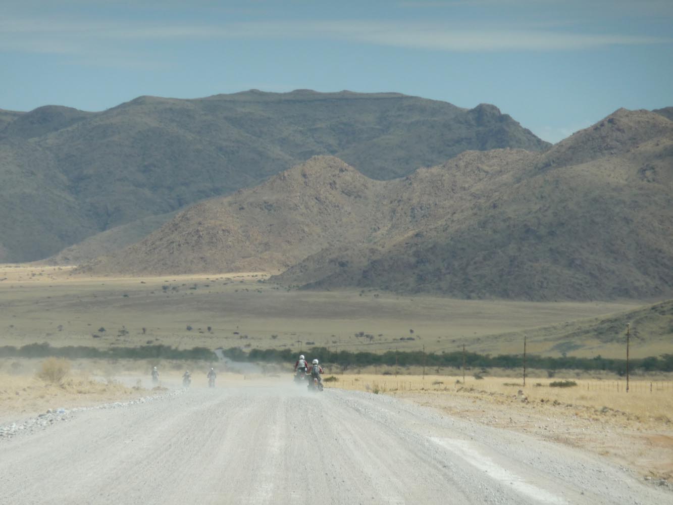Zwaar zijn de honderden kilometers over gravel (in het Afrikaans ‘grondpadjies’). Zand, zand en nog eens zand, afgewisseld met rotsen en soms een lastige bergpas. Af en toe een verdwaalde antilope of een groepje struisvogels. Ook hier komen de trainingen weer goed van pas. ‘Iets waar je in Nederland of waar dan ook in Europa niet op kunt oefenen, is rijden op een combinatie van gravel met zand, waarbij het woestijnzand in de lengterichting de sporen in het gravel vult. Dan moet je soms tientallen minuten achter elkaar op de voetsteunen staan, met je kont naar achteren om het gewicht goed te verdelen, anders ga je keihard op je bek. We zijn daar niet een keer gevallen en onze meerijders ook niet.’