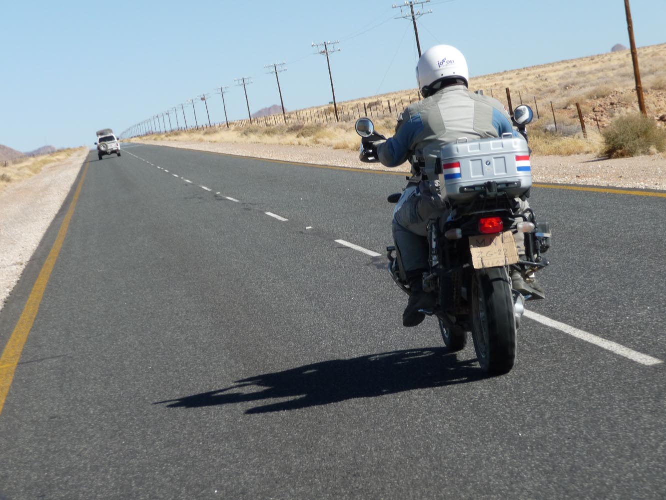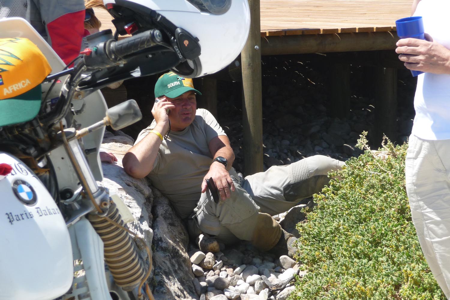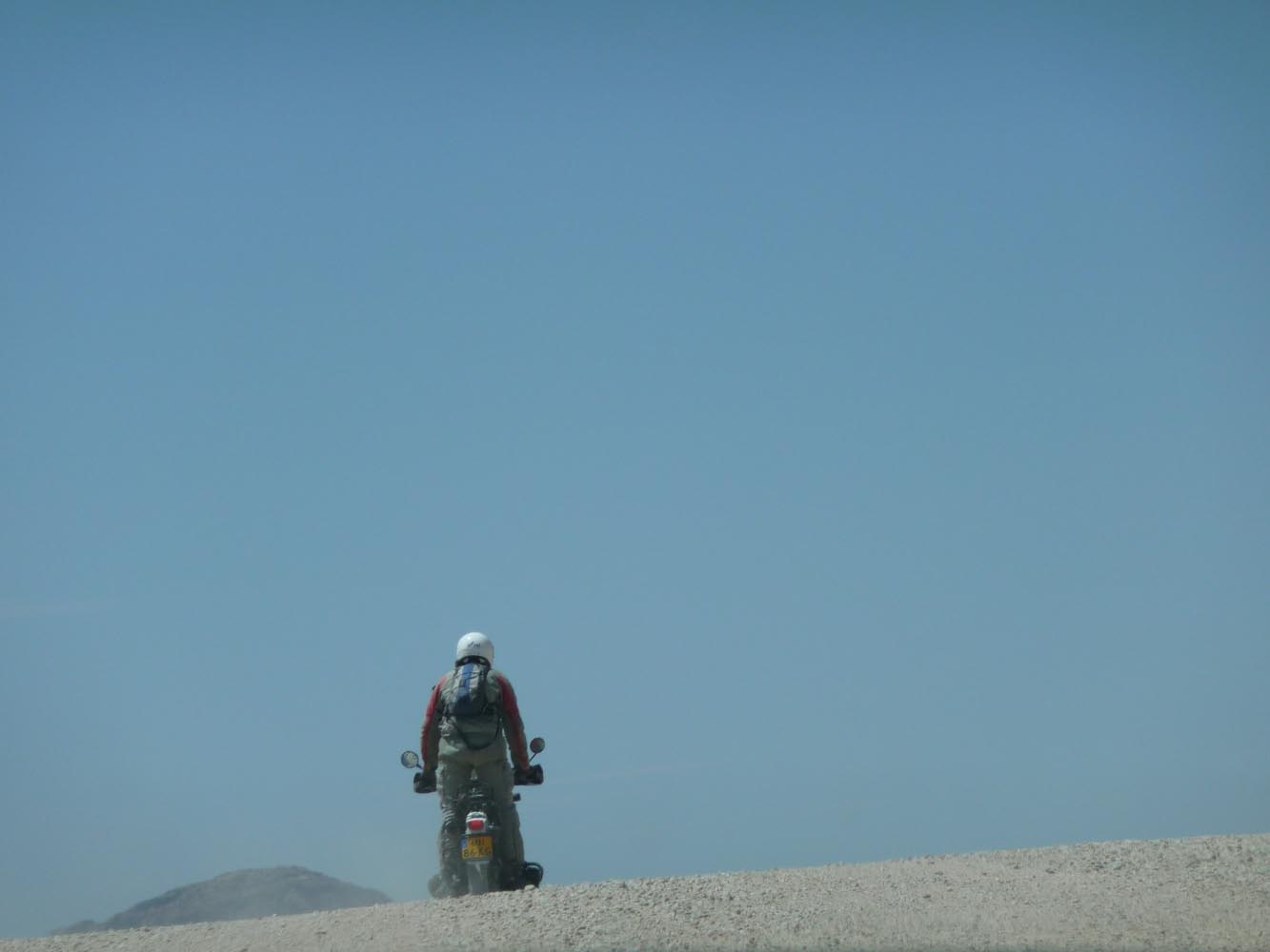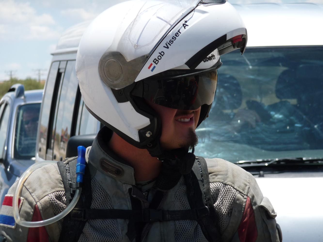 Zwaar zijn de honderden kilometers over gravel (in het Afrikaans ‘grondpadjies’). Zand, zand en nog eens zand, afgewisseld met rotsen en soms een lastige bergpas. Af en toe een verdwaalde antilope of een groepje struisvogels. Ook hier komen de trainingen weer goed van pas. ‘Iets waar je in Nederland of waar dan ook in Europa niet op kunt oefenen, is rijden op een combinatie van gravel met zand, waarbij het woestijnzand in de lengterichting de sporen in het gravel vult. Dan moet je soms tientallen minuten achter elkaar op de voetsteunen staan, met je kont naar achteren om het gewicht goed te verdelen, anders ga je keihard op je bek. We zijn daar niet een keer gevallen en onze meerijders ook niet.’