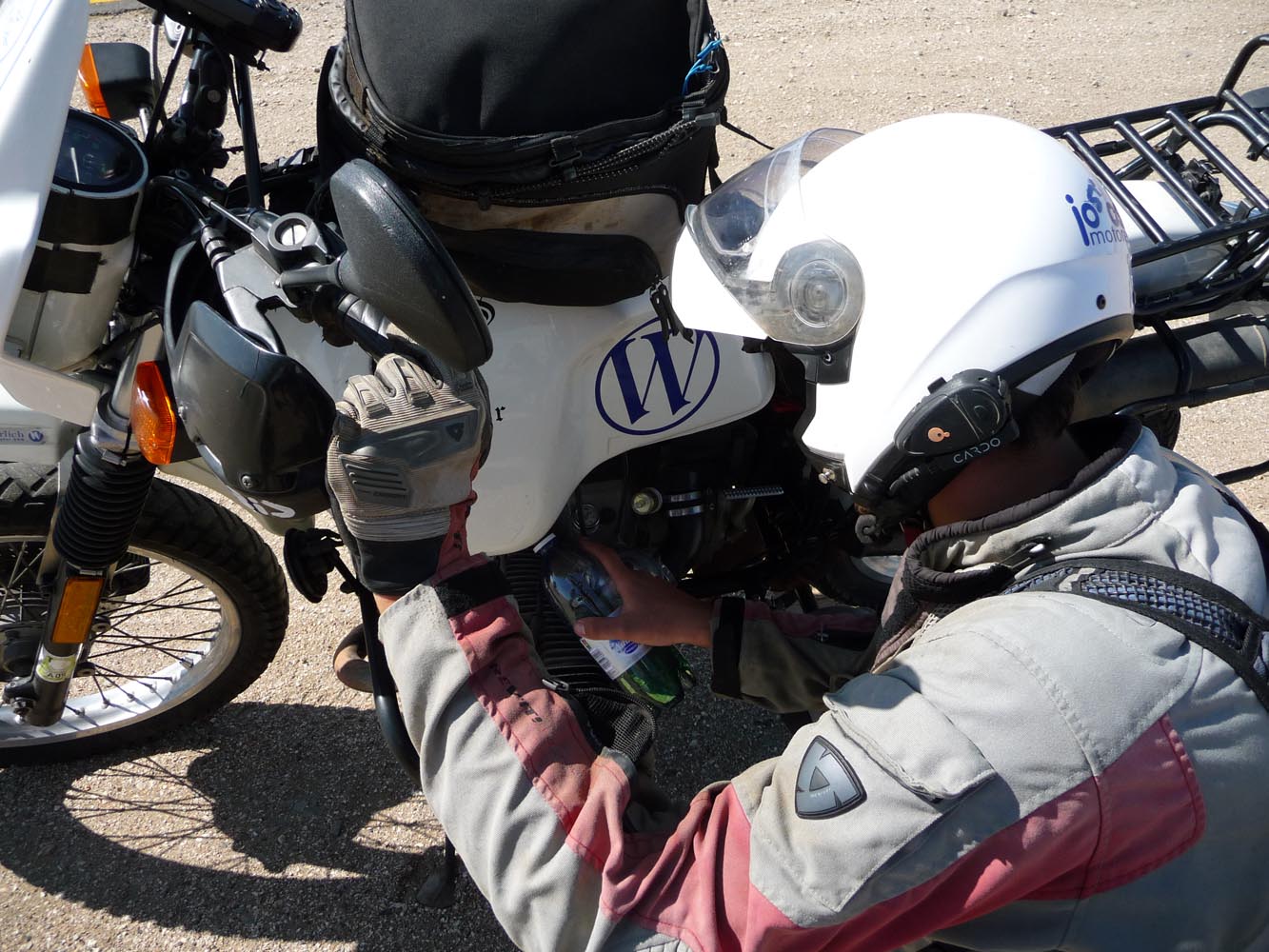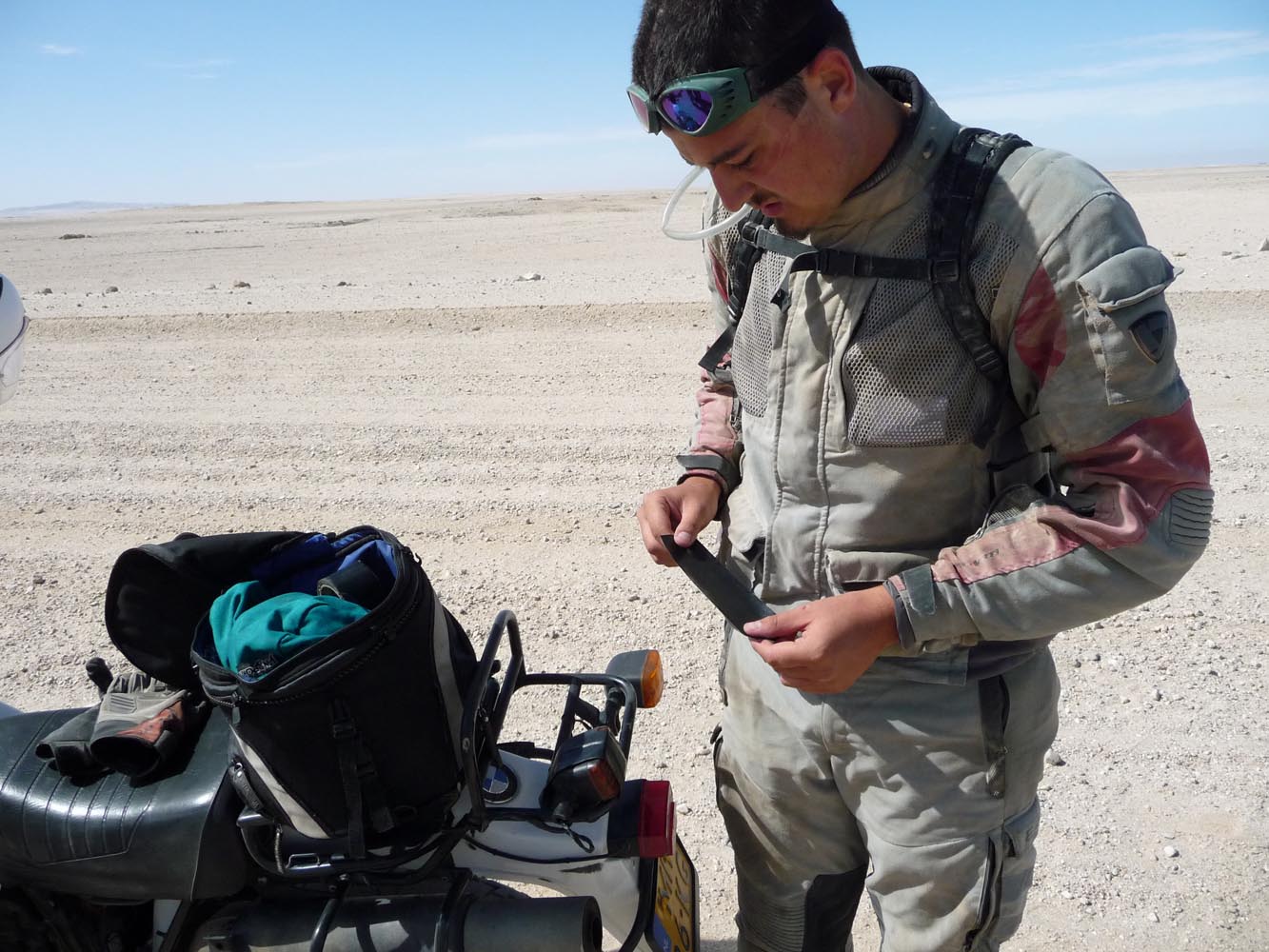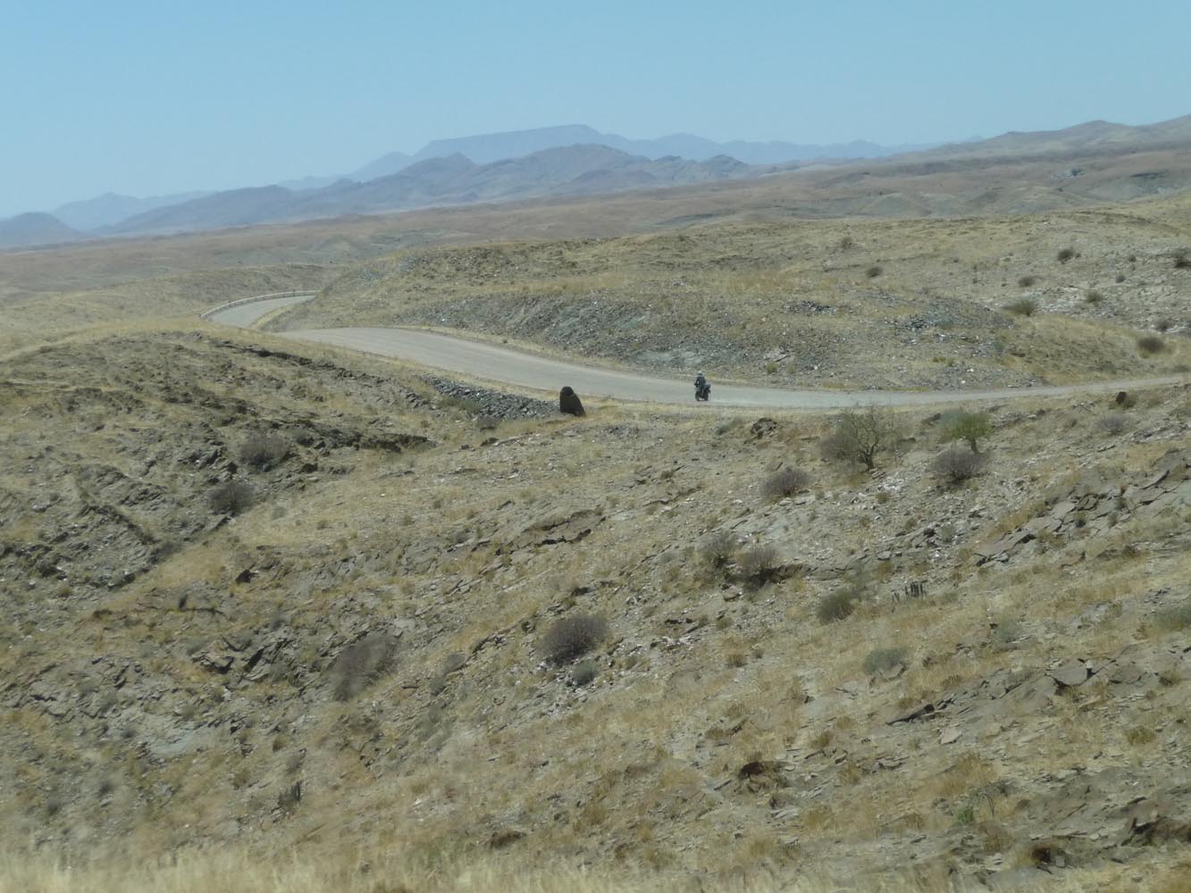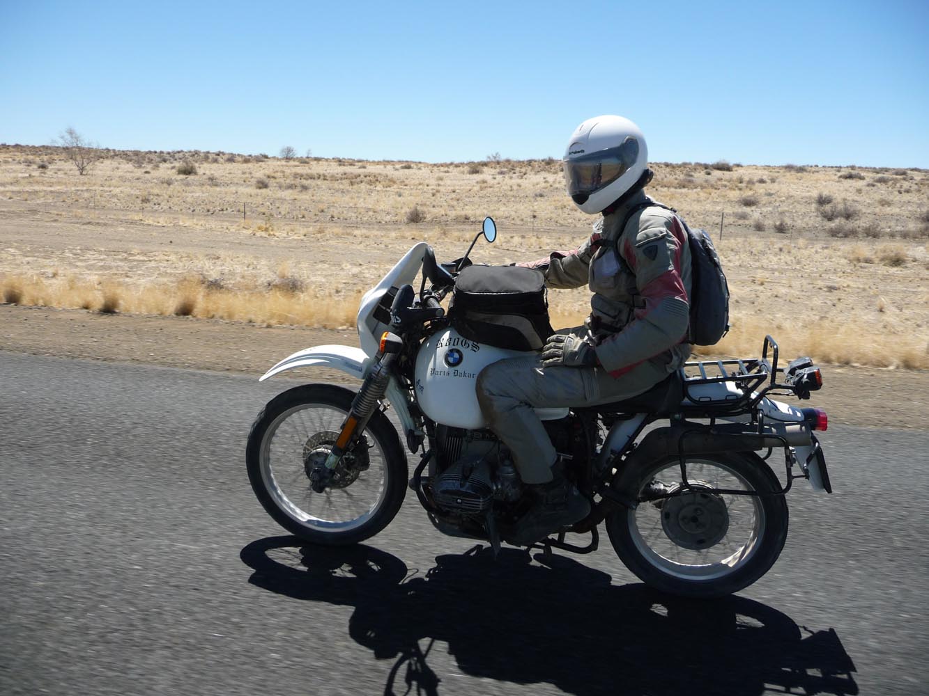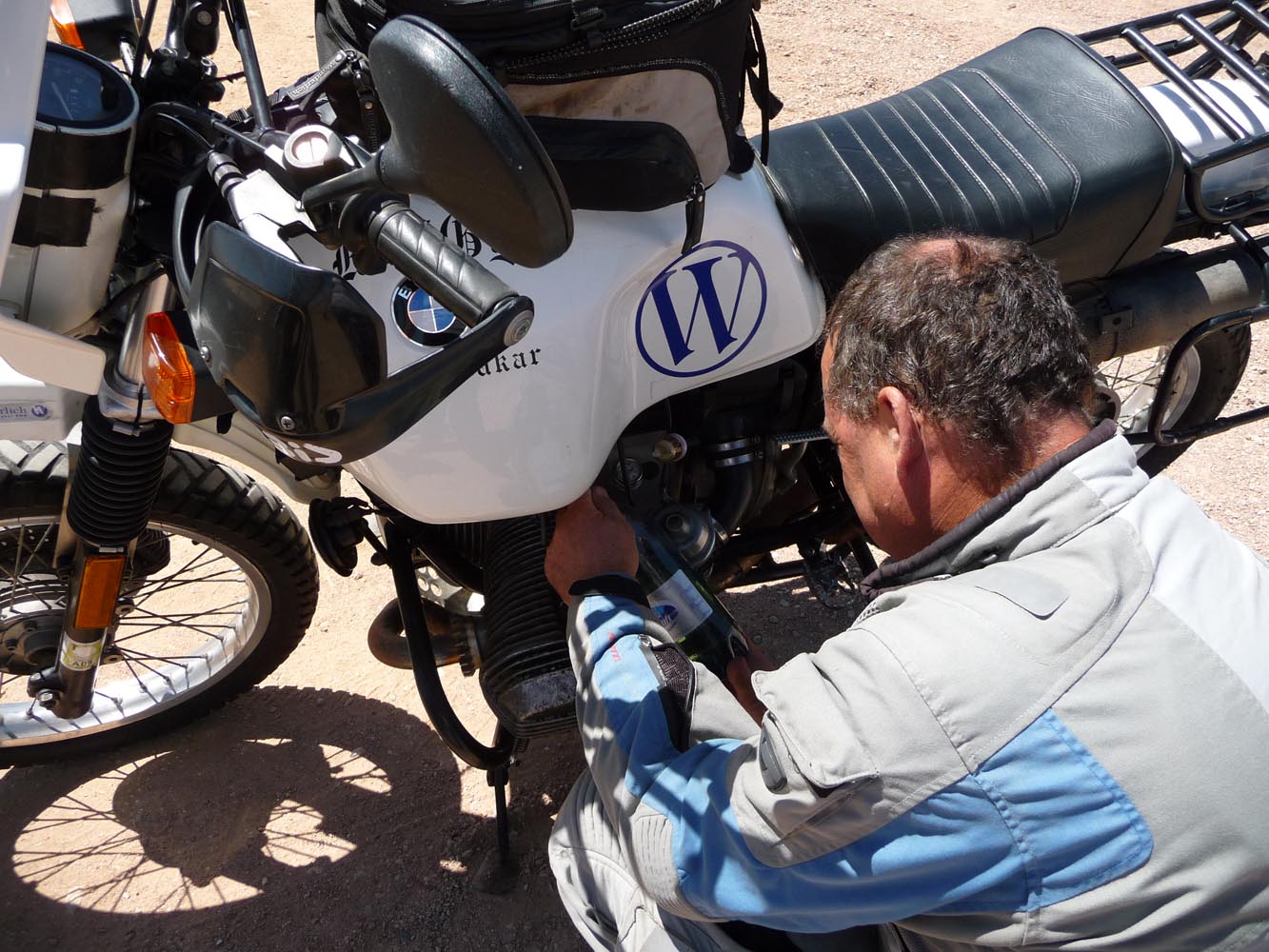Zwaar zijn de honderden kilometers over gravel (in het Afrikaans ‘grondpadjies’). Zand, zand en nog eens zand, afgewisseld met rotsen en soms een lastige bergpas. Af en toe een verdwaalde antilope of een groepje struisvogels. Ook hier komen de trainingen weer goed van pas. ‘Iets waar je in Nederland of waar dan ook in Europa niet op kunt oefenen, is rijden op een combinatie van gravel met zand, waarbij het woestijnzand in de lengterichting de sporen in het gravel vult. Dan moet je soms tientallen minuten achter elkaar op de voetsteunen staan, met je kont naar achteren om het gewicht goed te verdelen, anders ga je keihard op je bek. We zijn daar niet een keer gevallen en onze meerijders ook niet.’