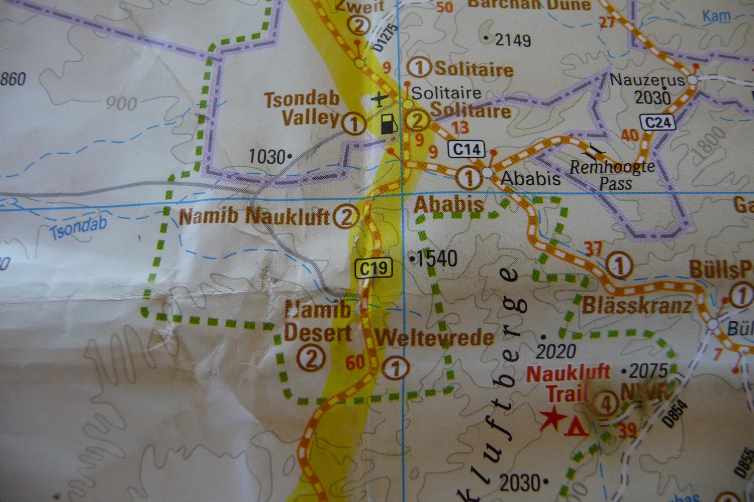 Hoogtepunten in Namibië zijn de Sossusvlei, de Maltahöhe (waar Bob’s fiets door de plaatselijke smid nog eens een keertje stevig gelast wordt) en Solitaire.