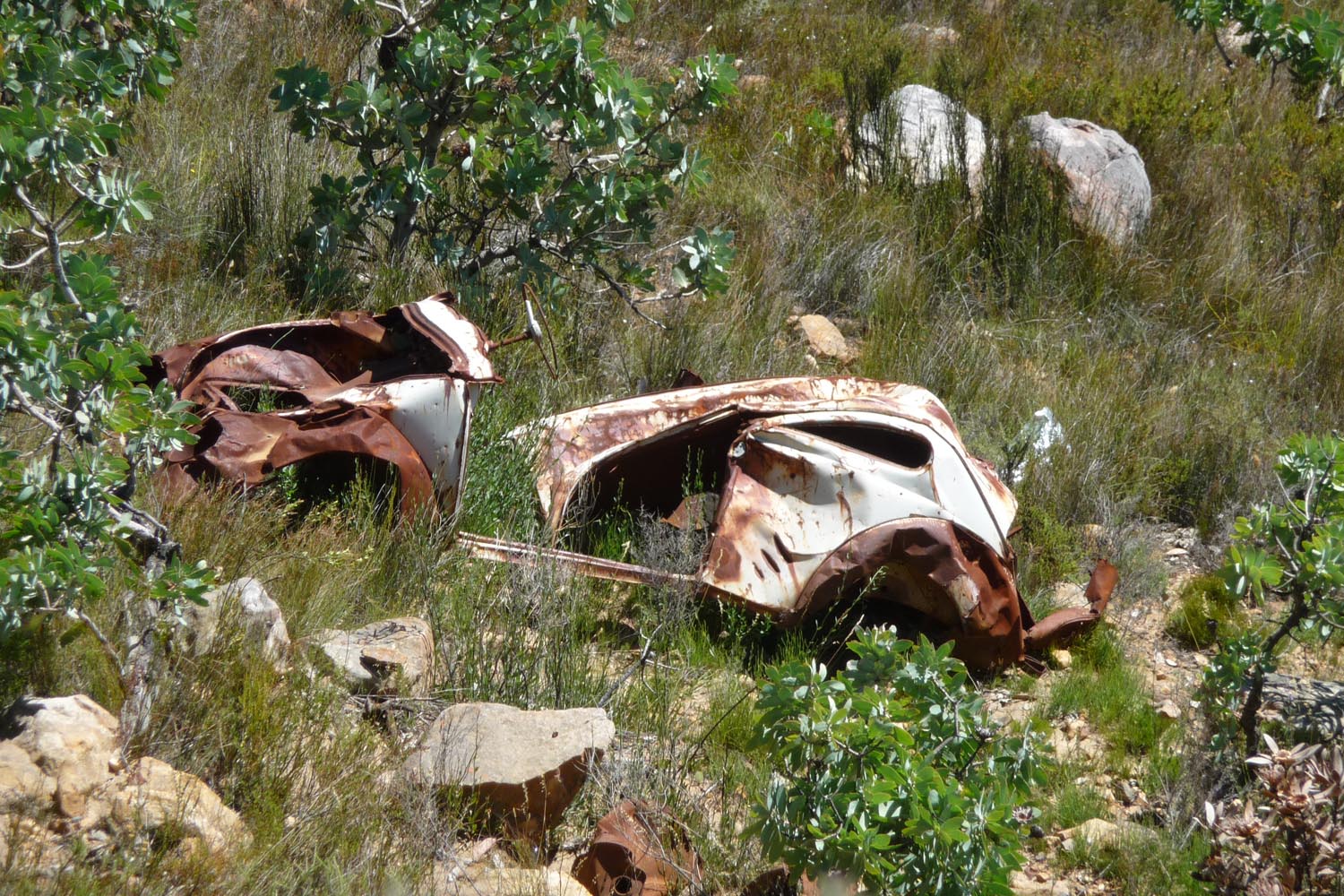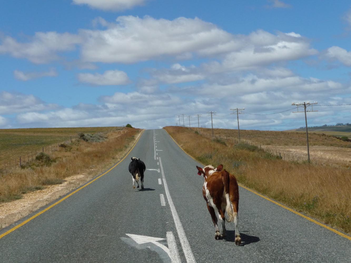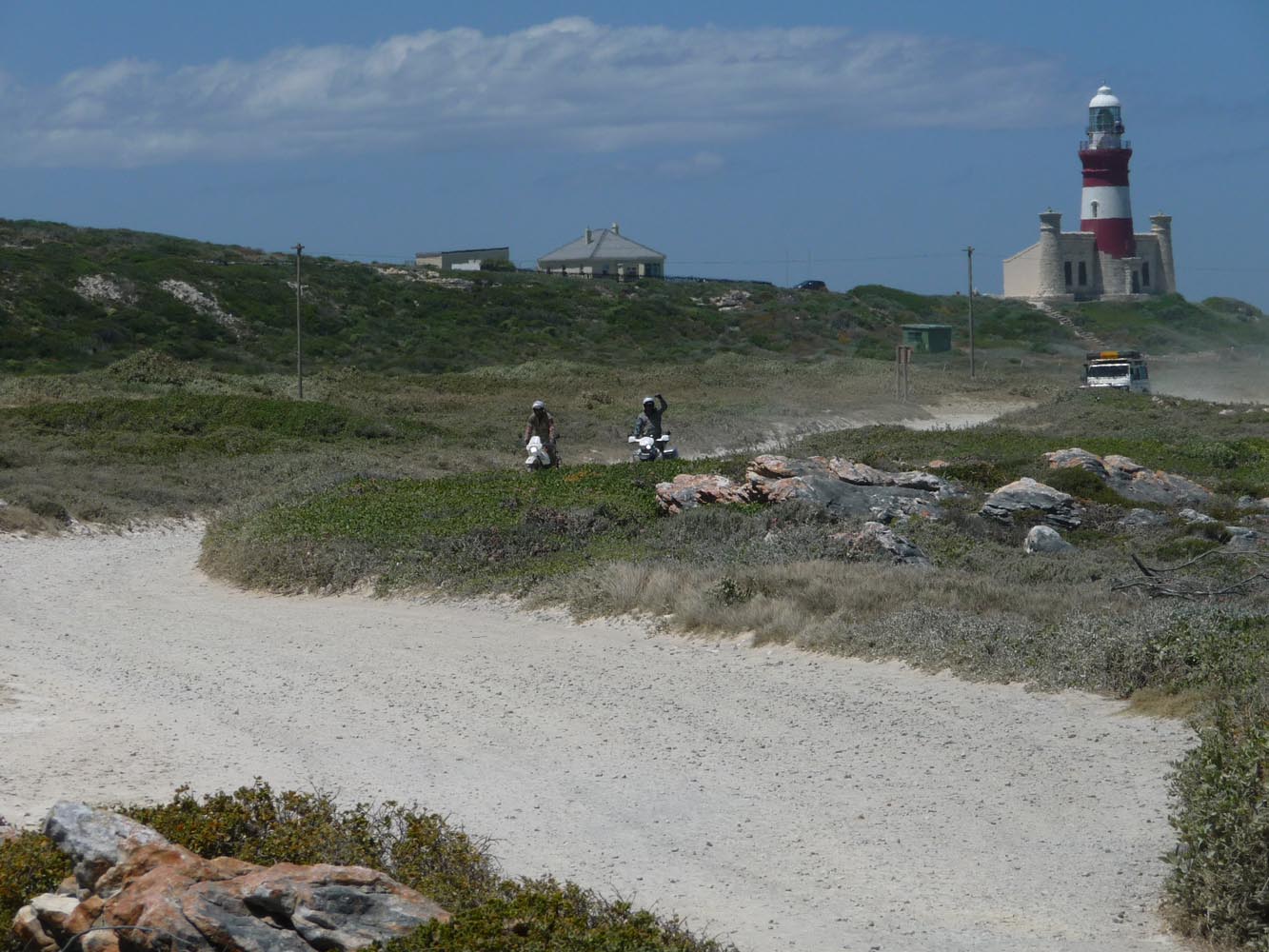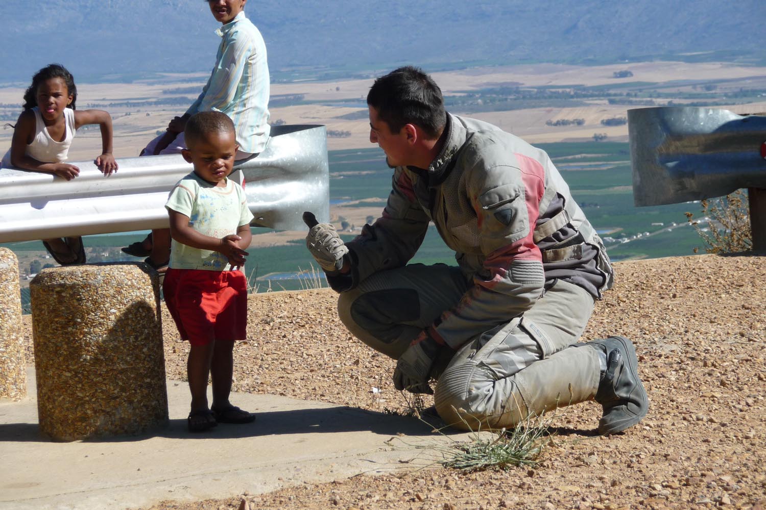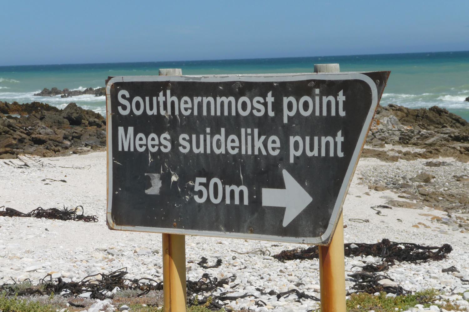 Op 18 december steekt het duo bij de grensplaatsen Noordoewer en Viljoensdrift de grensrivier met het 27ste land over: Zuid-Afrika is bereikt. ‘Je ziet direct het verschil tussen het woeste Namibië en het meer gecultiveerde Zuid-Afrika. Vooral toen we de wijnstreek van de Western Cape binnen reden,’ aldus Nol. ‘Hier verandert het grijsrode Namibische zand in het groen van de Zuid-Afrikaanse wijngaarden.’ Via Citruskop en Ceres gaat het naar Swellendam, waar Nol van eerdere motortripjes een Bed and Breakfast kent, en waar de groep een kamp opslaat voor de laatste etappe naar de Zuidkaap.