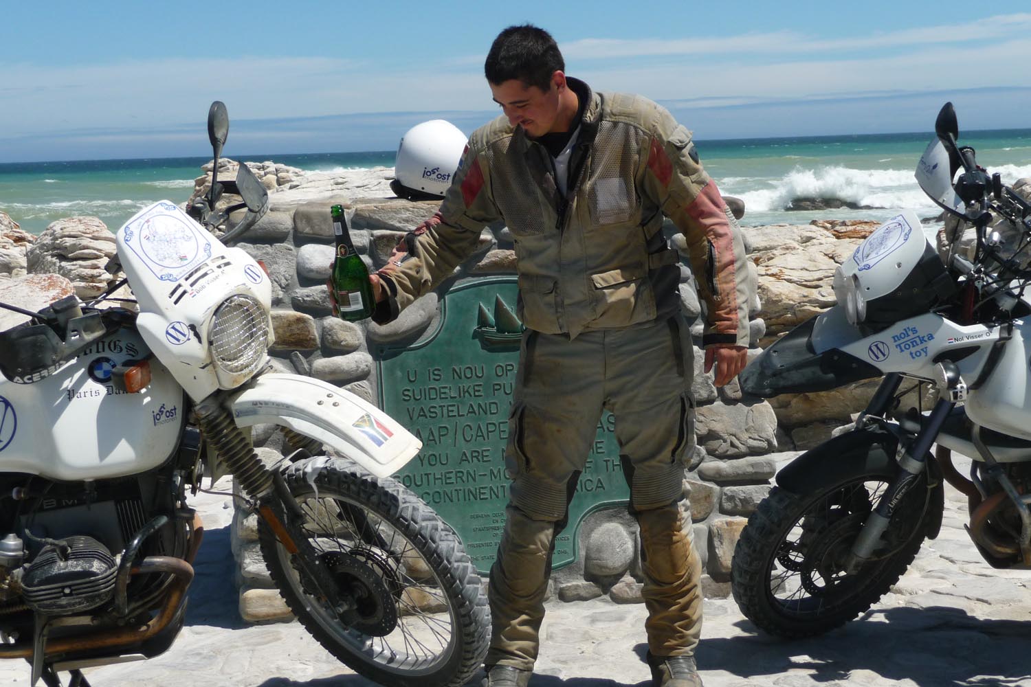 Met de vlaggen van Nederland en Zuid-Afrika in de hand stuurden ze hun BMW’s over de stenen van Kaap Agulhas, het zuidelijkste puntje van het Afrikaanse continent. De banden, al zoveel geteisterd op de slecht geplaveide wegen van Afrika, kregen het nog één keer voor hun kiezen op die laatste emotionele meters. Vier maanden van zware ontberingen zaten erop. In de gierende wind stond echtgenote en moeder Wilma haar helden op de Zuidkaap op te wachten. Enkele leden van de Skyriders (de club van motorrijdende KLM ‘ers) waren vanaf Windhoek in Namibië meegereisd en ontkurkten de vonkelwijn. Toevallig aanwezige vakantiegangers applaudisseerden. Camera’s snorden en klikten. Vader en zoon Visser hadden hun ultieme droom waargemaakt. Op de motor van de Noord- naar de Zuidkaap.