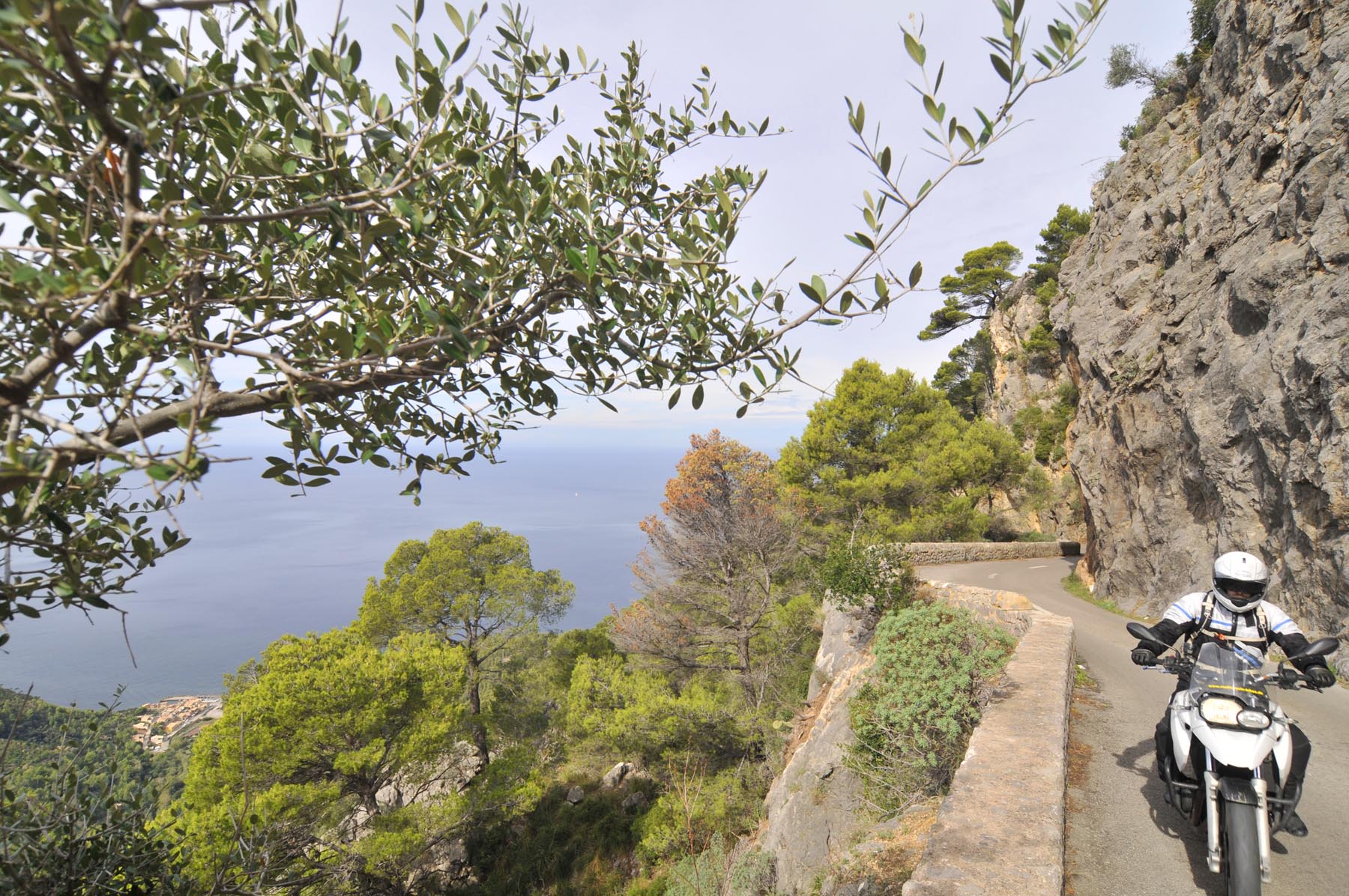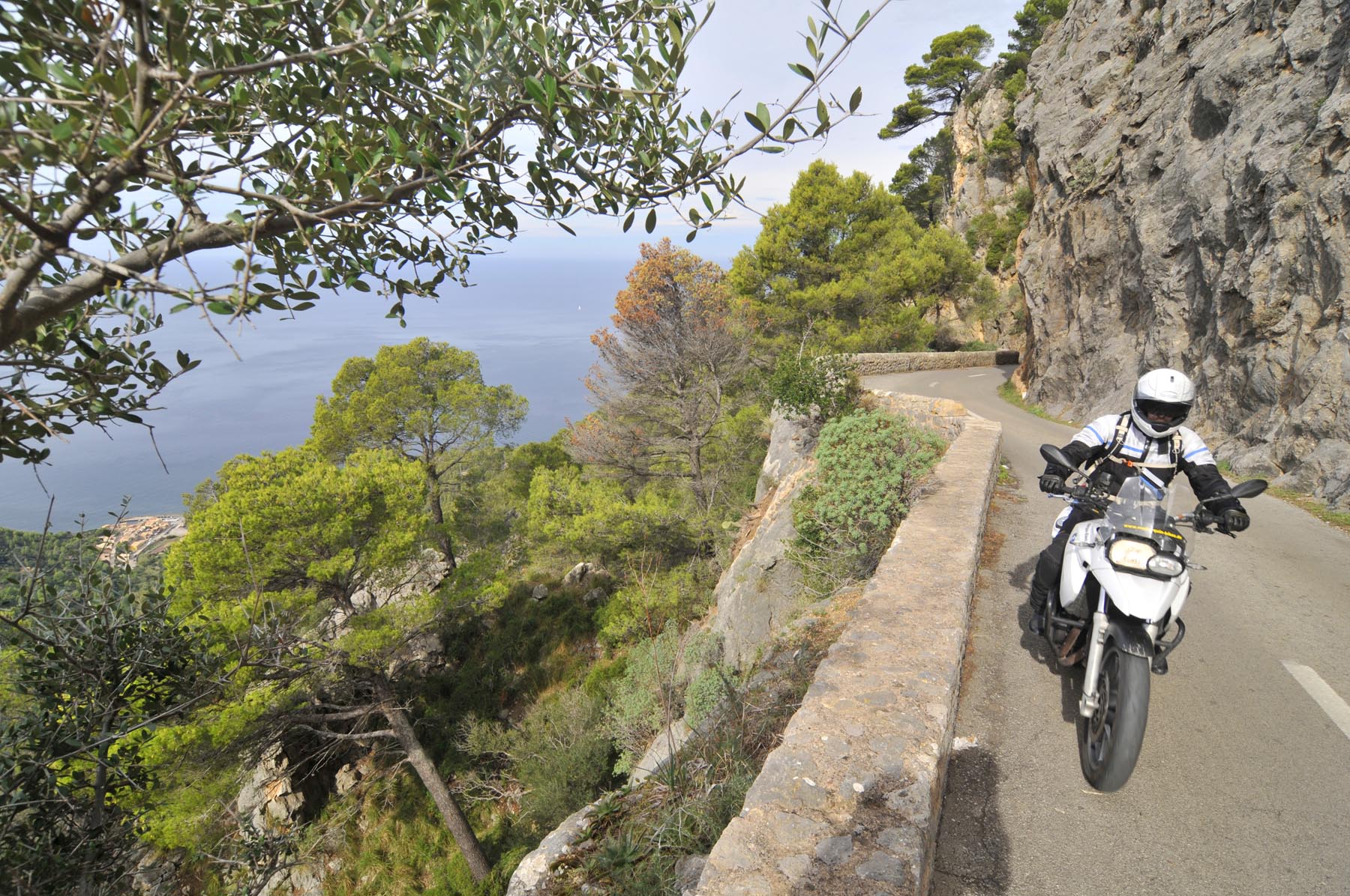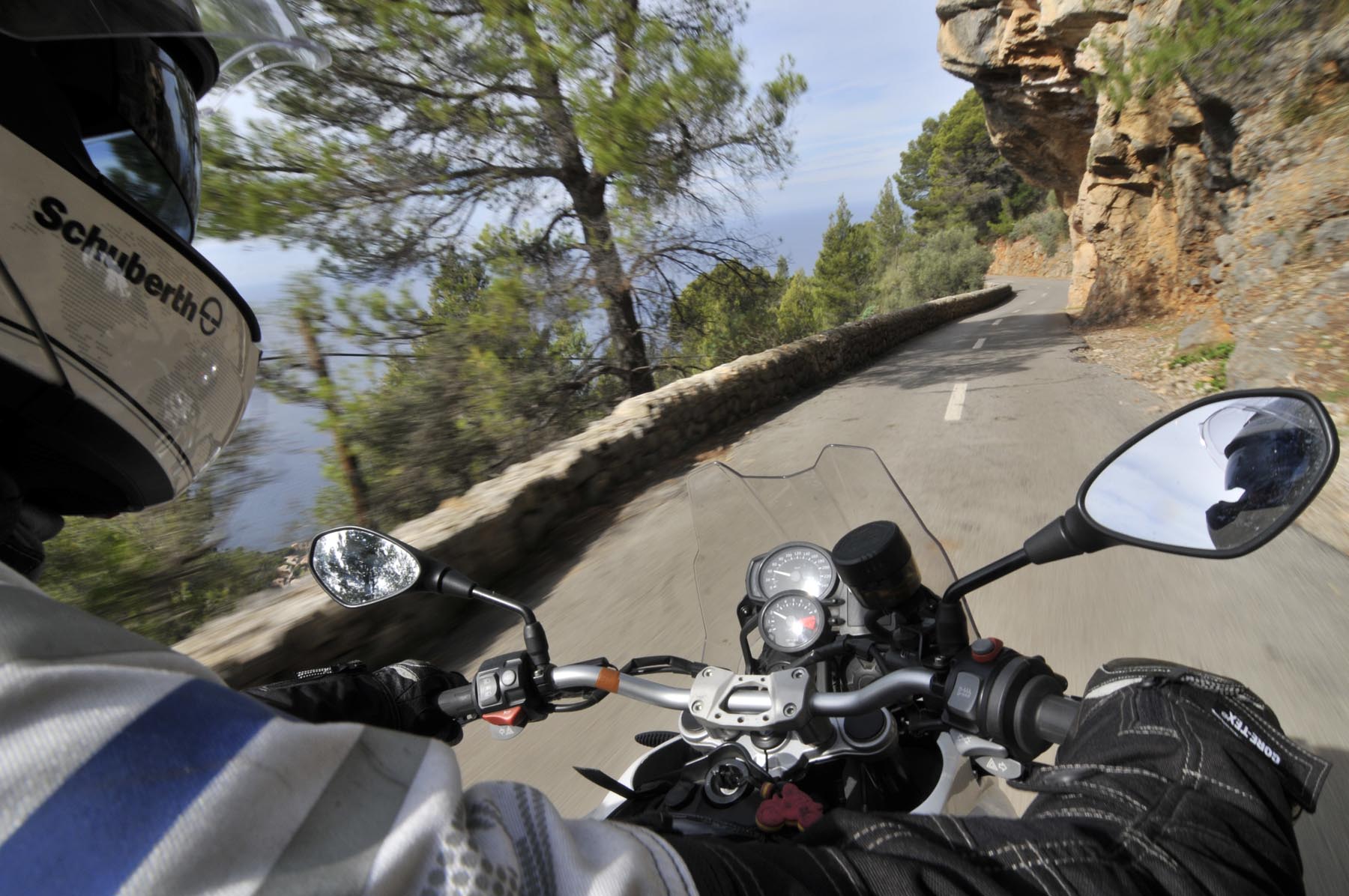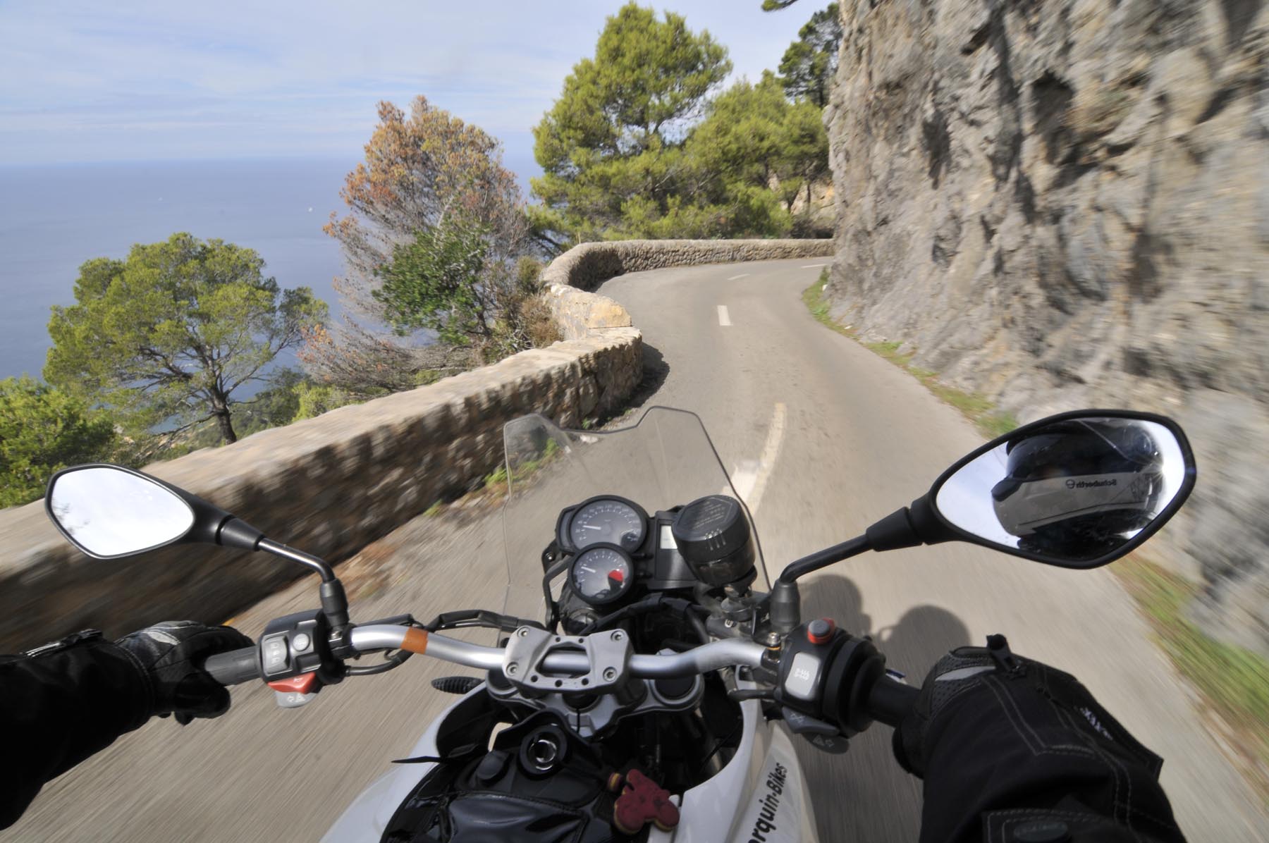Donderdag. “Ben je daar nog niet geweest. Het doet mij steeds denken aan de uit de rotsen gebombardeerde wegen van de Dolomieten. Jij gaat daar helemaal uit je dak!” Het lukt Johannes steeds weer om de zin naar nieuwe avonturen aan te wakkeren. Een S 1000 RR geschikte route van Porreres naar Lucmajor, met meteen drie kloosters op een berg bij Randa, ergens tegen de middag Valdemossa. Heel fijn dat bussen en campers niet uit hun dak mogen gaan, zodat het komende pleziertje, de zes kilometer lange, steile en krappe afdaling naar het kleine Port de Valdemossa een beetje exclusief blijft. Net zo intensief en beduidend langer dan een quicky, is de vervolgroute op de Ma-10, hoog boven de kust aan de zijde van de Serra de Tramuntana, zo’n beetje de Kamawegensutra van Mallorca. Slagroom-asfalt net voor Andratx duwt de adrenalinespiegel verder omhoog. Nog niet opgebrand rubber verdwijnt hierin zoals witte lichamen op het naaktstrand van Platje El Mango.