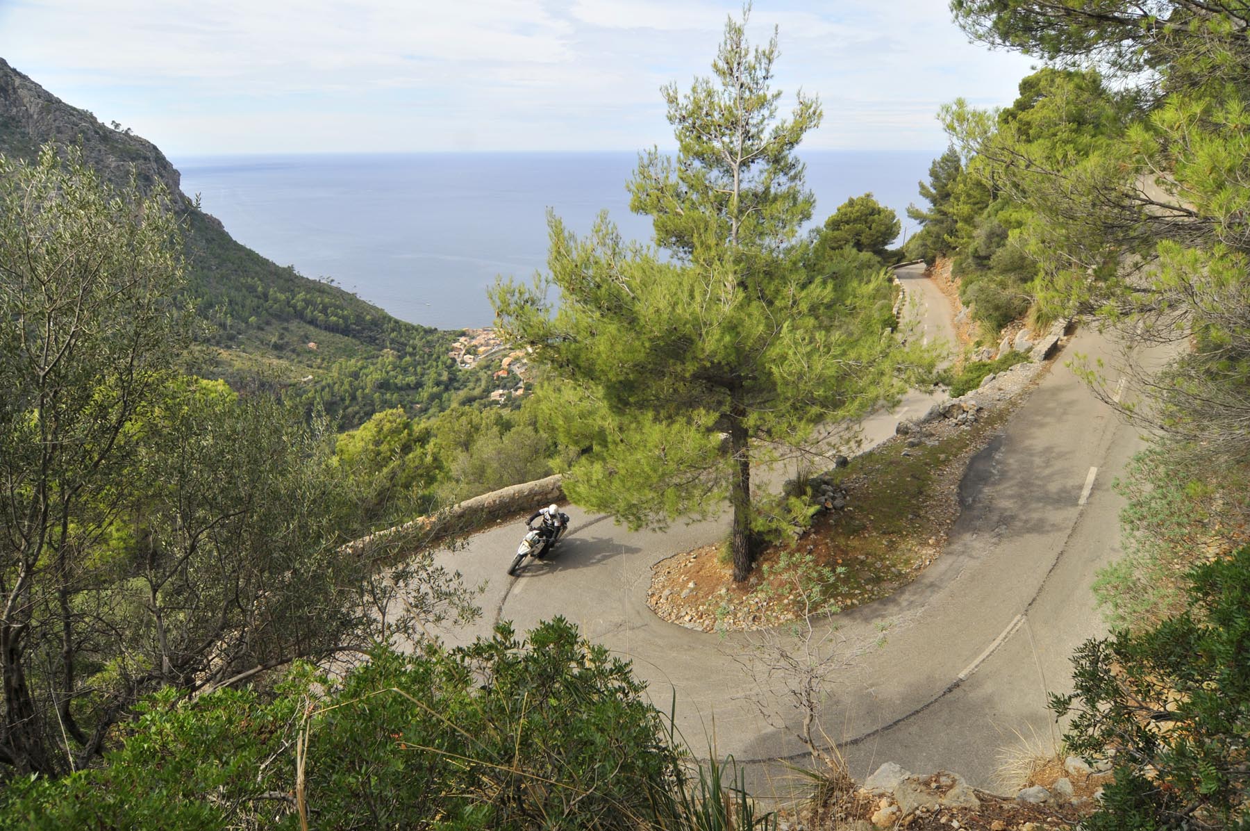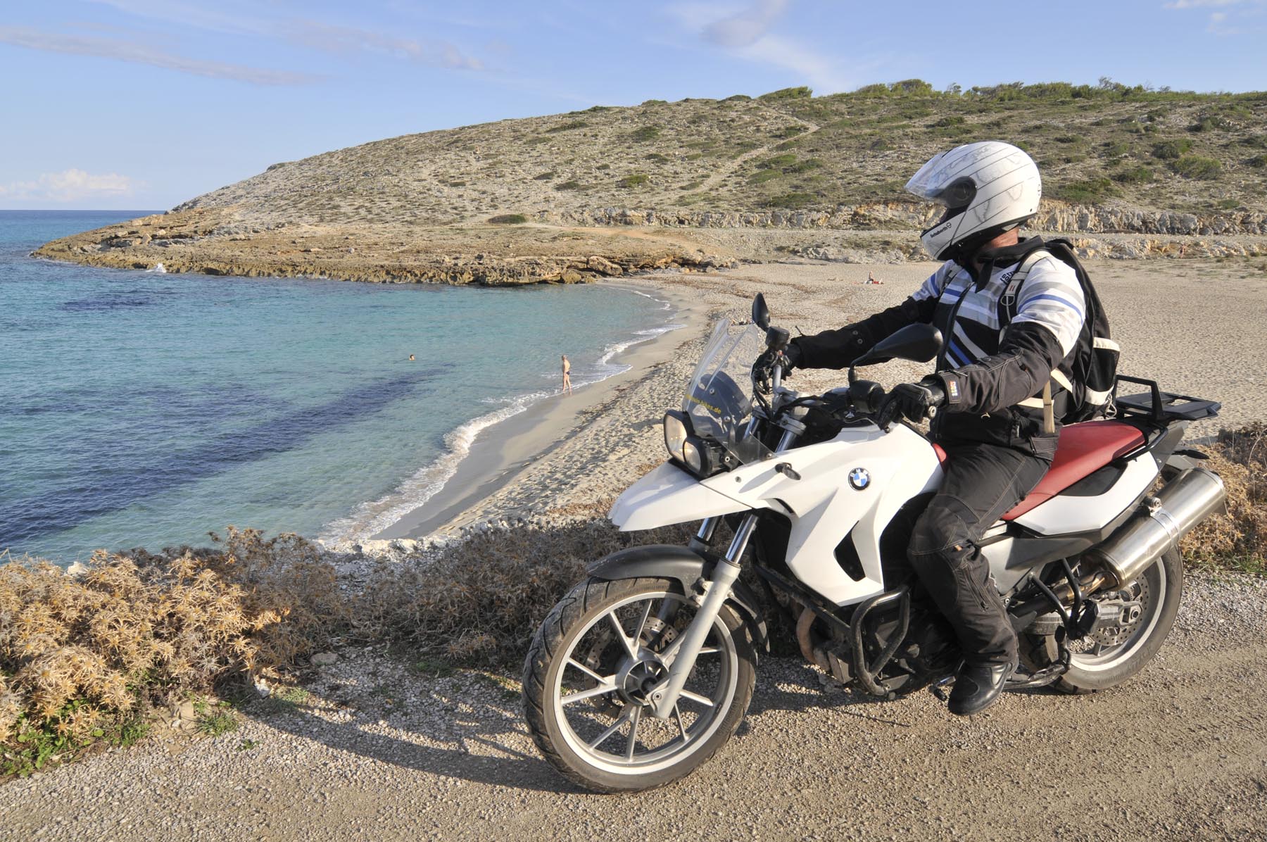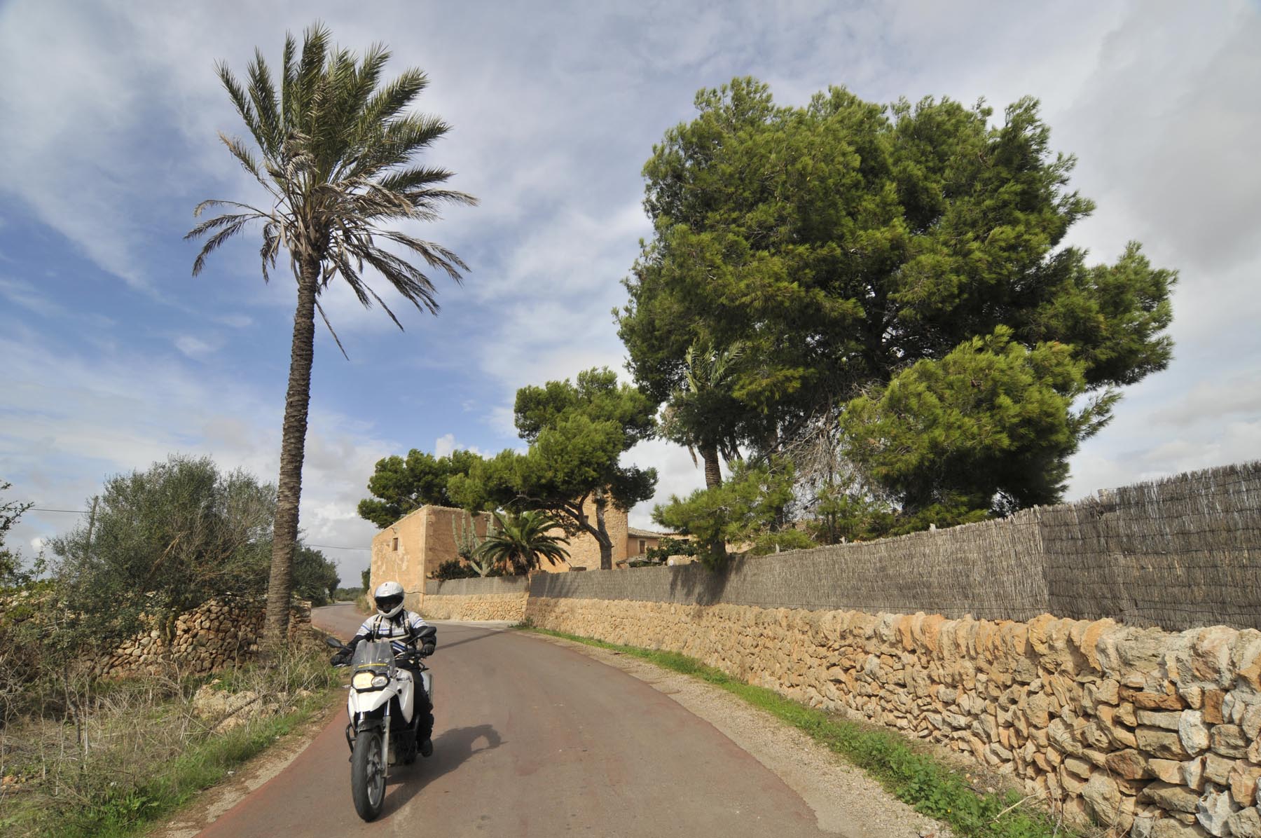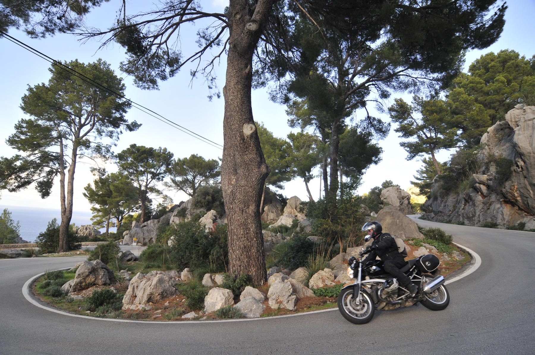 Donderdag. “Ben je daar nog niet geweest. Het doet mij steeds denken aan de uit de rotsen gebombardeerde wegen van de Dolomieten. Jij gaat daar helemaal uit je dak!” Het lukt Johannes steeds weer om de zin naar nieuwe avonturen aan te wakkeren. Een S 1000 RR geschikte route van Porreres naar Lucmajor, met meteen drie kloosters op een berg bij Randa, ergens tegen de middag Valdemossa. Heel fijn dat bussen en campers niet uit hun dak mogen gaan, zodat het komende pleziertje, de zes kilometer lange, steile en krappe afdaling naar het kleine Port de Valdemossa een beetje exclusief blijft. Net zo intensief en beduidend langer dan een quicky, is de vervolgroute op de Ma-10, hoog boven de kust aan de zijde van de Serra de Tramuntana, zo’n beetje de Kamawegensutra van Mallorca. Slagroom-asfalt net voor Andratx duwt de adrenalinespiegel verder omhoog. Nog niet opgebrand rubber verdwijnt hierin zoals witte lichamen op het naaktstrand van Platje El Mango.