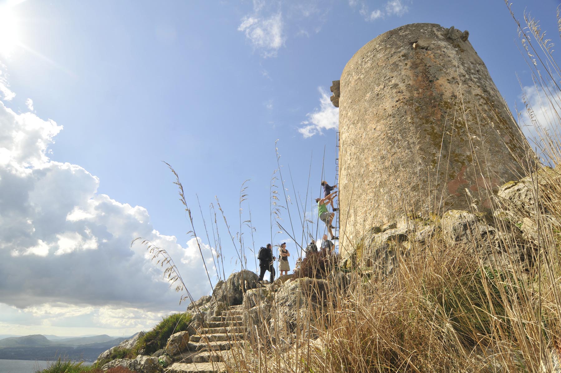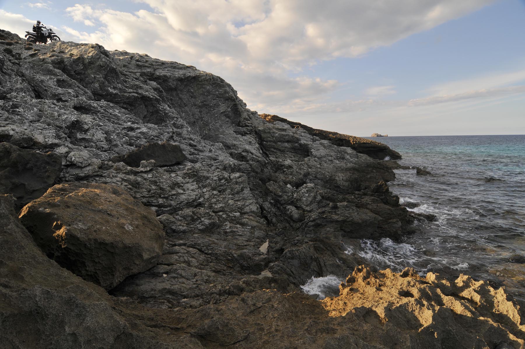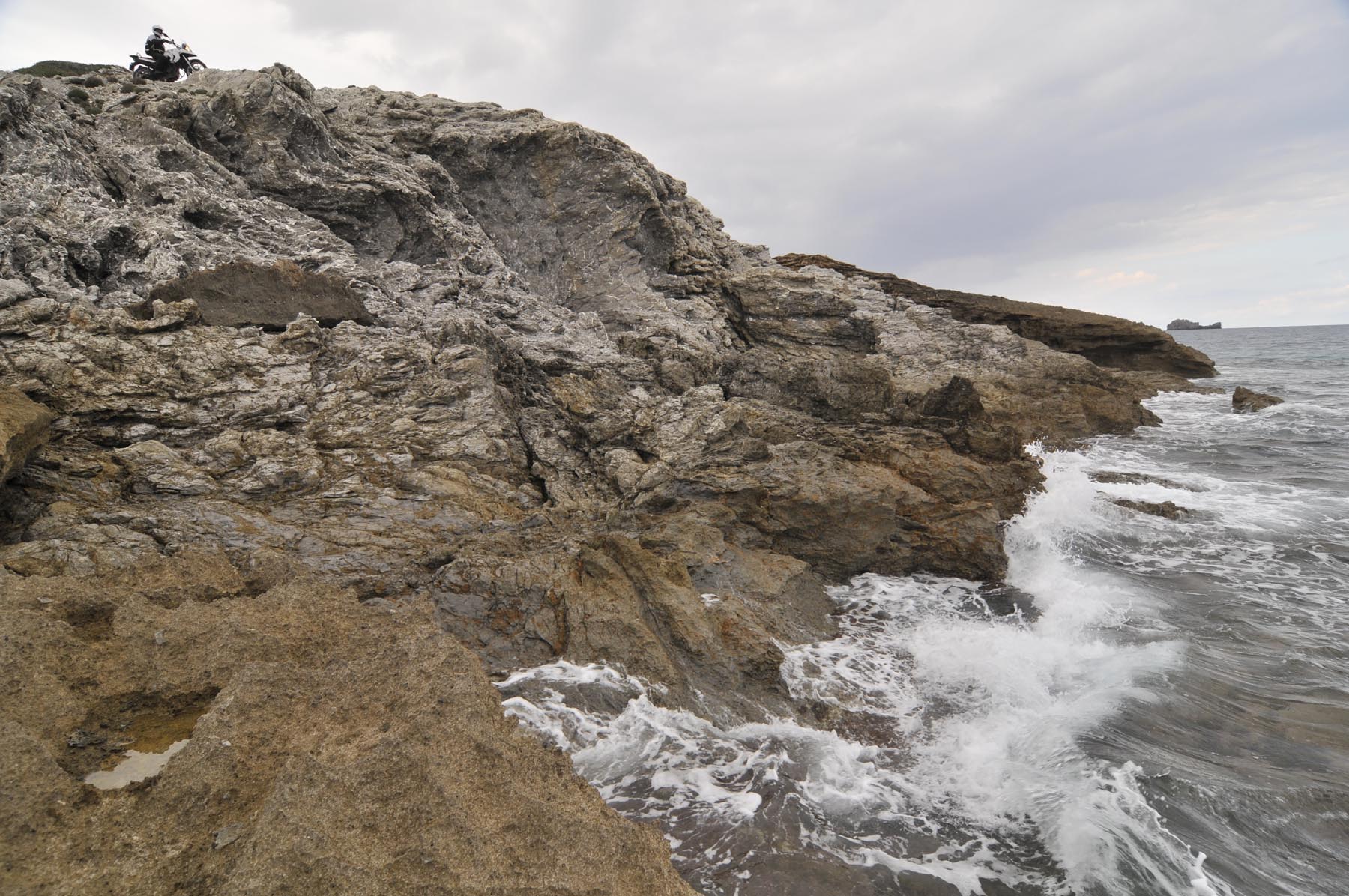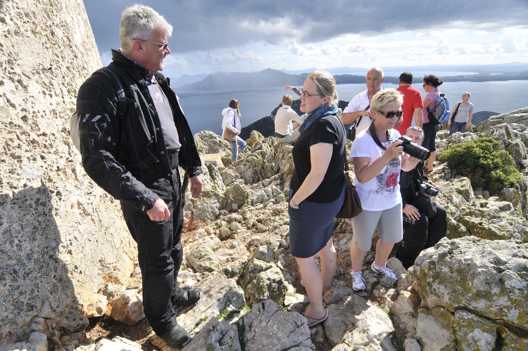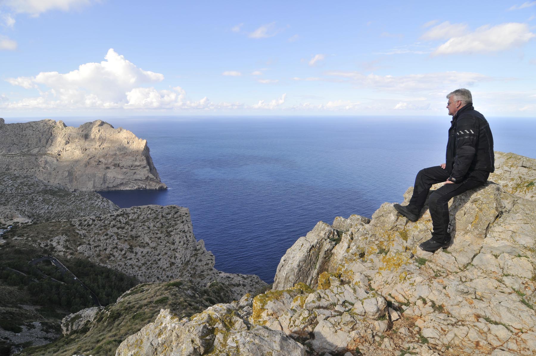 Hoe het ooit moet zijn geweest toen zeilschepen nog door piraten werden leeggeroofd, dat wordt duidelijk op het smalle, bochtige weggetje dat leidt naar de oude wachttoren Talaia d’Albercuix. Diep hieronder de woeste, puntige en grillige kust, inclusief bergachtige schiereilanden die als prehistorische, monterachtige hagedissen uit het water oprijzen. Is dit het brave ‘huisvrouweneiland’ Mallorca? Het ziet veel exotische uit, minstens net zoals Nieuw-Zeeland. Er zijn types geweest, en ook dat weet Thorsten, die hier boven bij de toren zo high werden, misschien ook door het gebruik van niet geheel nevenwerkingvrije pillen, dat het een paar uur duurde voordat ze weer rijklaar waren.