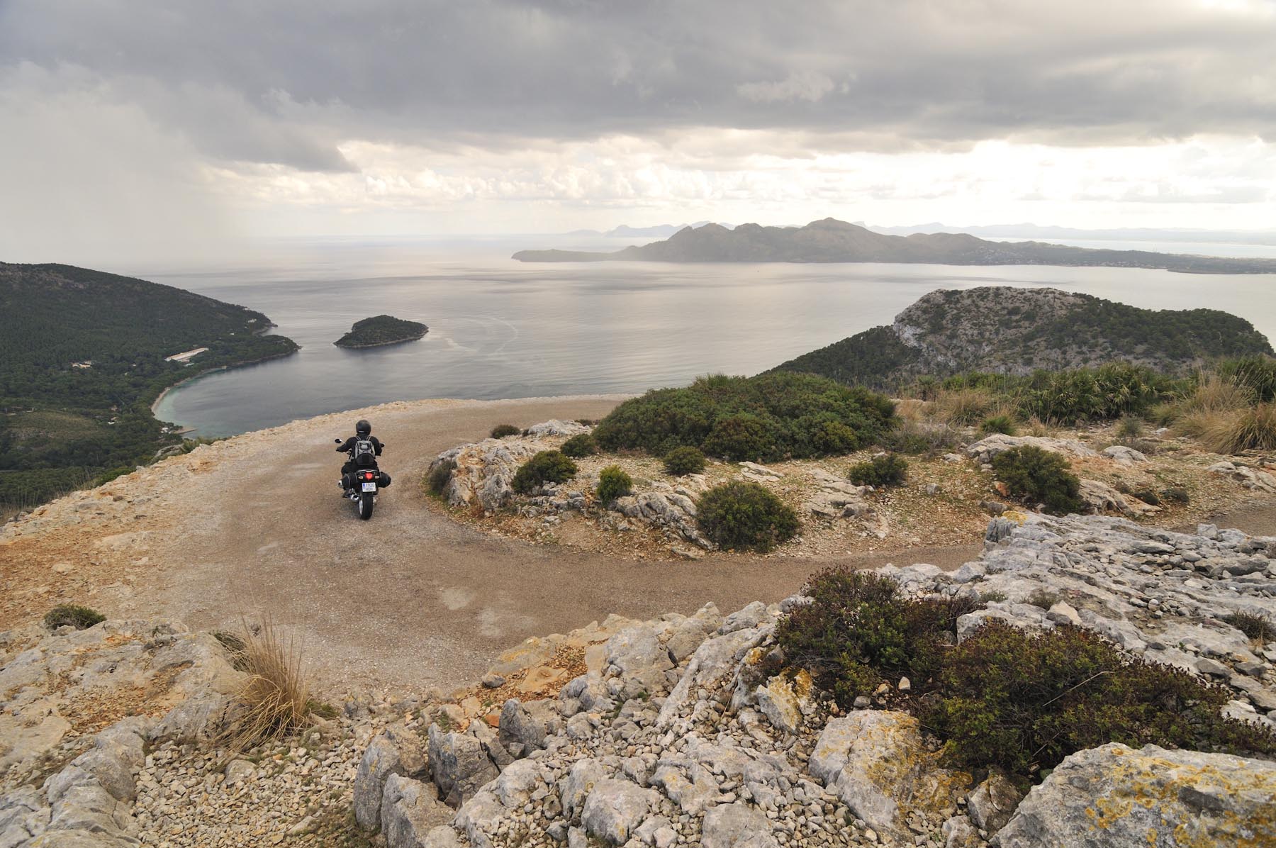 Maandagmorgen. Start naar ‘boven, rechts op de kaart’, oftewel Cap de Formentor. Gevolgd door een trip over de Serra de Tramuntana, de 90 kilometer lange en tot wel 1400 meter hoge bergketen die van het noorden van Mallorca een toevluchtsoord voor strandvluchtelingen maakt. Deelnemers aan deze tocht zijn Thorsten en Alexander die bij hun ‘huurmotorzoektocht’ eveneens in Felanitx landden.