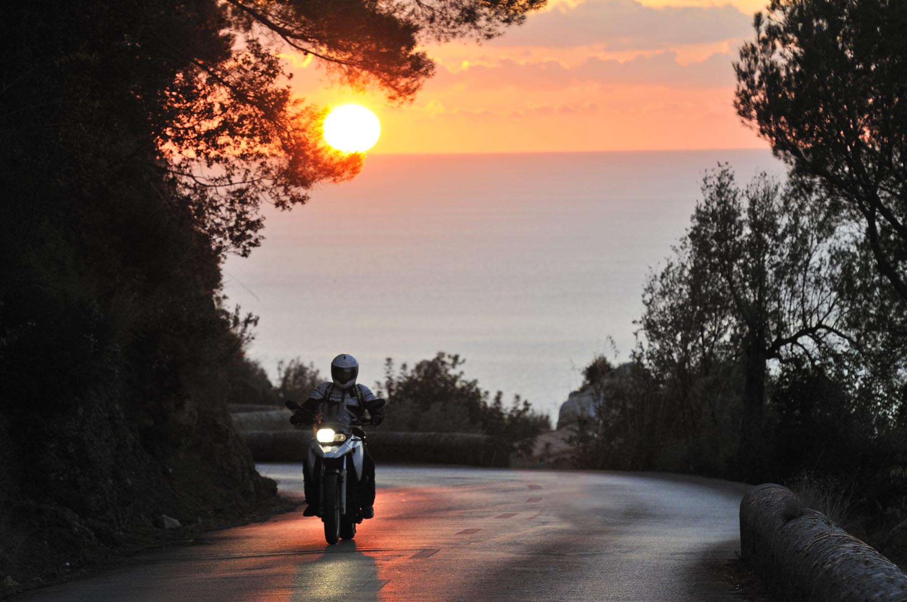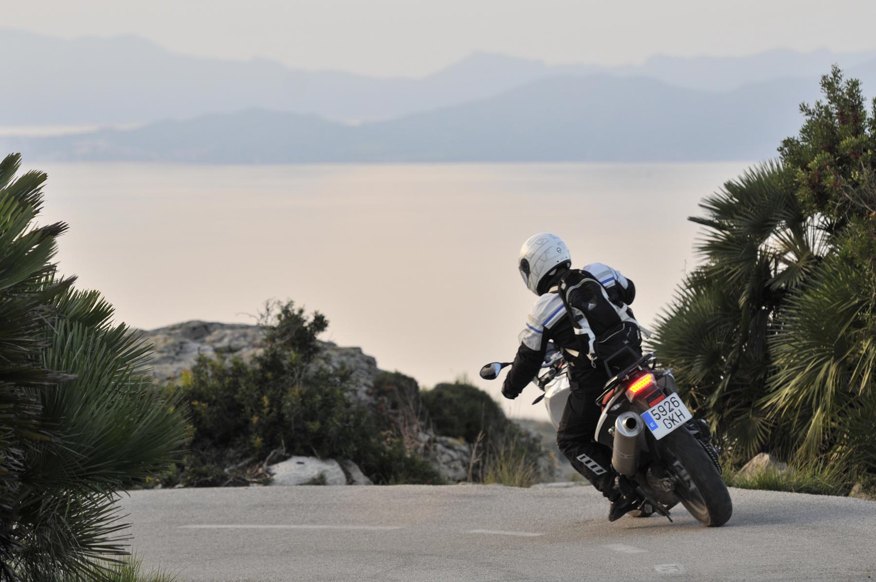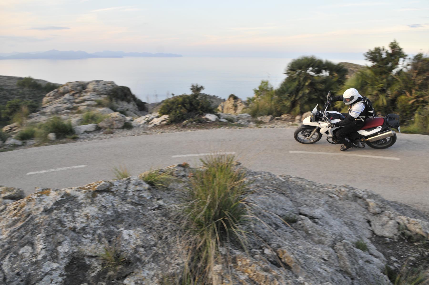 Dit alles is op de GS puur genot, terwijl gekwelde koppelingsplaten en banden hun bestuurders naar de duivel wensen. Behalve als ze zouden weten dat aan het einde van de martelweg een boterzacht lammetje wacht in restaurant Es Verger. Daarna weer naar beneden over het wasbord, verder waaierend door het hoog gelegen dal van Vall d’Orient. Het land zo groen als een biljartlaken, doorsneden met een weg. Alsof iemand uit pure woede of overmoed met de keu een bochtige scheur in het doek heeft gemaakt. Als kogels in een flipperkast flitsen we over de pas naar Sóller om precies op tijd, om 19 uur, bij Deià te zien hoe de lady gloedrood in zee wegzakt, na ons de hele dag te hebben begeleid. Van ‘dawn till dusk’.