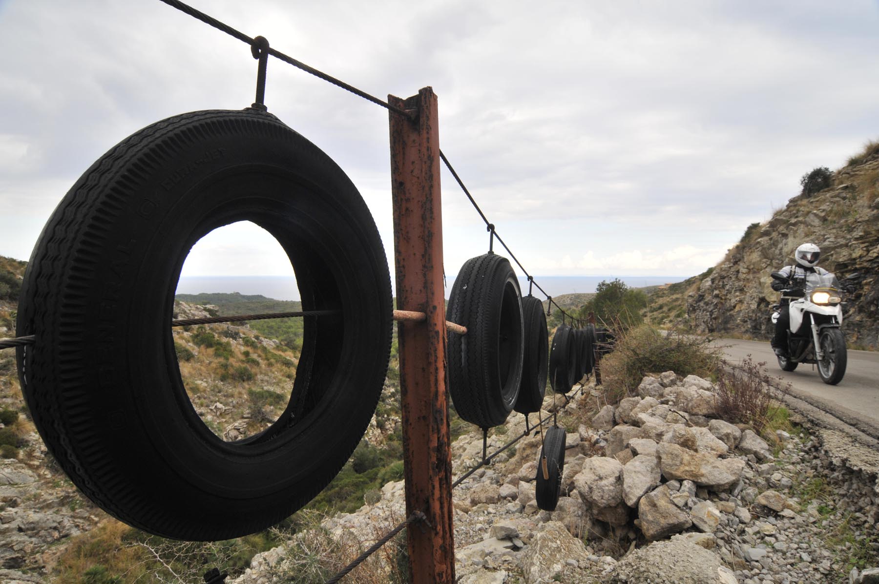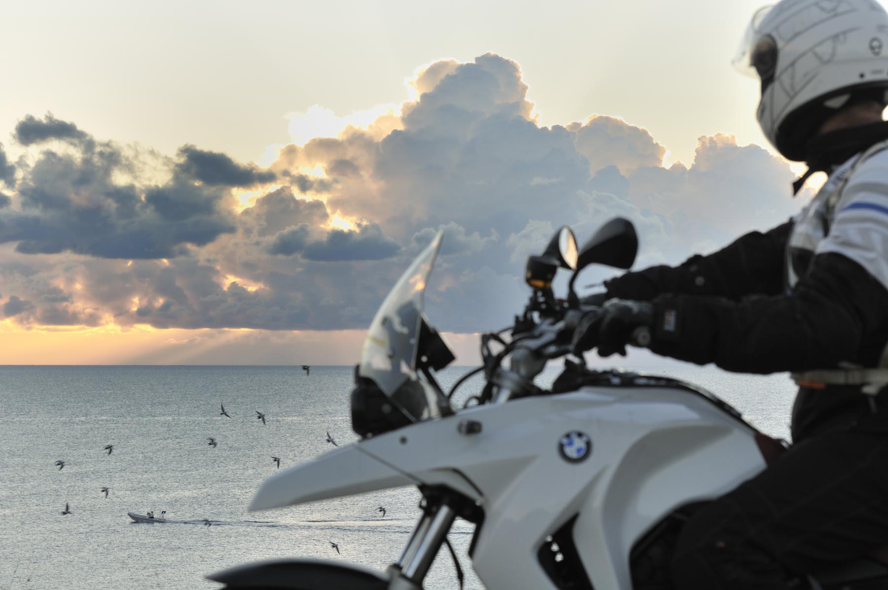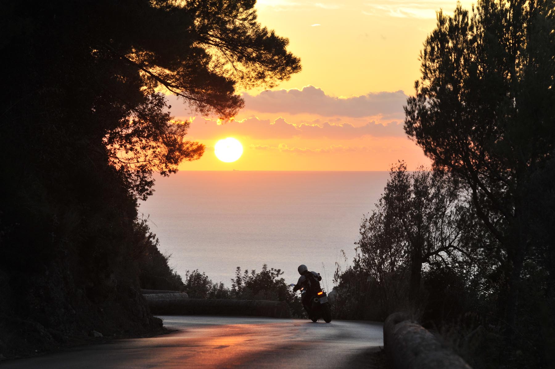 Dit alles is op de GS puur genot, terwijl gekwelde koppelingsplaten en banden hun bestuurders naar de duivel wensen. Behalve als ze zouden weten dat aan het einde van de martelweg een boterzacht lammetje wacht in restaurant Es Verger. Daarna weer naar beneden over het wasbord, verder waaierend door het hoog gelegen dal van Vall d’Orient. Het land zo groen als een biljartlaken, doorsneden met een weg. Alsof iemand uit pure woede of overmoed met de keu een bochtige scheur in het doek heeft gemaakt. Als kogels in een flipperkast flitsen we over de pas naar Sóller om precies op tijd, om 19 uur, bij Deià te zien hoe de lady gloedrood in zee wegzakt, na ons de hele dag te hebben begeleid. Van ‘dawn till dusk’.