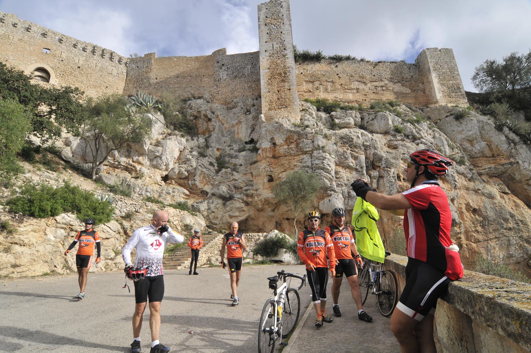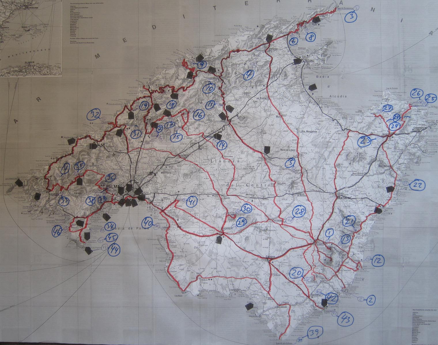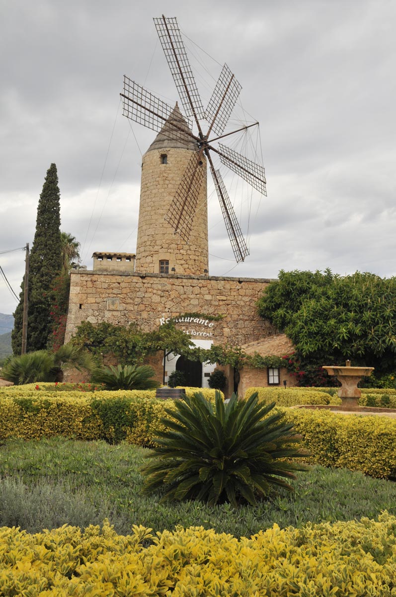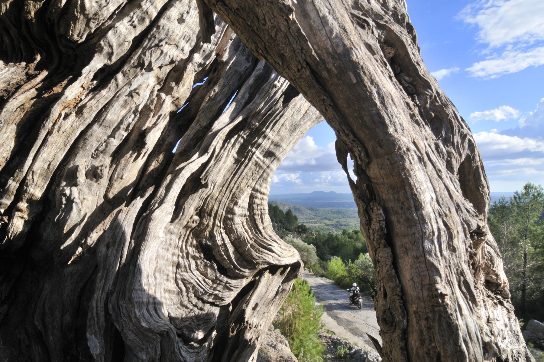 Wij stellen ons tevreden met wat Mallorca ons te bieden heeft en kruisen noordwestelijk via een fijnmazig netwerk van heel kleine weggetjes door dambordachtig boerenlandschap. De Midden-Europees geijkte ogen blijven verbaasd hangen aan de cactushagen en op het oog fris geploegde, bruin geschubde velden, die je spontaan associeert met de verschrompelde huid van iemand die te lang in de zonnebank heeft gelegen. Een schitterend, slank weggetje brengt ons naar Binissalem en meteen daarna in Alaro op de zonluwe Plasa de la Vila waar de kelner van ‘Ca’n Punta’ ons twee copieuze salades voorschotelt. Helaas blijft er hierdoor geen ruimte meer over om nog een heerlijk stuk koek te eten. In plaats daarvan volgt, omhoog richting Castello d’Alano, de slechtste weg ter wereld. Nou ja, van het eiland. Kuilen van formaat, omzoomd door een beetje aftandse, karaktervolle olijfbomen.