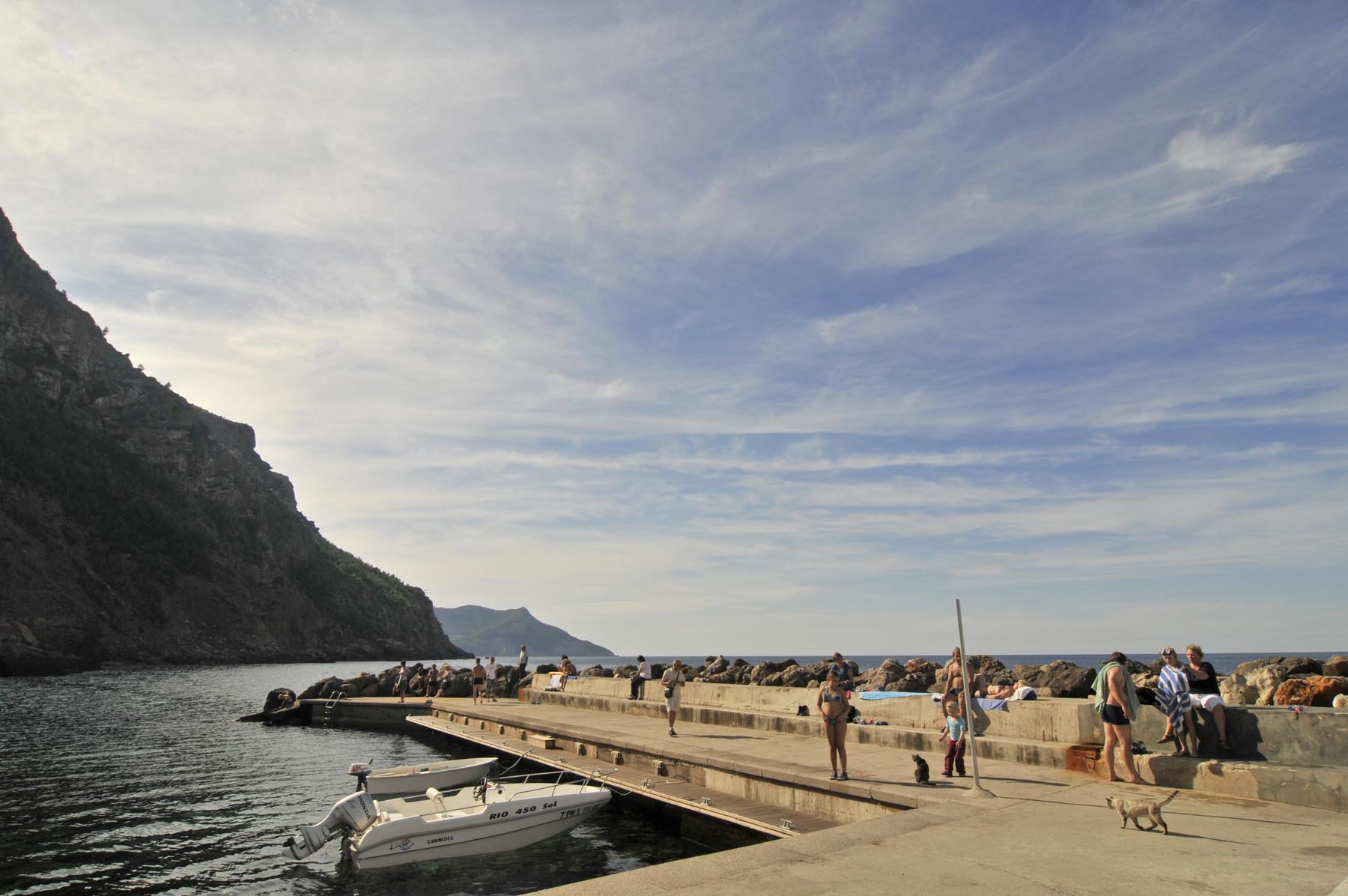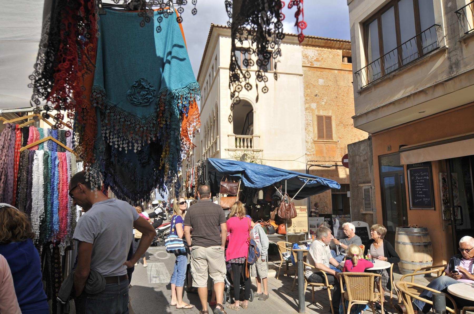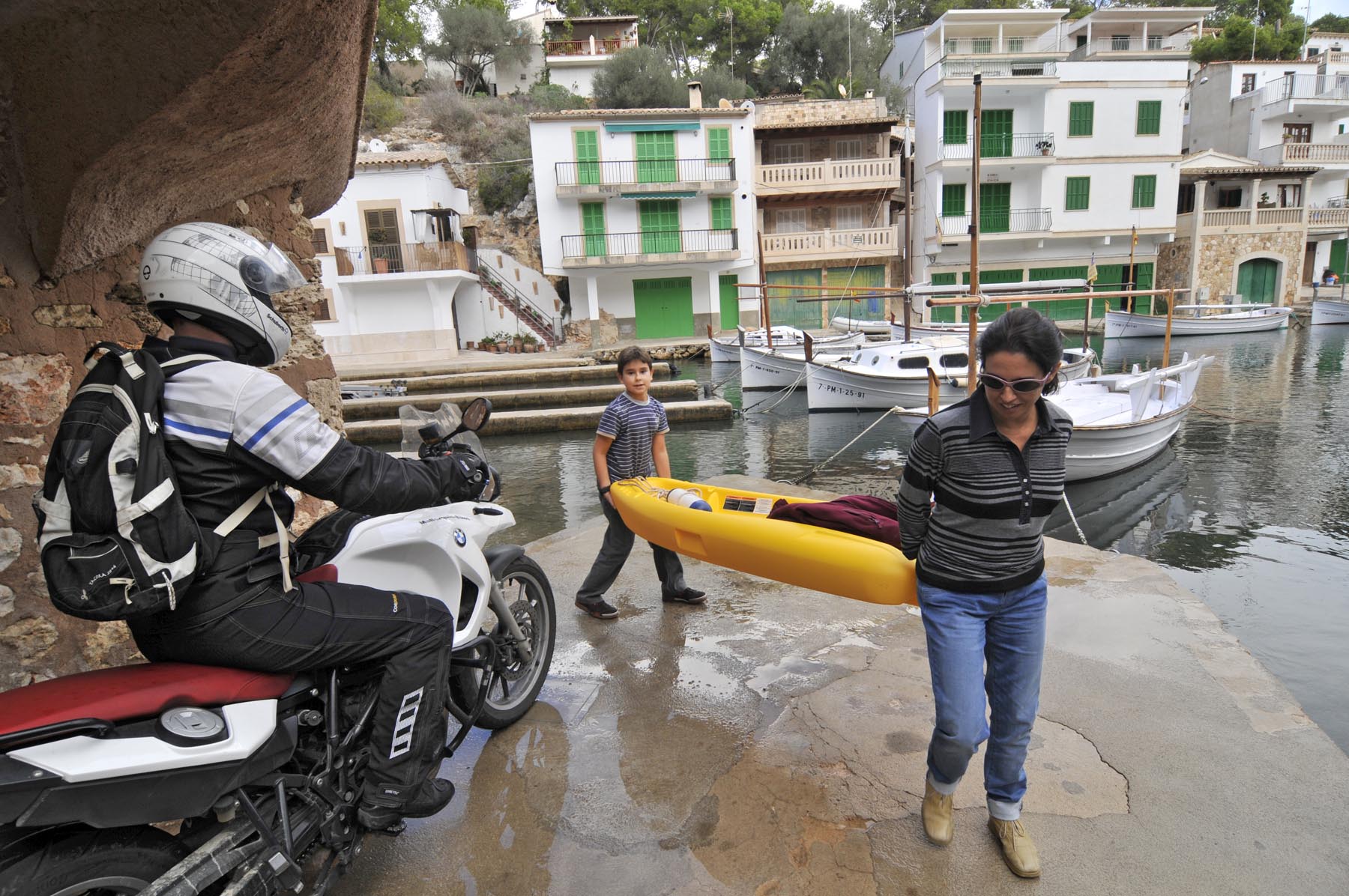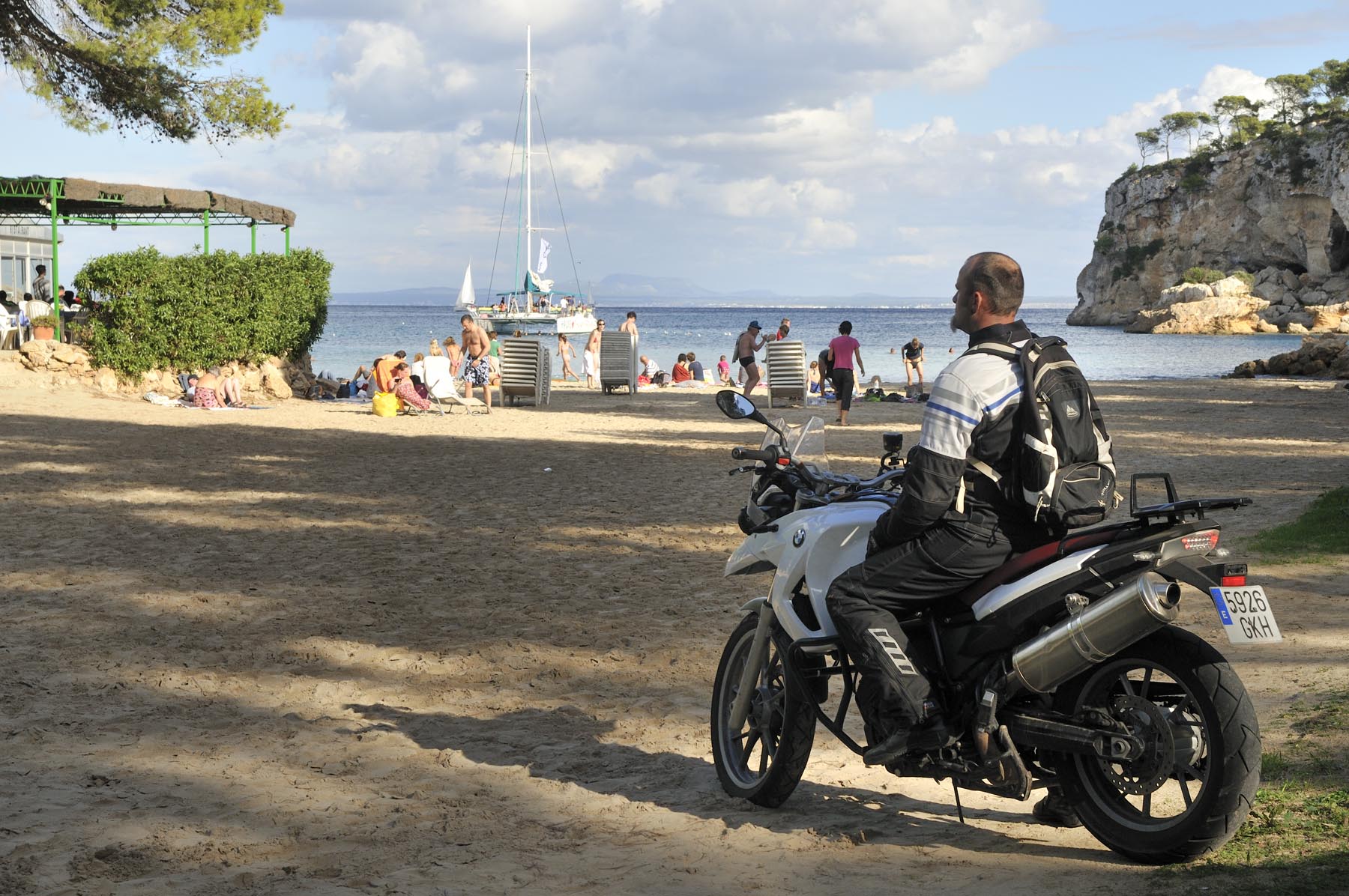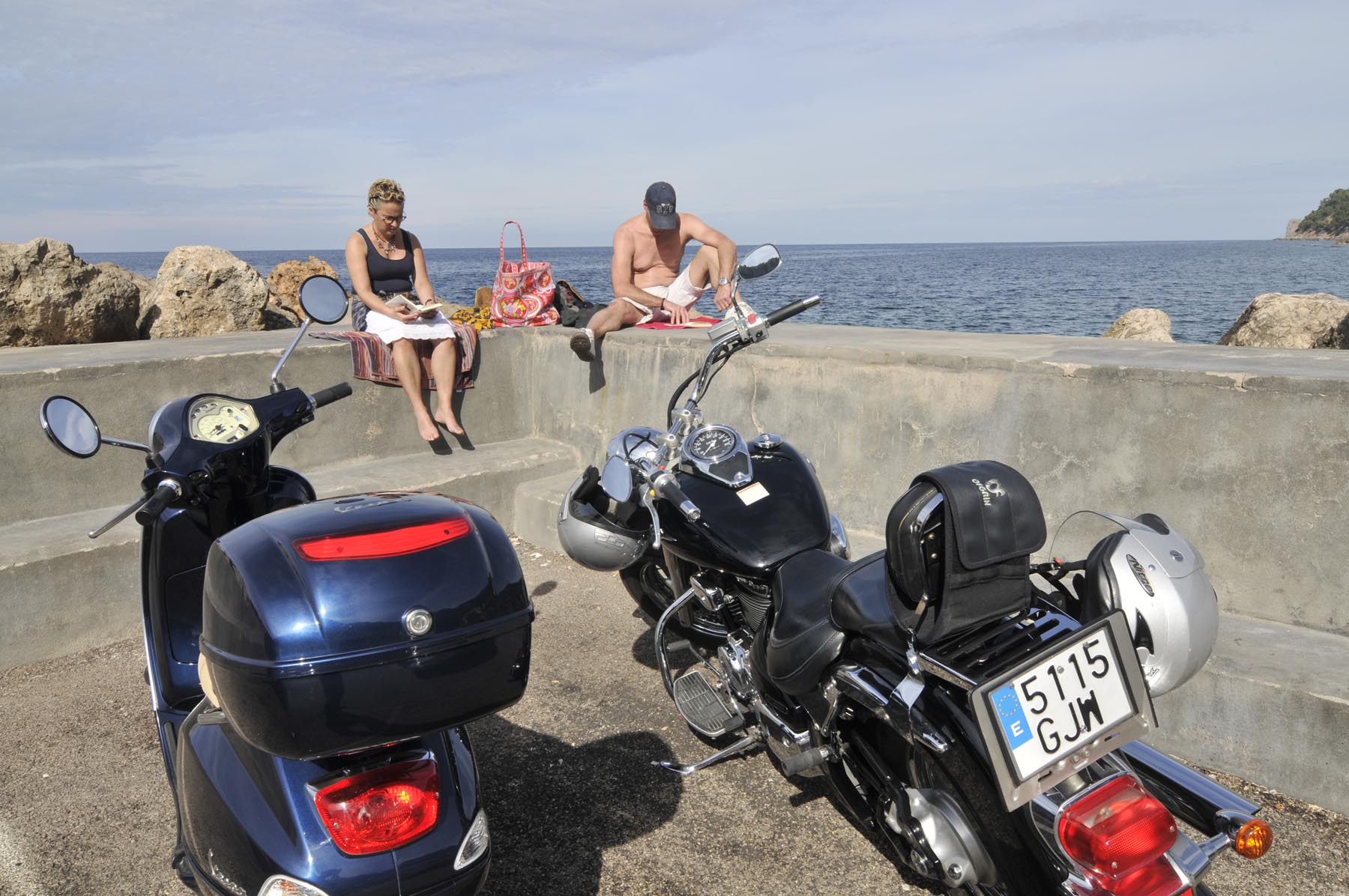 Om niet te lang aan de kust te blijven hangen, rijden we via Petra snel door richting vlakke land, richting Port de Pollença. Hier, in een café met een uitzicht op boten, baai en bergen zoals welgestelde Britse vakantiegangers dat tachtig jaar geleden ook al hadden, vertelt Thorsten over een parkeercontroleur die in Bunyola een groep fout geparkeerde motoren wilde afromen: zeven keer 200 euro.