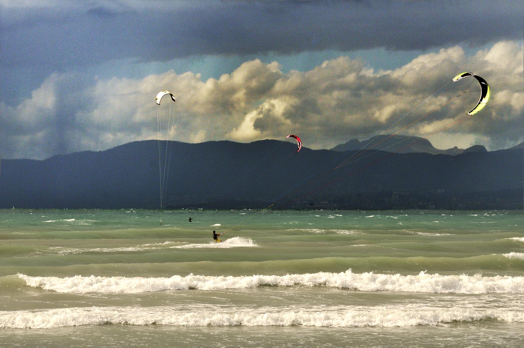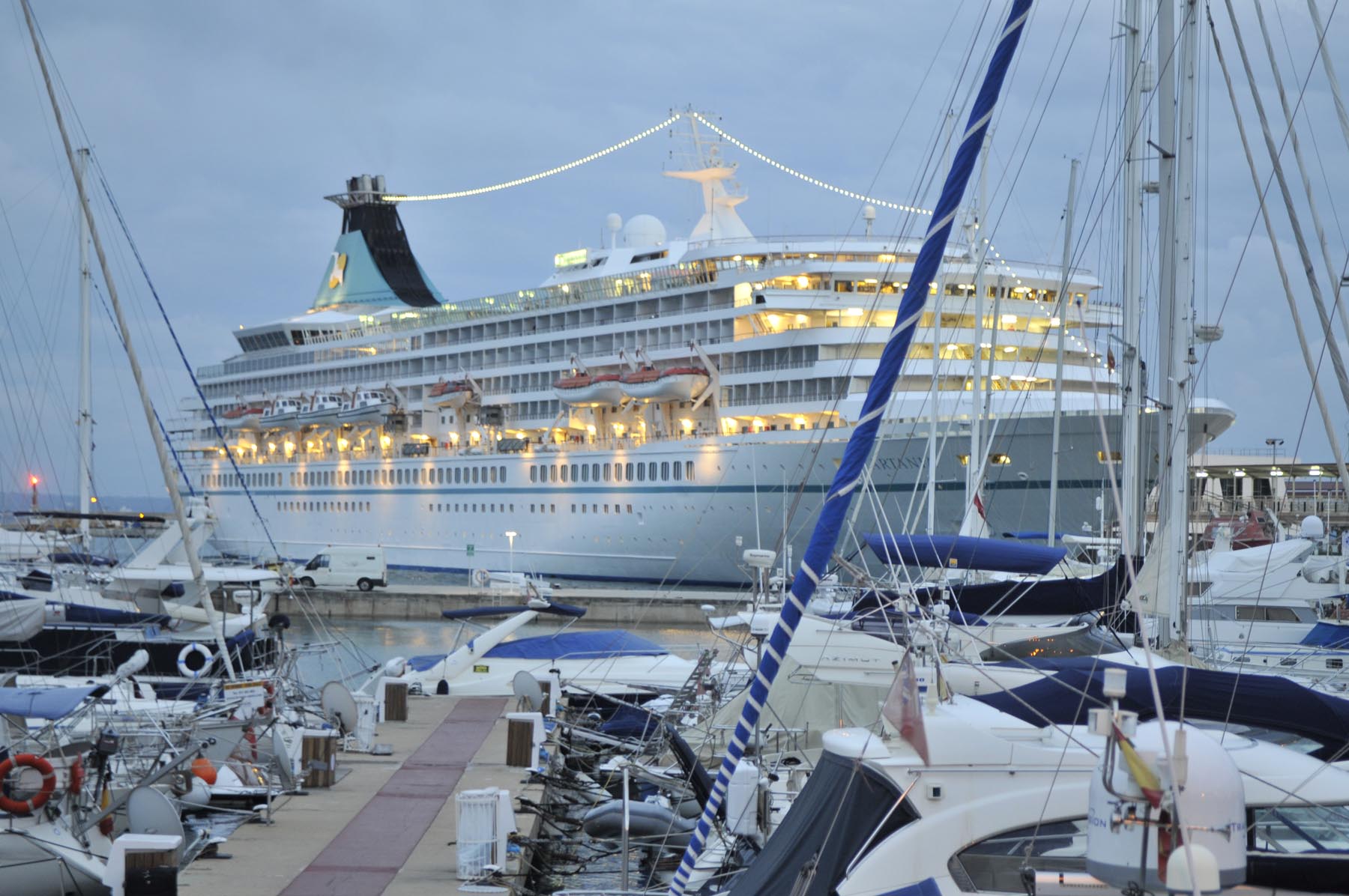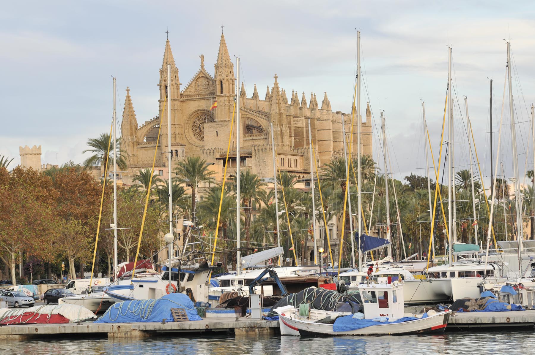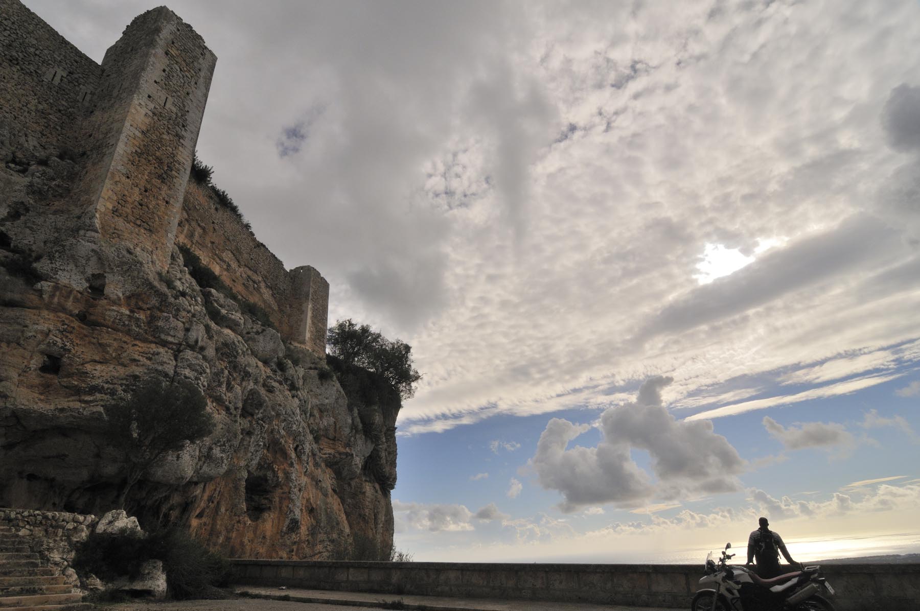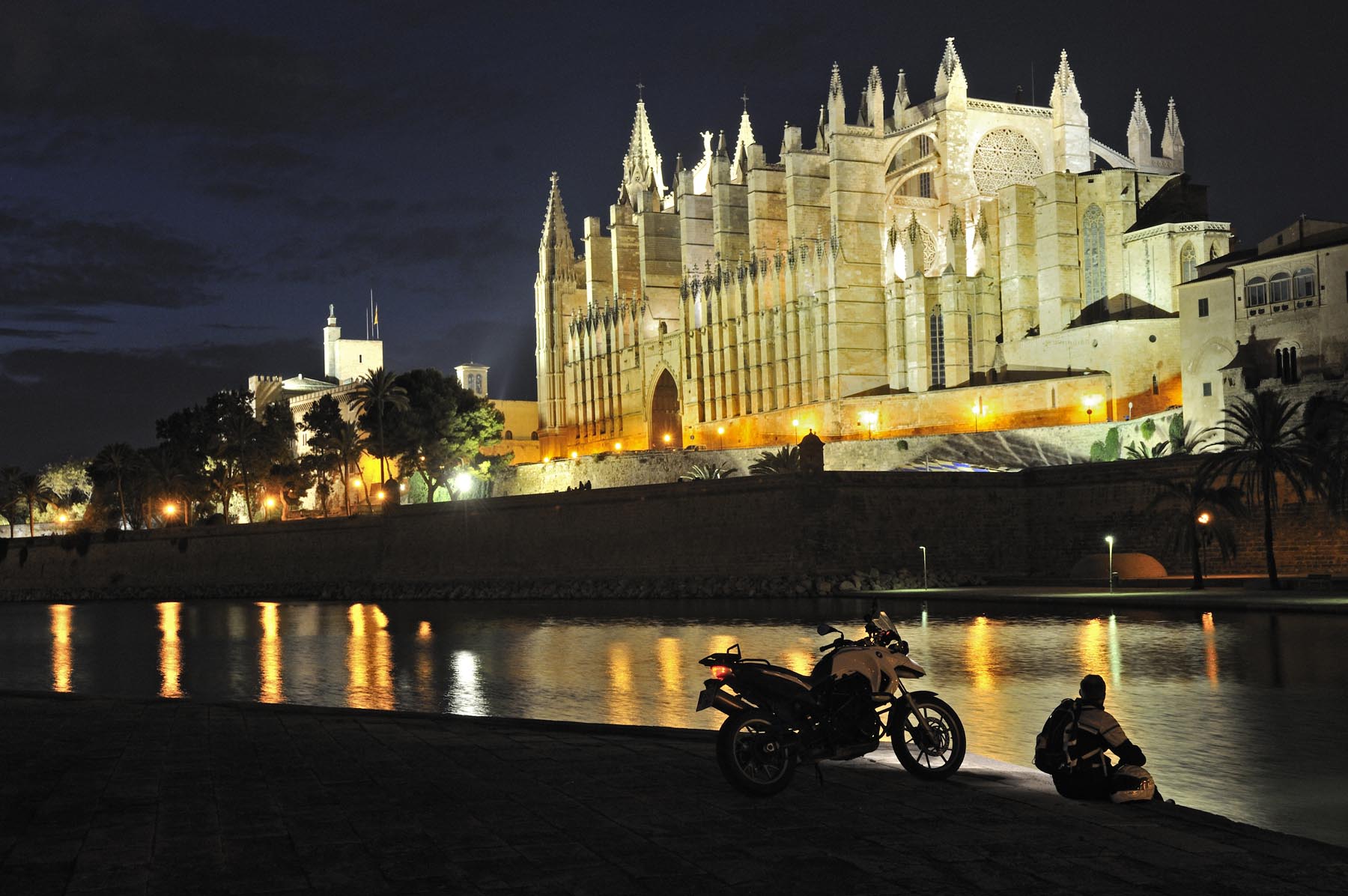 Af en toe wil de maag ook iets. Het voeden van de hongerigen lukt uiteindelijk in Galilea, een naar Bijbels voorbeeld bekend klein bergdorp, met café en restaurant op het centraal gelegen kerkplein. Met de buik vol tapas is het goed rijden. Ma-1041 en Ma-1016, Coll d’es Vent en Coll de Sa Creu, de weg soms overwoekerd met takken zodat je voorover moet hangen alsof je met een clip-on-stuur rijdt. Wie wordt hier geen Mallorca-fan? Het einde van de excursie ligt in de bergen, bij de kanonnen van een vesting bij het stadstrand van Palma. Boah ey! De hoofdstad van het eiland verdient eigenlijk meer dan dertig minuten, maar de opkomende schemering maant tot spoed. Daarom even kort: in de jachthaven wordt het geloof in fun, een leven na de dood, gematerialiseerd middels een kolossale kathedraal.