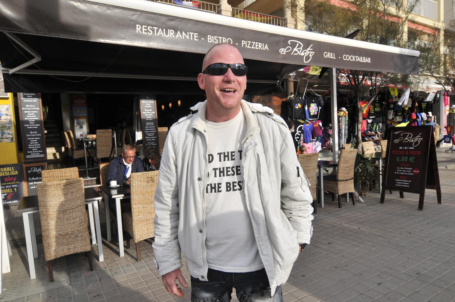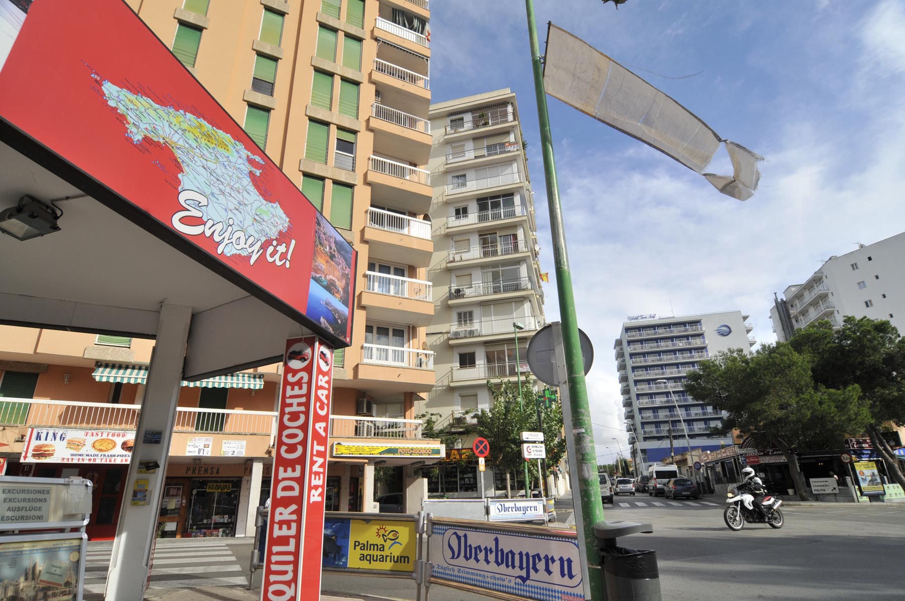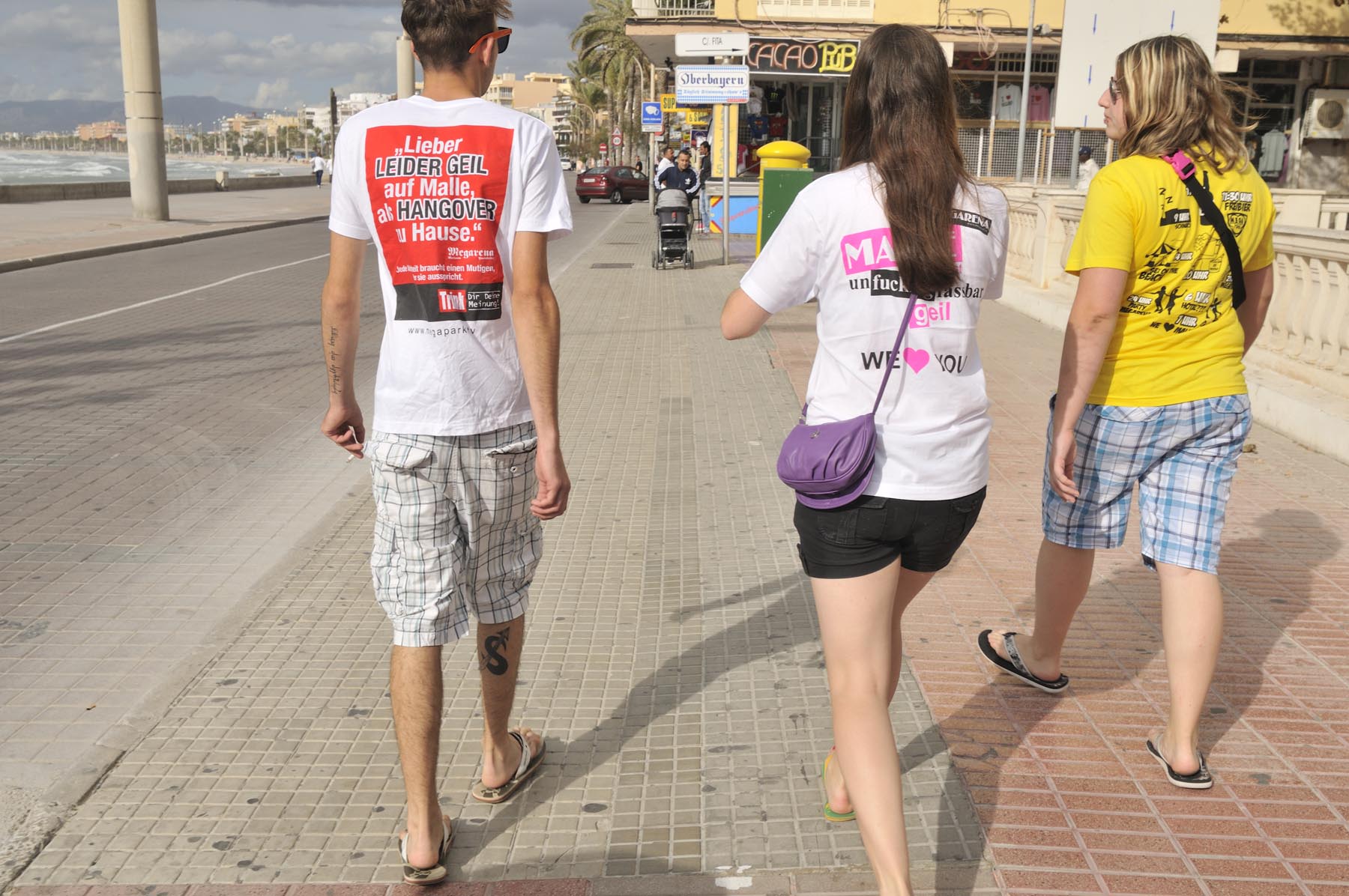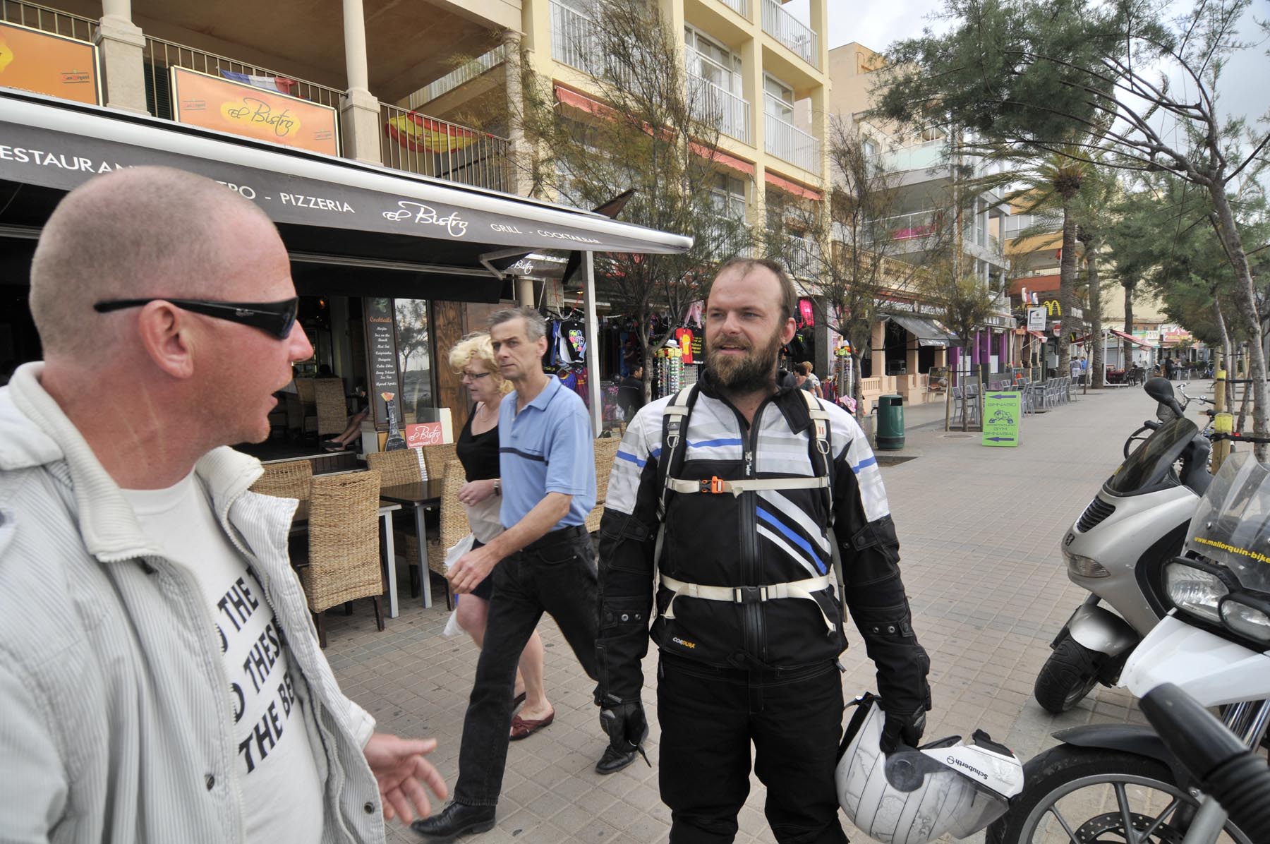 Cruisend langs de vele shops aan de promenade komt de gedachte op aan de Reeperbahn… Tijdens een stop tussen de strandtenten Ballermann 1 en 2 klinkt plotseling een geannimeerd ‘Hallo mannen. Wat te denken van 280 grams steaks, rechtstreeks van een Duitse slager. Voor maar negen euro’. Andy heeft zijn zonnebril altijd op en zijn mond vol. De handelaar in en techneut van telecommunicatieproducten uit Berlin-Kreuzberg woont al negen jaar op Mallorca en werkt als promotor voor El Bistro. Om klanten het restaurant binnen te krijgen, moeten volume en woorden meteen raak zijn. De professional herkent Nederlandse dames aan hun Birckenstocks en Engelse aan hun navelpiercing. Ondertussen verklapt hij het gewicht van zijn vrouw evenals de topsnelheid van zijn scooter bergopwaarts. Waarbij hij beide waardes liever omgekeerd had gezien. Ter afscheid geeft Andy een ‘bikertip’: “Willen jullie de vliegtuigen een goed onder de vleugels kijken, rij dan naar de Ma-5013, richting Sant Jordi. Daar zweven ze bij de landing heel dicht boven je hoofd”.