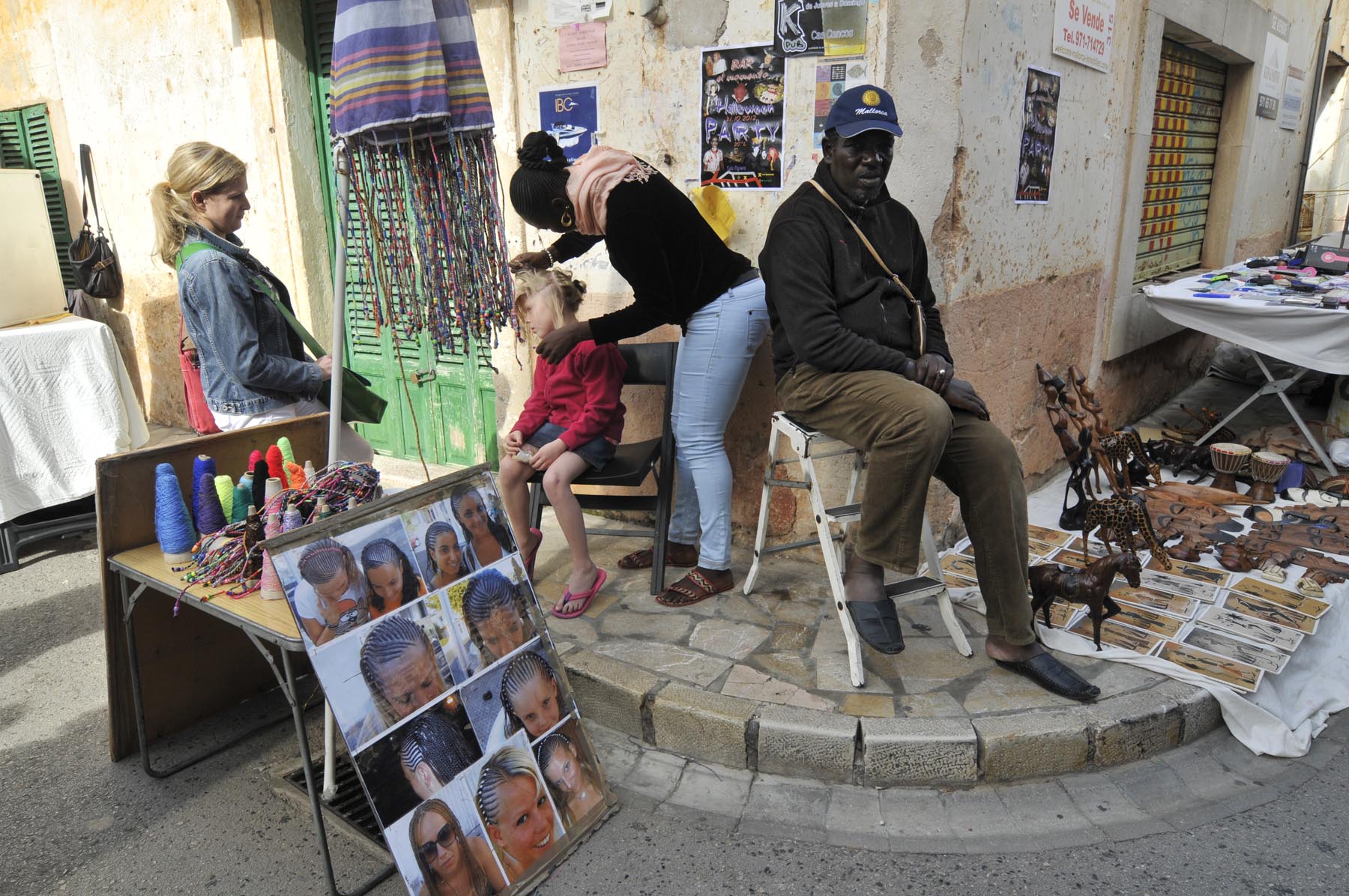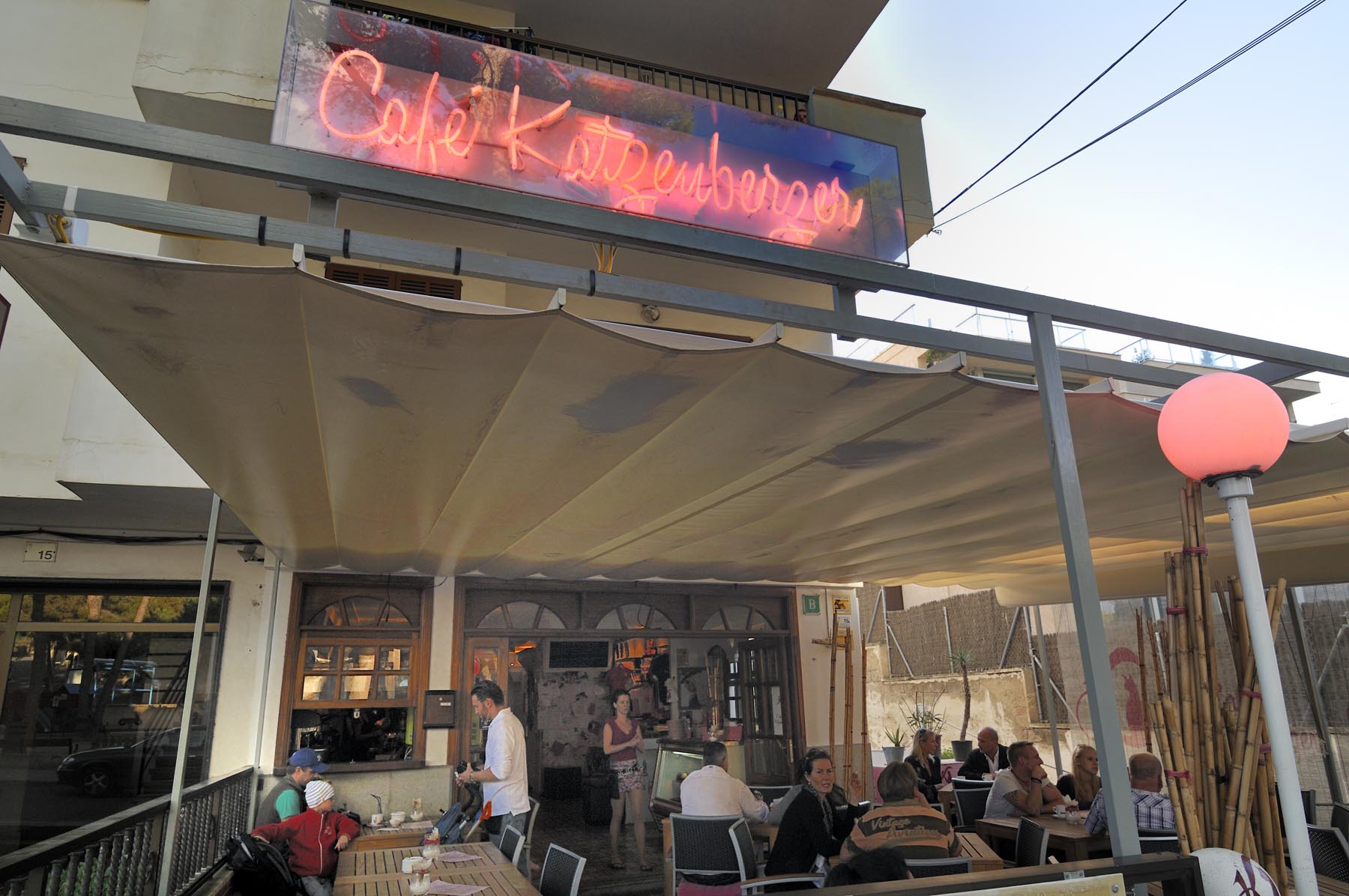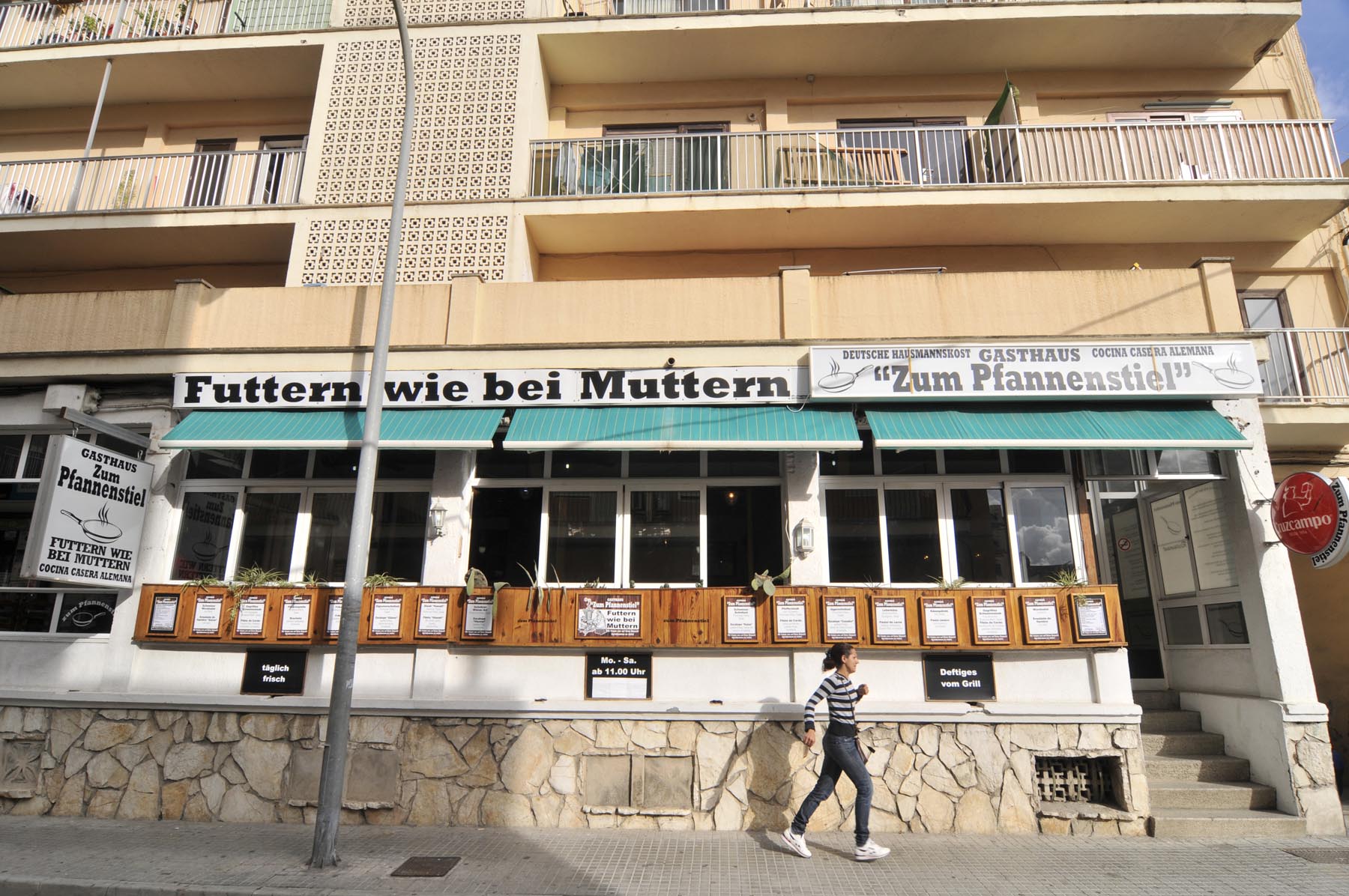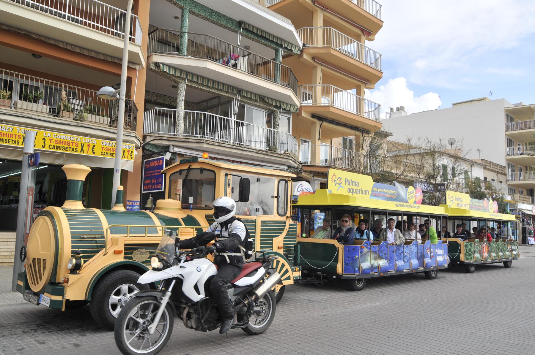 Cruisend langs de vele shops aan de promenade komt de gedachte op aan de Reeperbahn… Tijdens een stop tussen de strandtenten Ballermann 1 en 2 klinkt plotseling een geannimeerd ‘Hallo mannen. Wat te denken van 280 grams steaks, rechtstreeks van een Duitse slager. Voor maar negen euro’. Andy heeft zijn zonnebril altijd op en zijn mond vol. De handelaar in en techneut van telecommunicatieproducten uit Berlin-Kreuzberg woont al negen jaar op Mallorca en werkt als promotor voor El Bistro. Om klanten het restaurant binnen te krijgen, moeten volume en woorden meteen raak zijn. De professional herkent Nederlandse dames aan hun Birckenstocks en Engelse aan hun navelpiercing. Ondertussen verklapt hij het gewicht van zijn vrouw evenals de topsnelheid van zijn scooter bergopwaarts. Waarbij hij beide waardes liever omgekeerd had gezien. Ter afscheid geeft Andy een ‘bikertip’: “Willen jullie de vliegtuigen een goed onder de vleugels kijken, rij dan naar de Ma-5013, richting Sant Jordi. Daar zweven ze bij de landing heel dicht boven je hoofd”.
