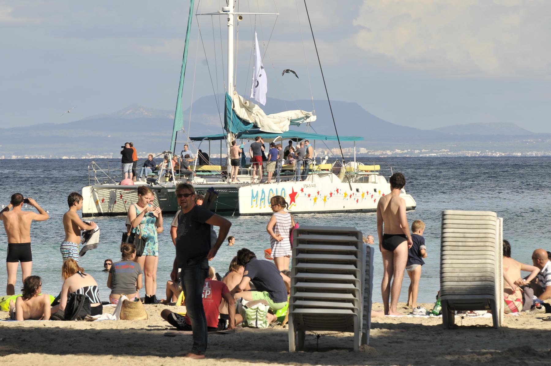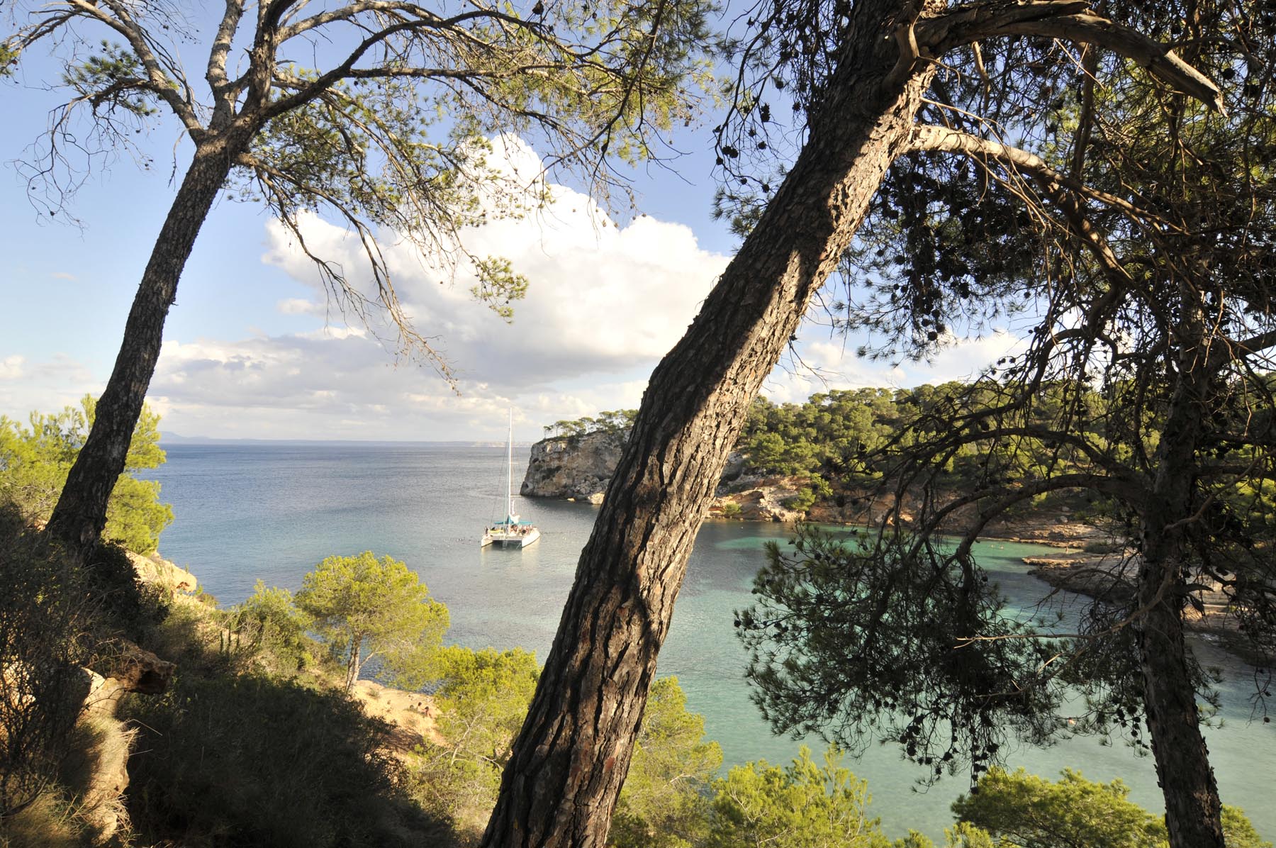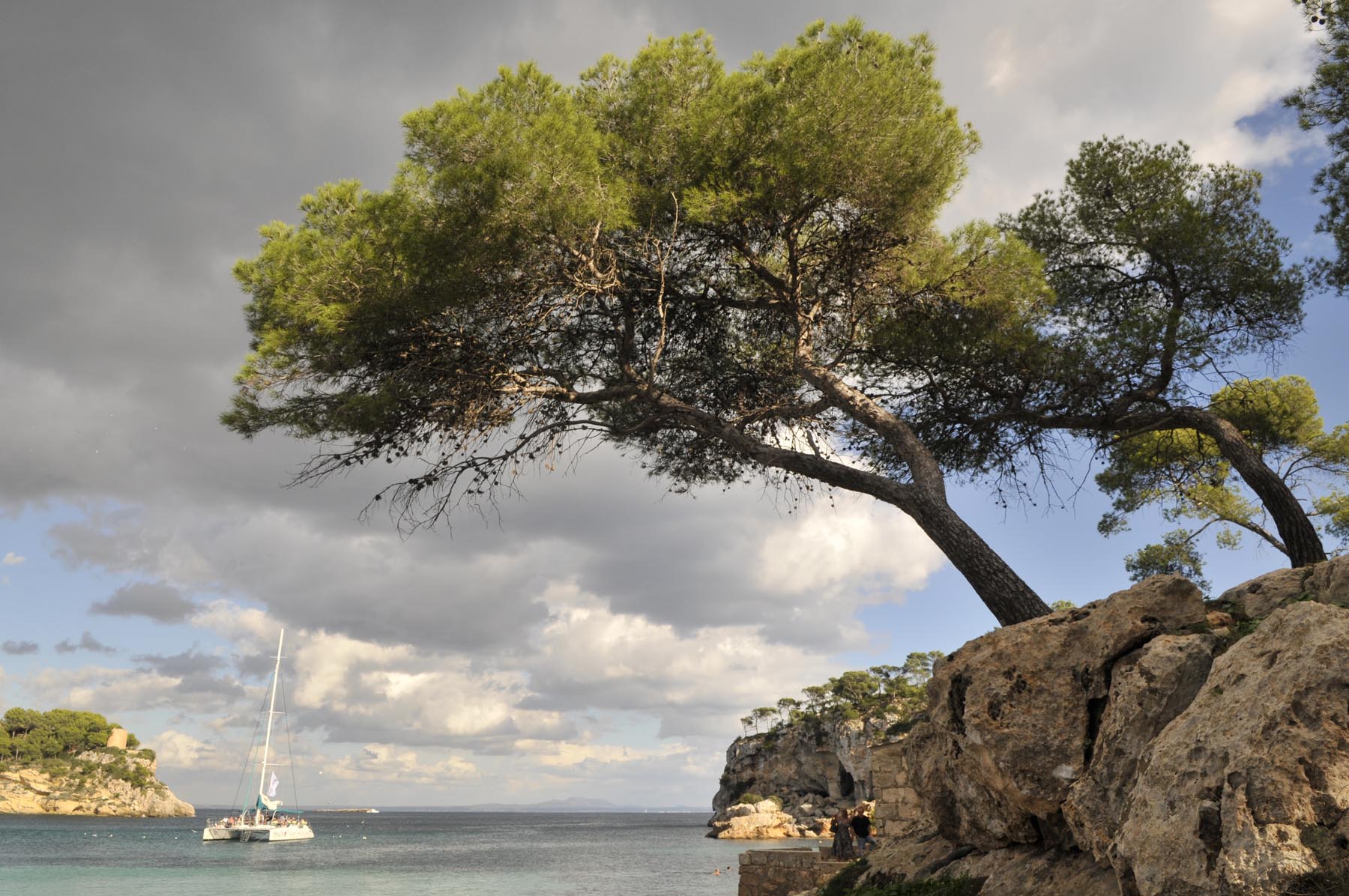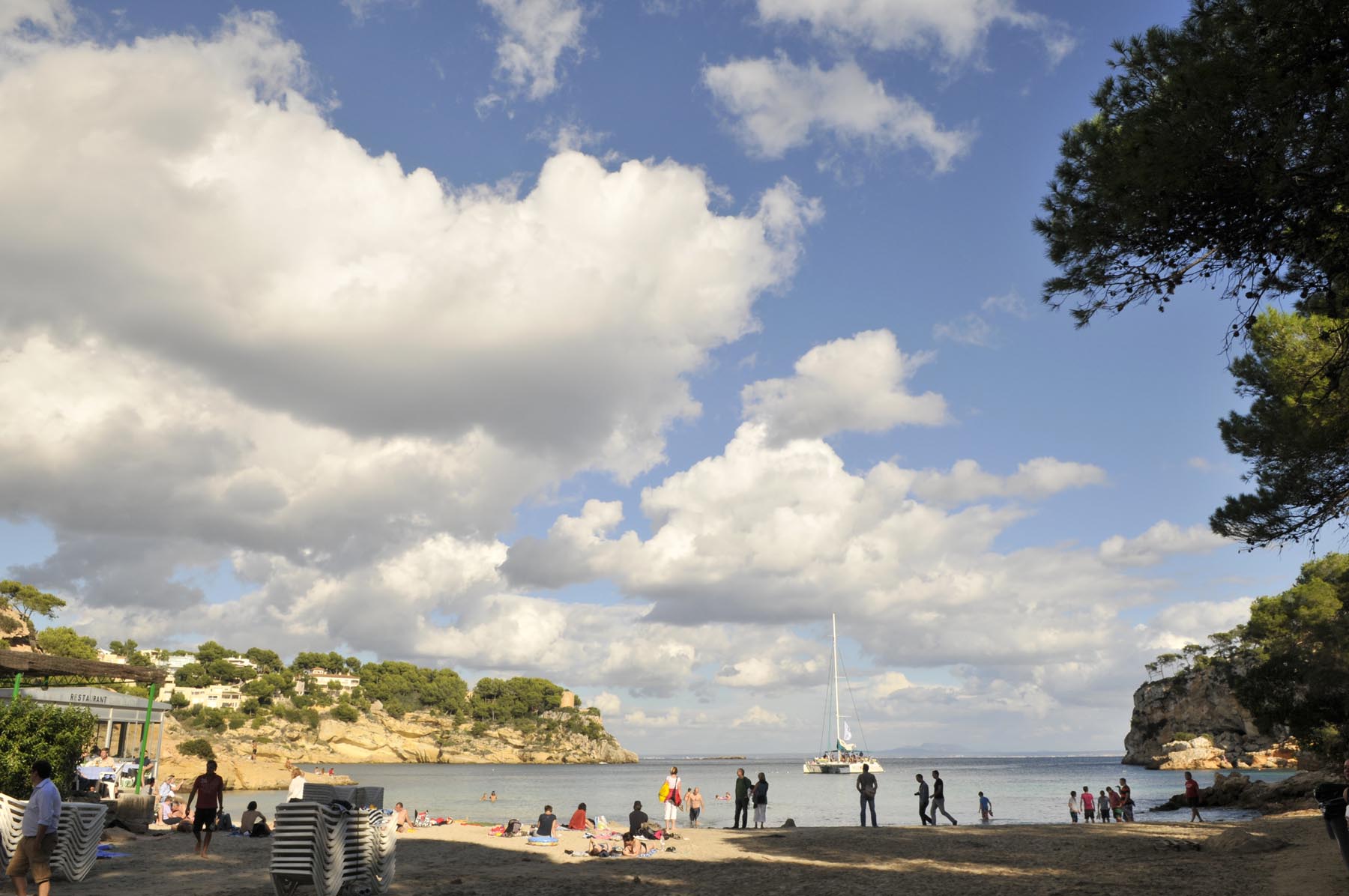 Zaterdag. De laatste dag voordat het vliegtuig richting huis weer opstijgt. De laatste keer eten in de grote eetzaal van hotel Costa del Sur, met het piepen van de toastrolband en de mix van muscleshirts en gebloemde bloesjes aan de buurtafel. Naast kleding ook groente en fruit en gekeuvel op de drukke weekmarkt rondom de kerk in Santanyi. Goed, ‘gasos a la playa’. Doorstart naar het strand bij Cap de la Figuera – niet te verwisselen met Cala Figuera, het lieflijke vissersplaatsje met de volgens de reisgids mooiste haven van het eiland. De tocht dwars over het eiland wordt begeleid door gedonder, maar levert ook een inzicht op: blaffende wolken gieten niet. De toegang tot de Cap is weliswaar versperd, maar al ruim daar voor vinden wij in Portals Vells de untieme, schilderachterige baai: zandstrand, strandbar, parkeren in het zicht, dennenbos, paradijselijk helder water. Hier zou je pech en het wachten op hulp door de verhuurder makkelijk kunnen volhouden.