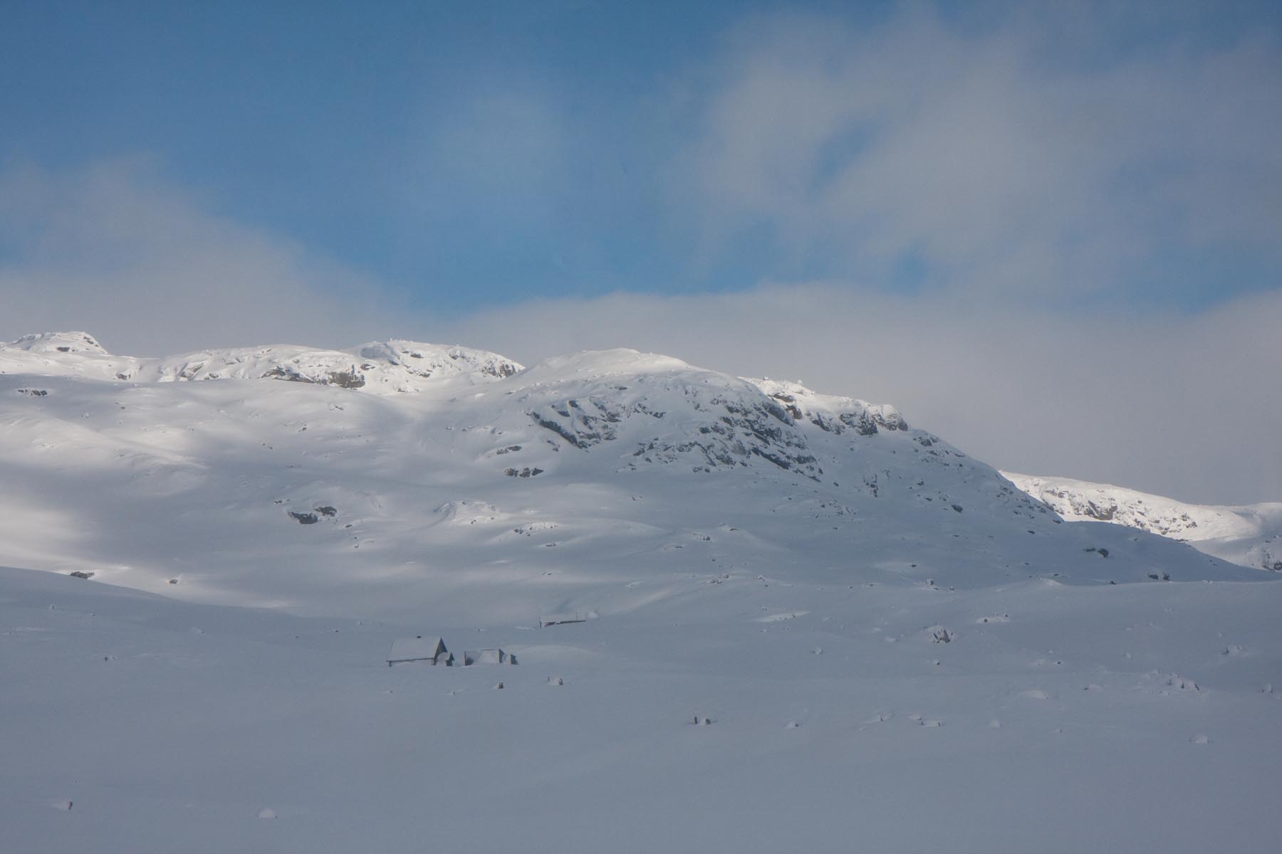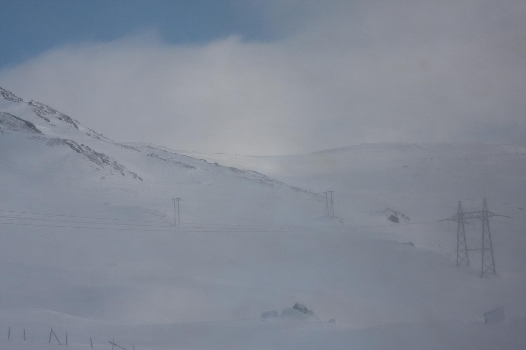 Gisteren hebben we niet veel meer gezien dan de achterkant van een sneeuwschuiver en wat bandensporen. Als de trein de hoogvlakte van de Hardangervidda oprijdt, zien we pas goed in wat voor omgeving we verzeild zijn geraakt. Een sneeuwwoestijn die bijna alle details en oriëntatiepunten heeft opgeslokt. Geen wonder dat George Lucas hier zijn plek vond: dit is van een andere planeet. Ergens in de metershoge sneeuw, parallel aan het spoor, moet dan onze route lopen, de Avonturenweg. Het is nauwelijks voor te stellen dat daar überhaupt een weg loopt, laat staan een begaanbare.