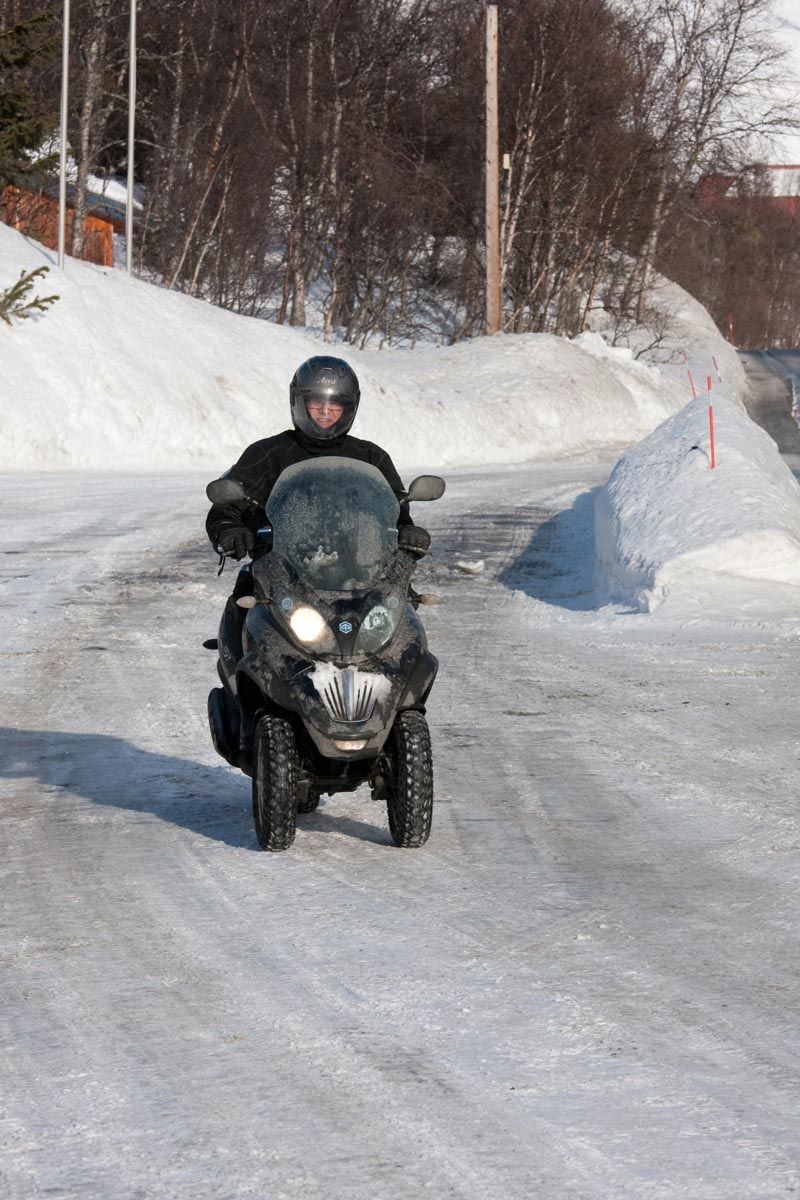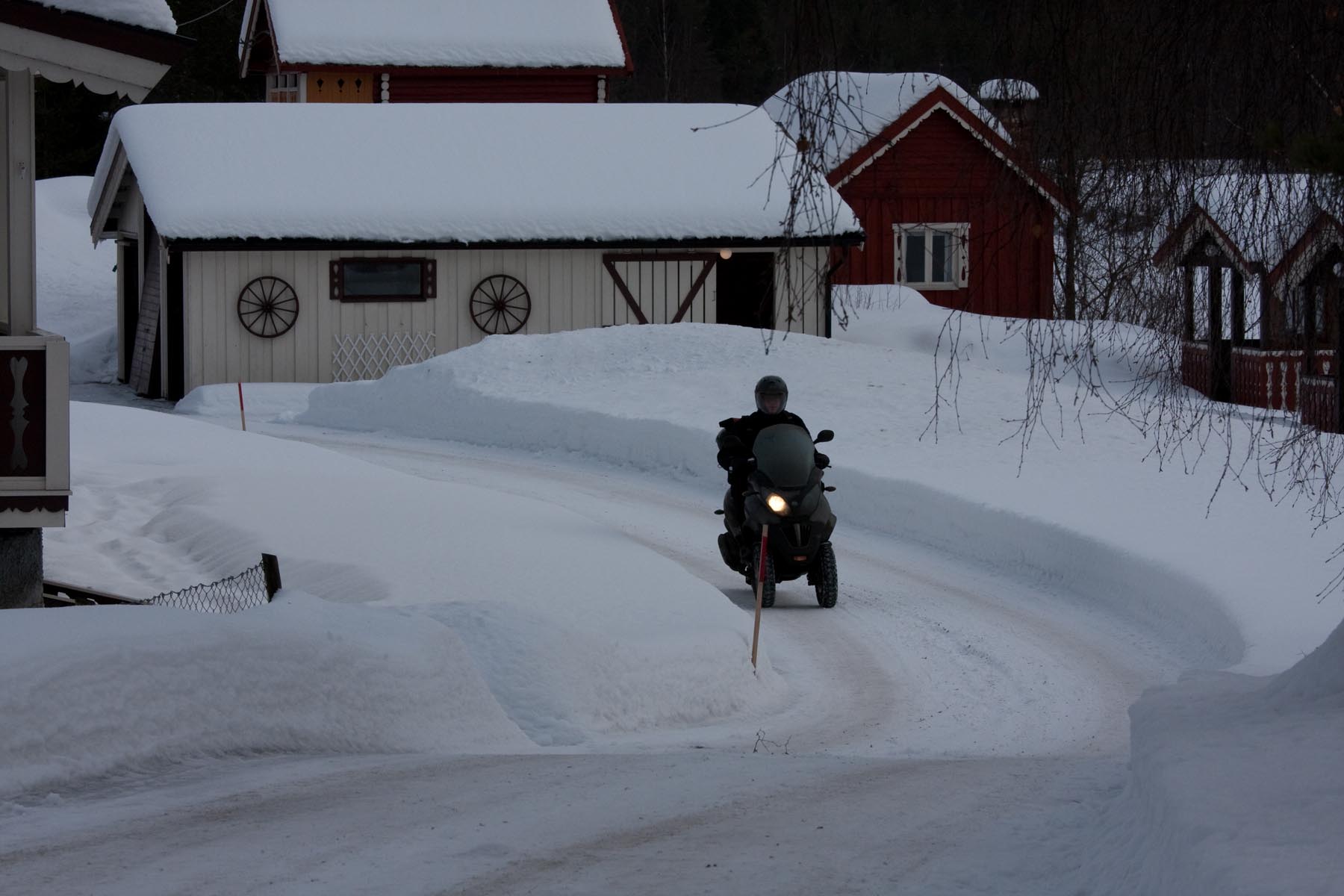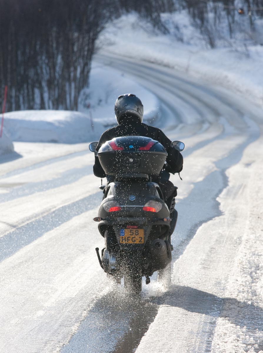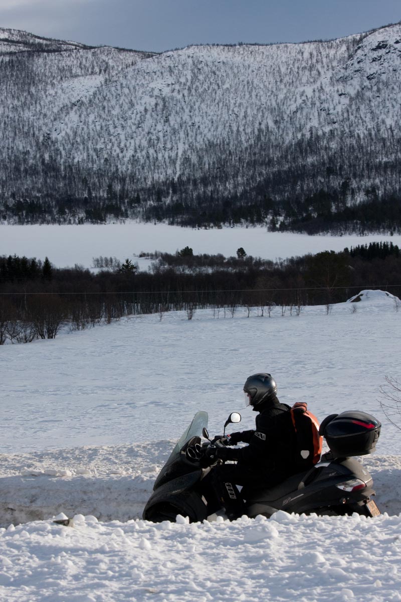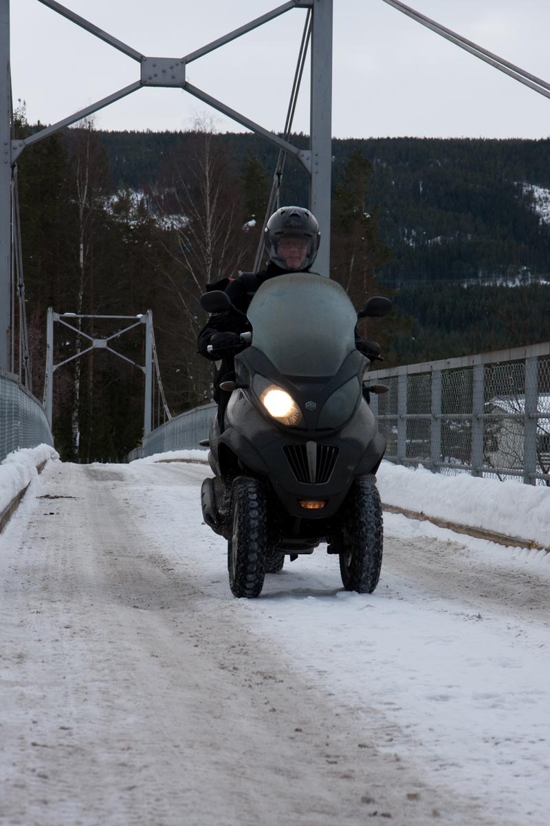 Bovenop de Hardangervidda glijd ik een bocht uit en vlieg ik over de vangrails in een ravijn. In de val verlies ik mijn helm. Als ik hem in de diepe sneeuw terugvind, merk ik dat mijn hoofd er nog in zit… Als ik wakker schrik aan boord van de boot van Kiel naar Oslo, voel ik even of ik nog een hoofd heb. Hm, ja. Dat valt dan weer mee. Maar ik ben te onrustig om verder te slapen en loop in het donker het dek op. Het sneeuwt, onder de boeg hoor ik het ijs kraken en vlakbij zie ik de eerste, kille silhouetten van de bergen. Wat zijn ze al hoog. Een paar honderd kilometer verder zijn ze nog veel hoger. En daar moeten we dus naartoe. Op twee Italiaanse driewielers: een 400 cc Piaggio MP3 en een 500 cc Gilera Fuoco. We zijn waarschijnlijk de eersten die dat doen in de sneeuw. Het begint nu pas bij me te dagen waarom. Het kan natuurlijk helemaal niet, door de dikke sneeuw ploegen met die kleine wieltjes…