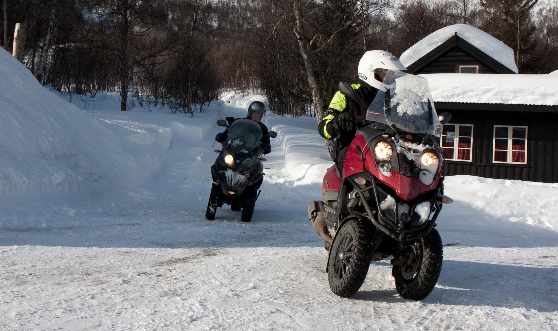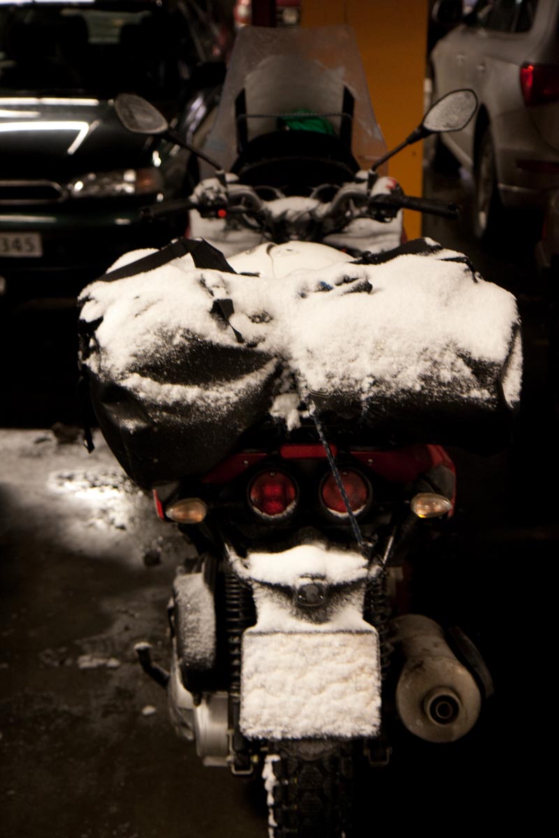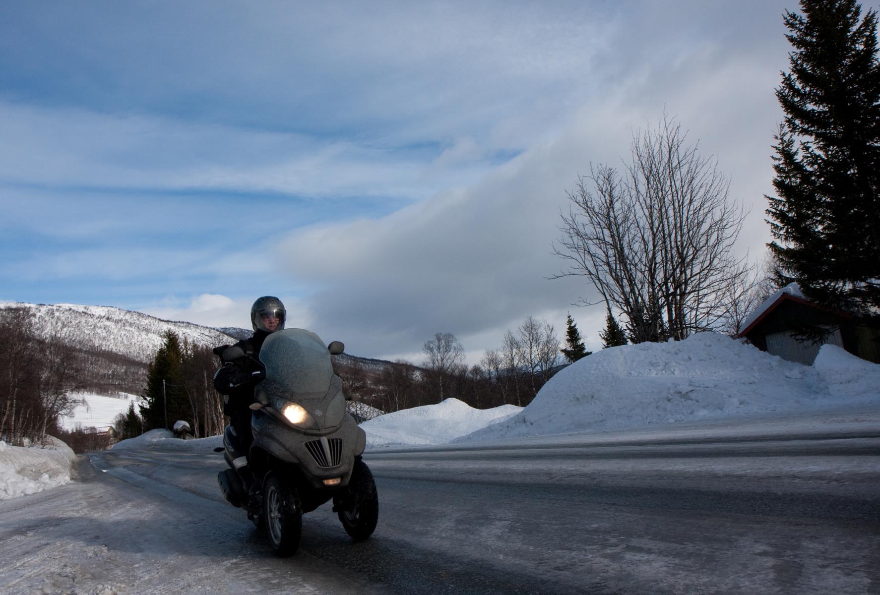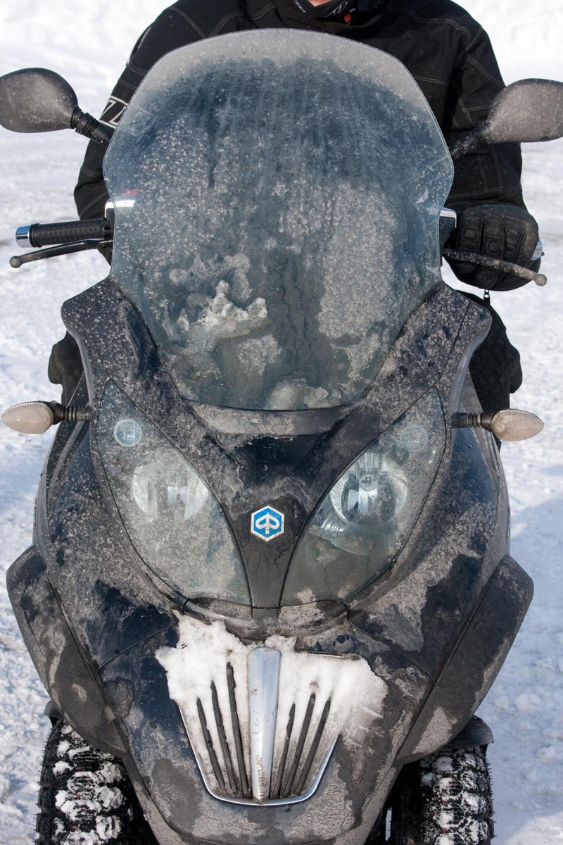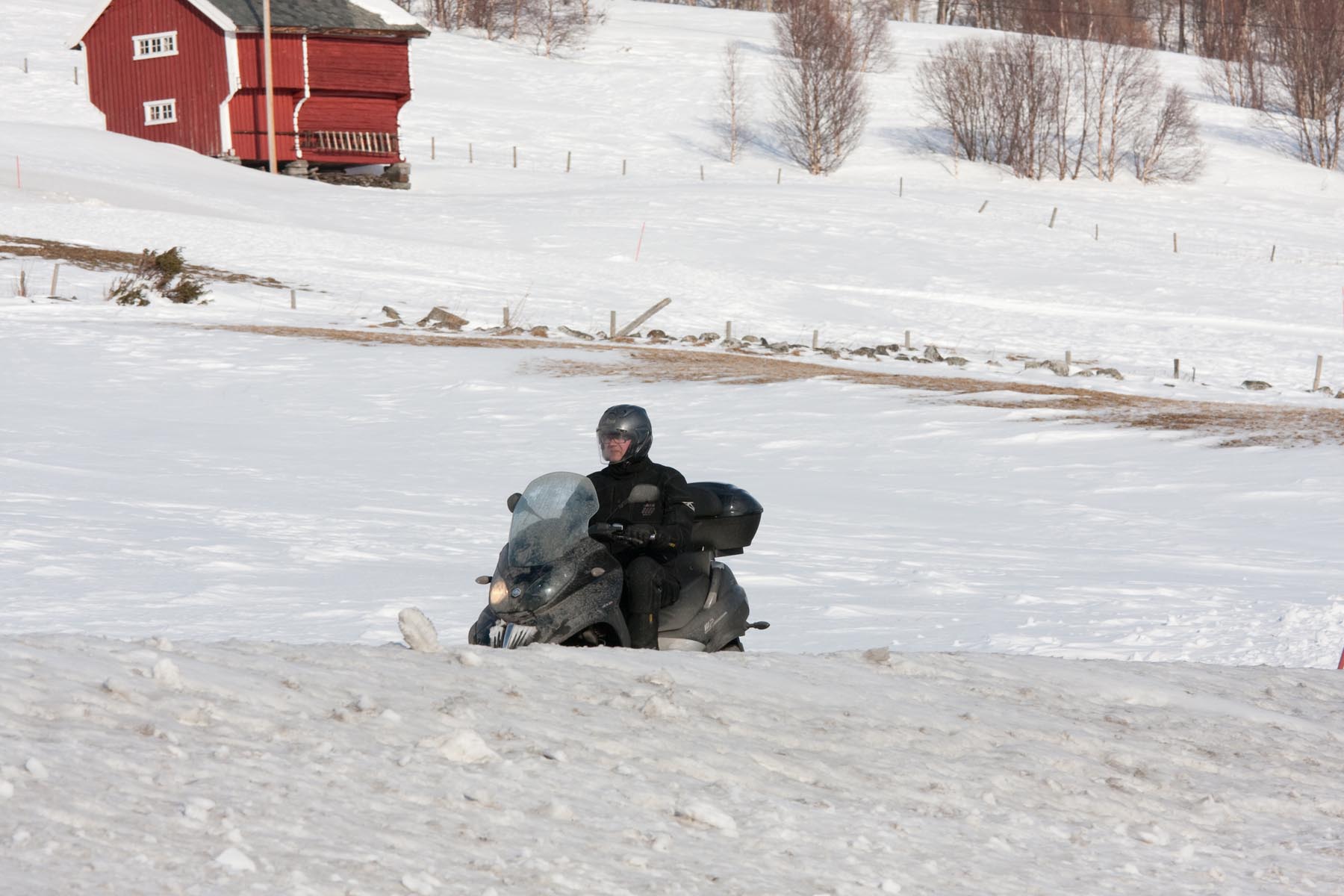 Bovenop de Hardangervidda glijd ik een bocht uit en vlieg ik over de vangrails in een ravijn. In de val verlies ik mijn helm. Als ik hem in de diepe sneeuw terugvind, merk ik dat mijn hoofd er nog in zit… Als ik wakker schrik aan boord van de boot van Kiel naar Oslo, voel ik even of ik nog een hoofd heb. Hm, ja. Dat valt dan weer mee. Maar ik ben te onrustig om verder te slapen en loop in het donker het dek op. Het sneeuwt, onder de boeg hoor ik het ijs kraken en vlakbij zie ik de eerste, kille silhouetten van de bergen. Wat zijn ze al hoog. Een paar honderd kilometer verder zijn ze nog veel hoger. En daar moeten we dus naartoe. Op twee Italiaanse driewielers: een 400 cc Piaggio MP3 en een 500 cc Gilera Fuoco. We zijn waarschijnlijk de eersten die dat doen in de sneeuw. Het begint nu pas bij me te dagen waarom. Het kan natuurlijk helemaal niet, door de dikke sneeuw ploegen met die kleine wieltjes…
