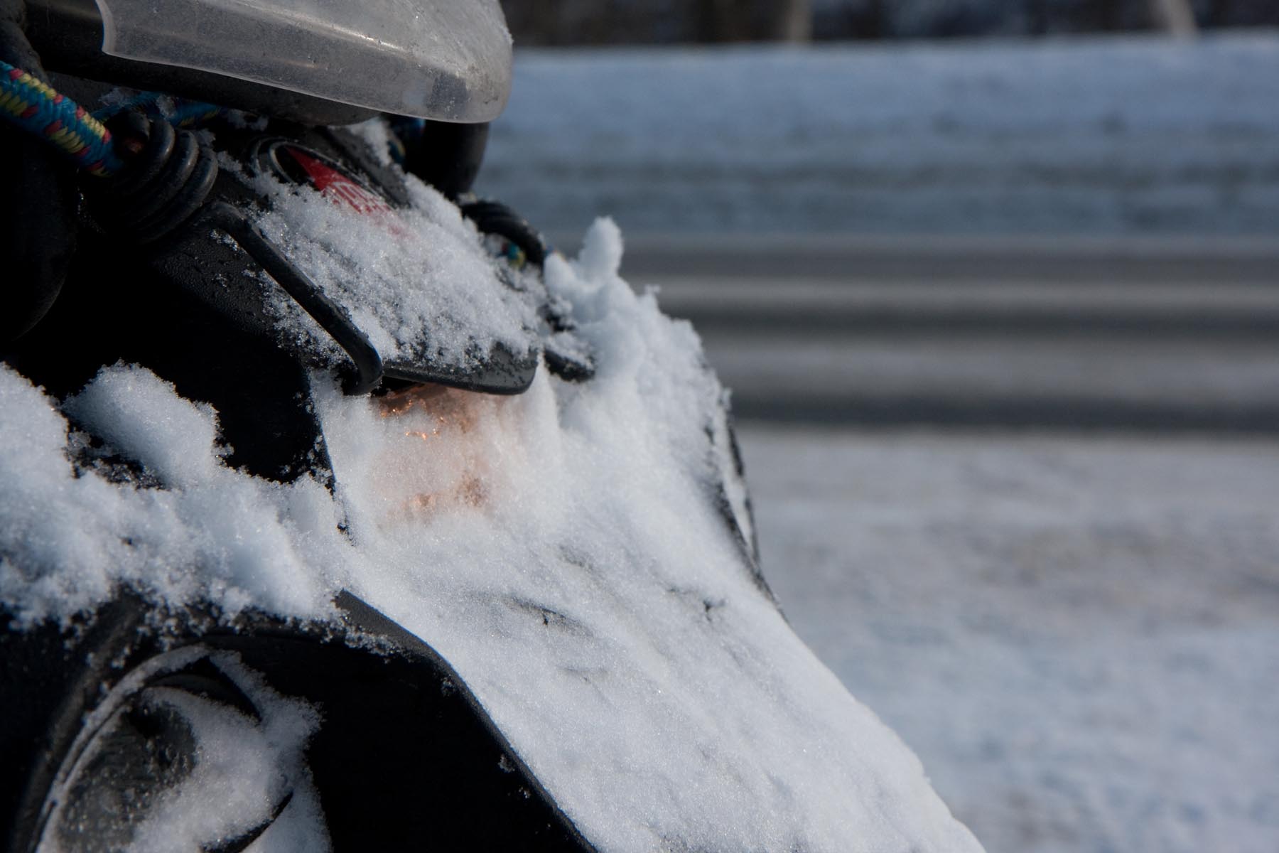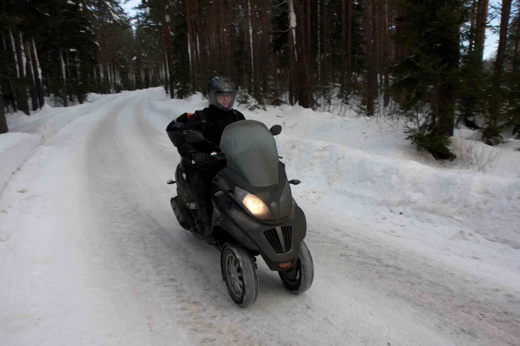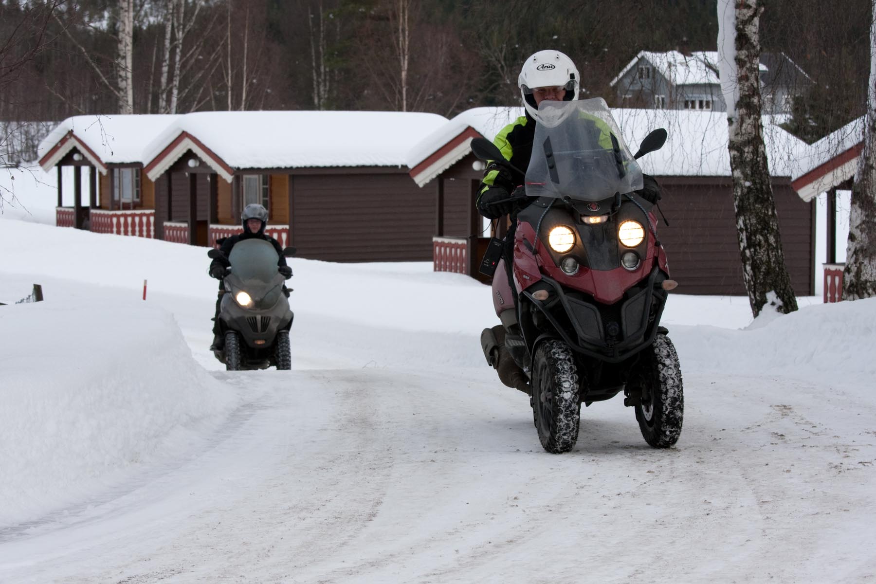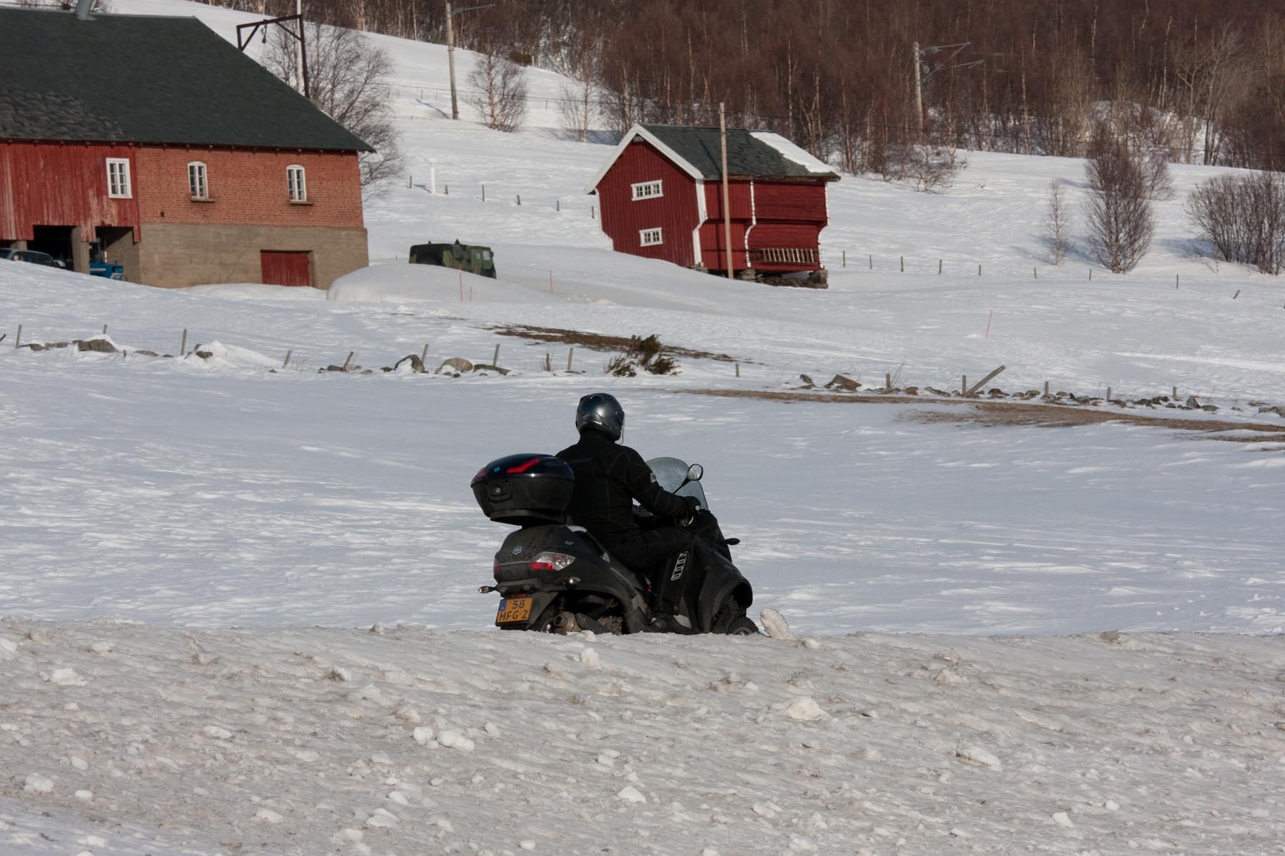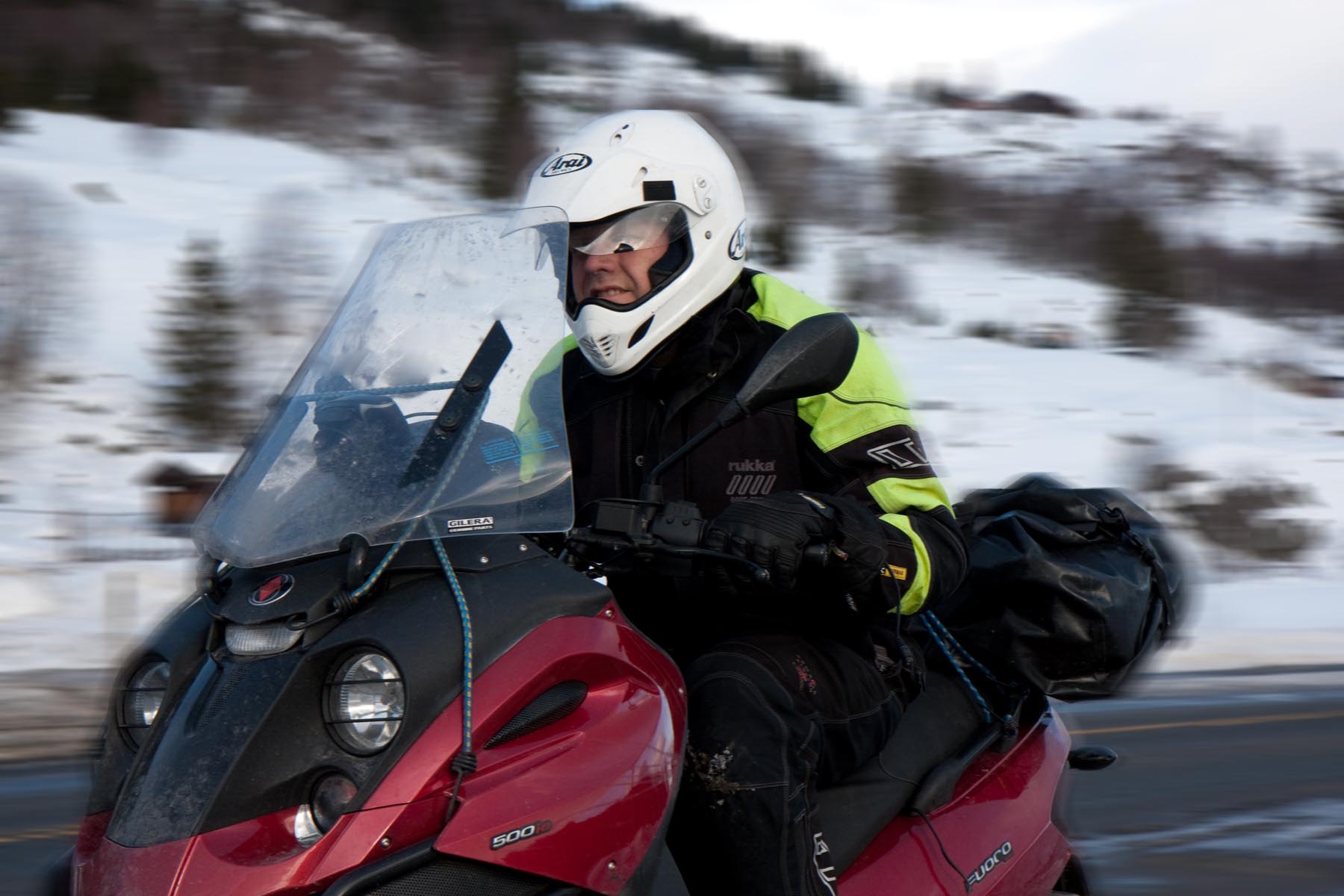 Bovenop de Hardangervidda glijd ik een bocht uit en vlieg ik over de vangrails in een ravijn. In de val verlies ik mijn helm. Als ik hem in de diepe sneeuw terugvind, merk ik dat mijn hoofd er nog in zit… Als ik wakker schrik aan boord van de boot van Kiel naar Oslo, voel ik even of ik nog een hoofd heb. Hm, ja. Dat valt dan weer mee. Maar ik ben te onrustig om verder te slapen en loop in het donker het dek op. Het sneeuwt, onder de boeg hoor ik het ijs kraken en vlakbij zie ik de eerste, kille silhouetten van de bergen. Wat zijn ze al hoog. Een paar honderd kilometer verder zijn ze nog veel hoger. En daar moeten we dus naartoe. Op twee Italiaanse driewielers: een 400 cc Piaggio MP3 en een 500 cc Gilera Fuoco. We zijn waarschijnlijk de eersten die dat doen in de sneeuw. Het begint nu pas bij me te dagen waarom. Het kan natuurlijk helemaal niet, door de dikke sneeuw ploegen met die kleine wieltjes…