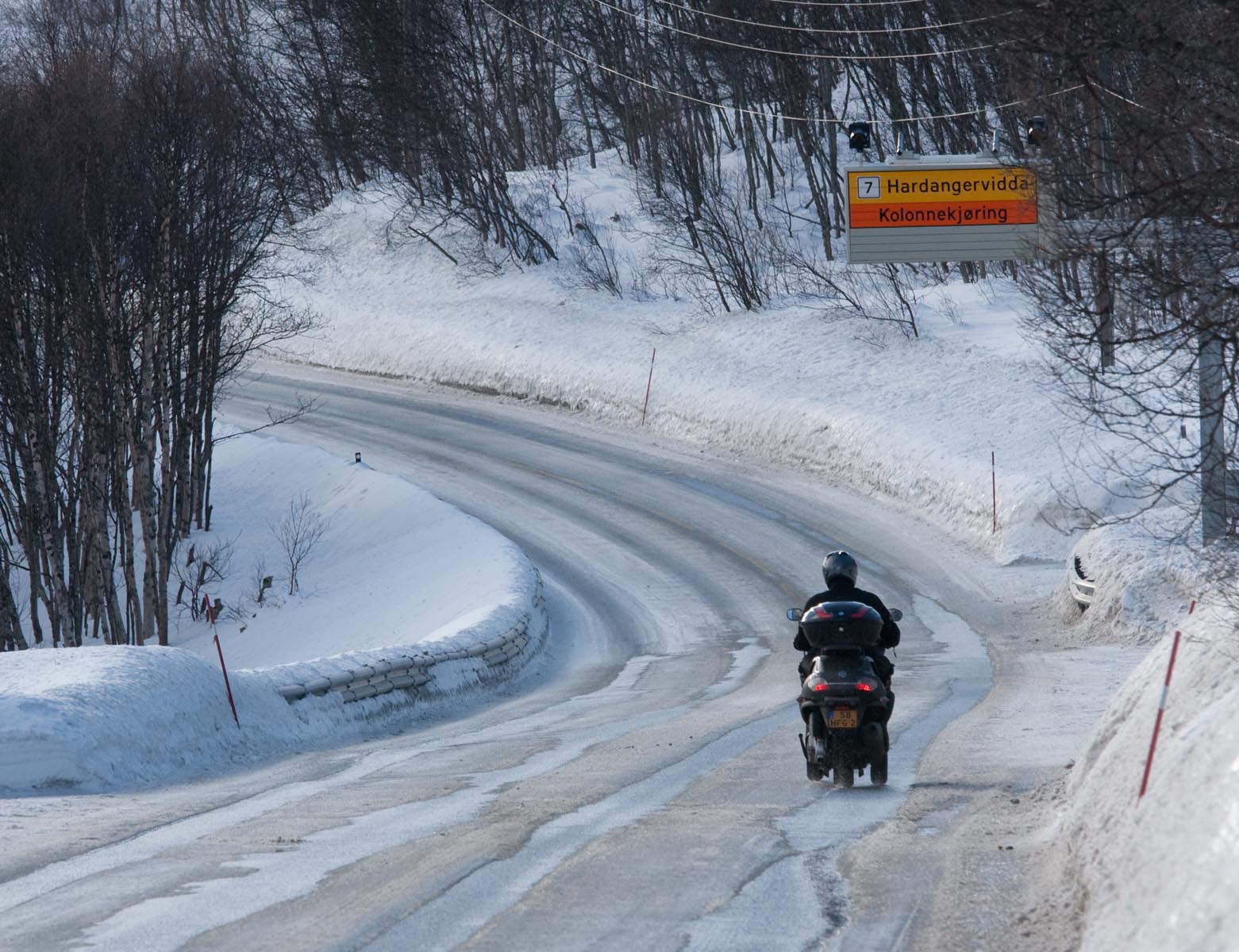 Vanuit Geilo (800 m) proberen we alsnog de Hardangervidda (1100 m) op te gaan. Al na een kilometer of tien verschijnt op de weg een ijslaag met diepe sporen. En die zijn net te smal voor de dubbele voorwieltjes van ons strijdkarretjes. We rijden als een asielzoeker die voor het eerst op schaatsen staat. Voor ons wordt het alleen maar erger, achter ons horen we de houtblokjes in de open haard van het hotel bijna knetteren. Het is even slikken en schelden, maar dan besluiten we toch maar om ermee te kappen.