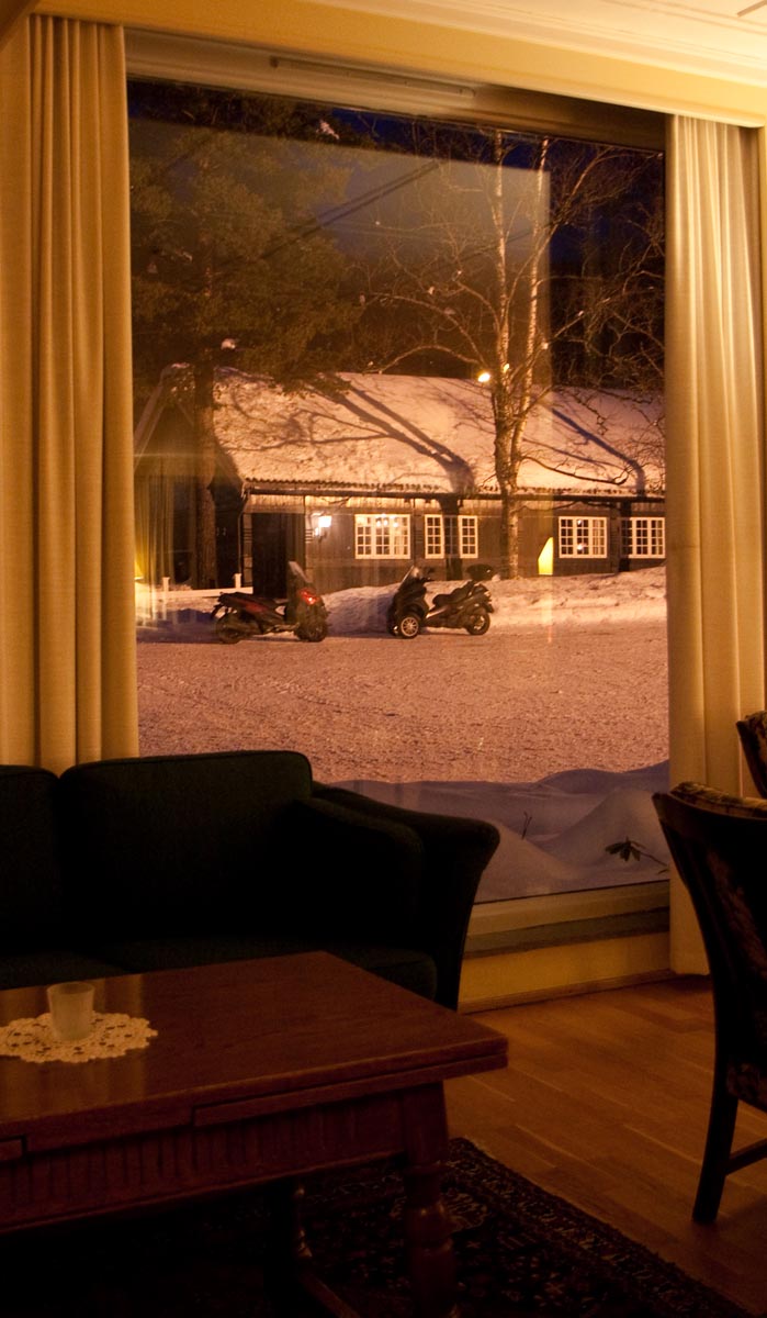 Het wordt slechter dan slecht. Er valt zoveel sneeuw dat we het verloop van de weg nauwelijks kunnen volgen en we blij zijn met elk bandenspoor dat we nog net kunnen zien. Uilskuikens die we zijn. Laten we ons lot afhangen van een kauwgomklappende kassakip, die als ze Gol op de kaart zou moeten aanwijzen waarschijnlijk haar vinger tussen Paramaribo en Langetabbetje plant. Die verwarring is overigens begrijpelijk. Ons doel – Pers Resort – is namelijk een tropisch zwemparadijs met palmbomen. Na bijna drie uur ploeteren en glibberen bereiken we het. Een thermometer geeft -12 aan en de driewielers lijken meer op een sneeuwbal dan op een motorscooter. De sneeuw is zo diep in de MP3 gedrongen dat het contact niet meer uit gaat, zelfs als je de contactsleutel eruit haalt. Morgen vast een lege accu. Maar hedenavond: een geweldig buffet, bier, warmte en gezelligheid. Totdat de barman vertelt dat een Duitse zijspanrijder even eerder frontaal op een tegemoetkomende truck is gedoken in het Hemsedal.