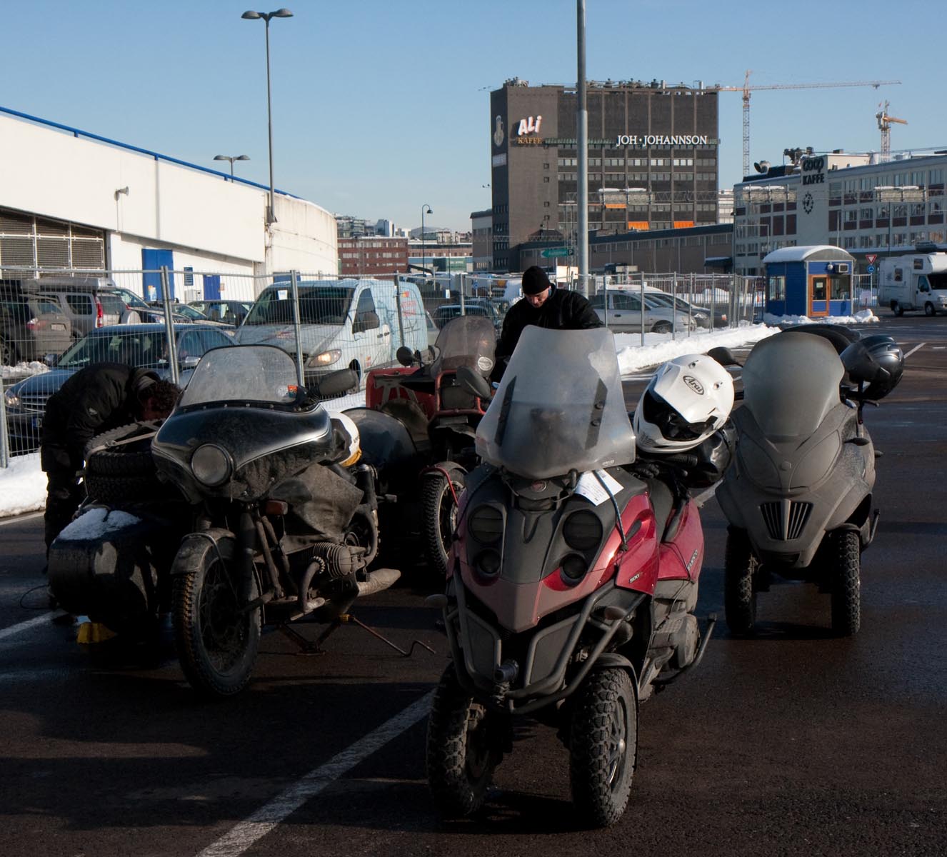 Bij de boot zien we toch nog een paar motorrijders, Duitsers. Ze dragen zesenveertig lagen kleding, rijden op oude leger GS’en met zware spijkerbanden en hebben hun zijspannen volgestopt met reservewielen en gereedschap. Met grote ogen zien ze toe hoe wij komen aanrijden op onze kappersbrommers en slanke motorpakken, waaronder nauwelijks meer zit dan een laagje elektrisch verwarmde kleding.
