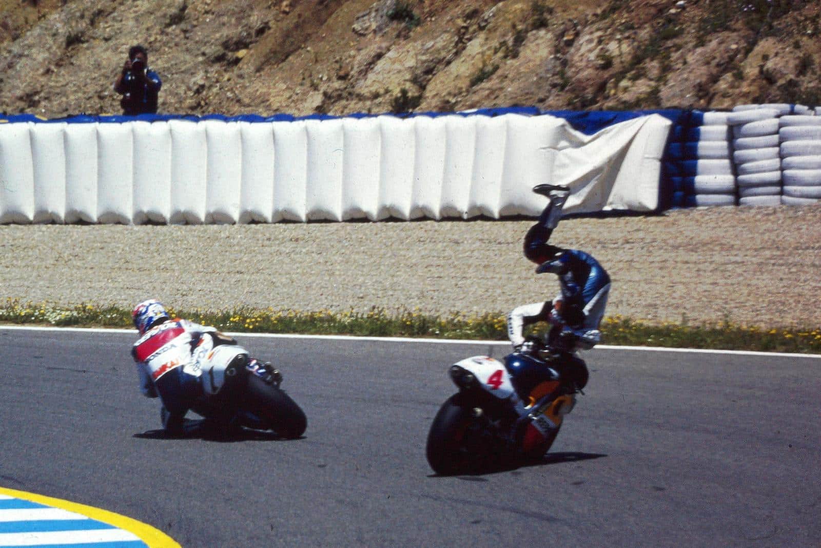 De beelden zijn bij veel motorsportfans bekend. In de laatste ronde van de 500cc-race van 1996 in het Spaanse Jerez was het publiek al massaal over de hekken geklommen en stond het letterlijk naast de baan toen Alex Crivillé en Michael Doohan het ‘stadiongedeelte’ in kwamen racen. De reden: Crivillé stond op het punt om zijn Repsol Honda-kopman Doohan te verslaan en de eerste Spaanse winnaar van de Grand Prix van Spanje in de 500cc te worden. Het Spaanse publiek was uitzinnig en zorgde voor een levensgevaarlijk tafereel in de tweede helft van het circuit. Crivillé had praktisch de hele race aan de leiding gereden en Doohan kon amper in zijn achterwiel blijven. Ook in de laatste ronde had de Spanjaard een klein gaatje. Maar juist in de bochten, waar het publiek op de baan en in de grindbak stond, vond Doohan weer de aansluiting. Wat een historische zege had moeten worden, eindigde in een drama. In de laatste bocht deed Doohan een ultieme aanval op zijn teamgenoot en die slaagde. Crivillé probeerde bij het uitkomen van de bocht te counteren, ging te vroeg op het gas en crashte met een flinke highsider. Doohan won en het publiek kon zonder Spaanse zege weer achter de hekken kruipen.