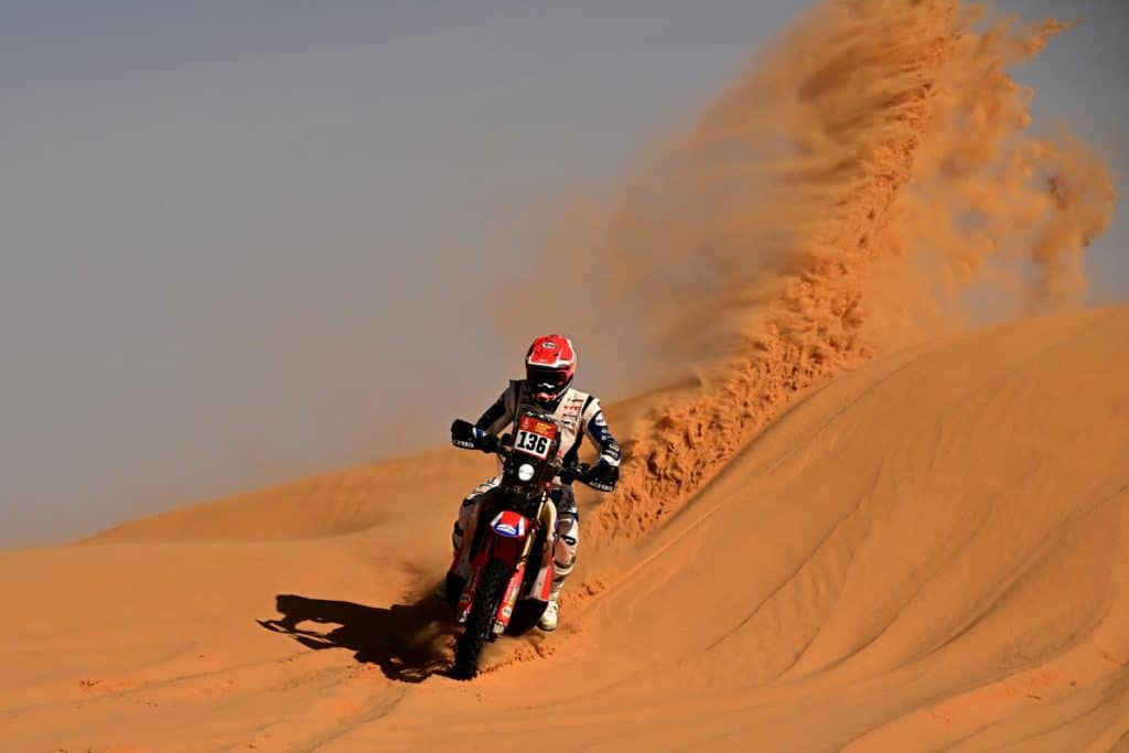 ‘Geen idee, maar er waren wel dagen dat ik het zwaar had in de woestijn. Het aantal valpartijen was soms op de vingers van twee handen niet te tellen. Gelukkig rijden we met een airbag van Alpinestars. Na drie keer vallen moet je de patronen vervangen. Je hebt dus altijd een aantal patronen bij je. Eén keer schoot bij een val de rechterschouder uit de kom, maar die kwam direct weer op z’n plaats terug. De fysiotherapeut die bij het team was, heeft daarna elke dag mijn schouder stevig ingetapet. De rest van de rally heb ik met zware pijnstillers gereden.’
