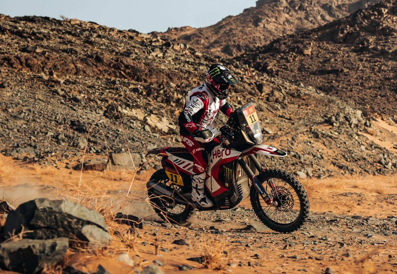 ‘Geen idee, maar er waren wel dagen dat ik het zwaar had in de woestijn. Het aantal valpartijen was soms op de vingers van twee handen niet te tellen. Gelukkig rijden we met een airbag van Alpinestars. Na drie keer vallen moet je de patronen vervangen. Je hebt dus altijd een aantal patronen bij je. Eén keer schoot bij een val de rechterschouder uit de kom, maar die kwam direct weer op z’n plaats terug. De fysiotherapeut die bij het team was, heeft daarna elke dag mijn schouder stevig ingetapet. De rest van de rally heb ik met zware pijnstillers gereden.’