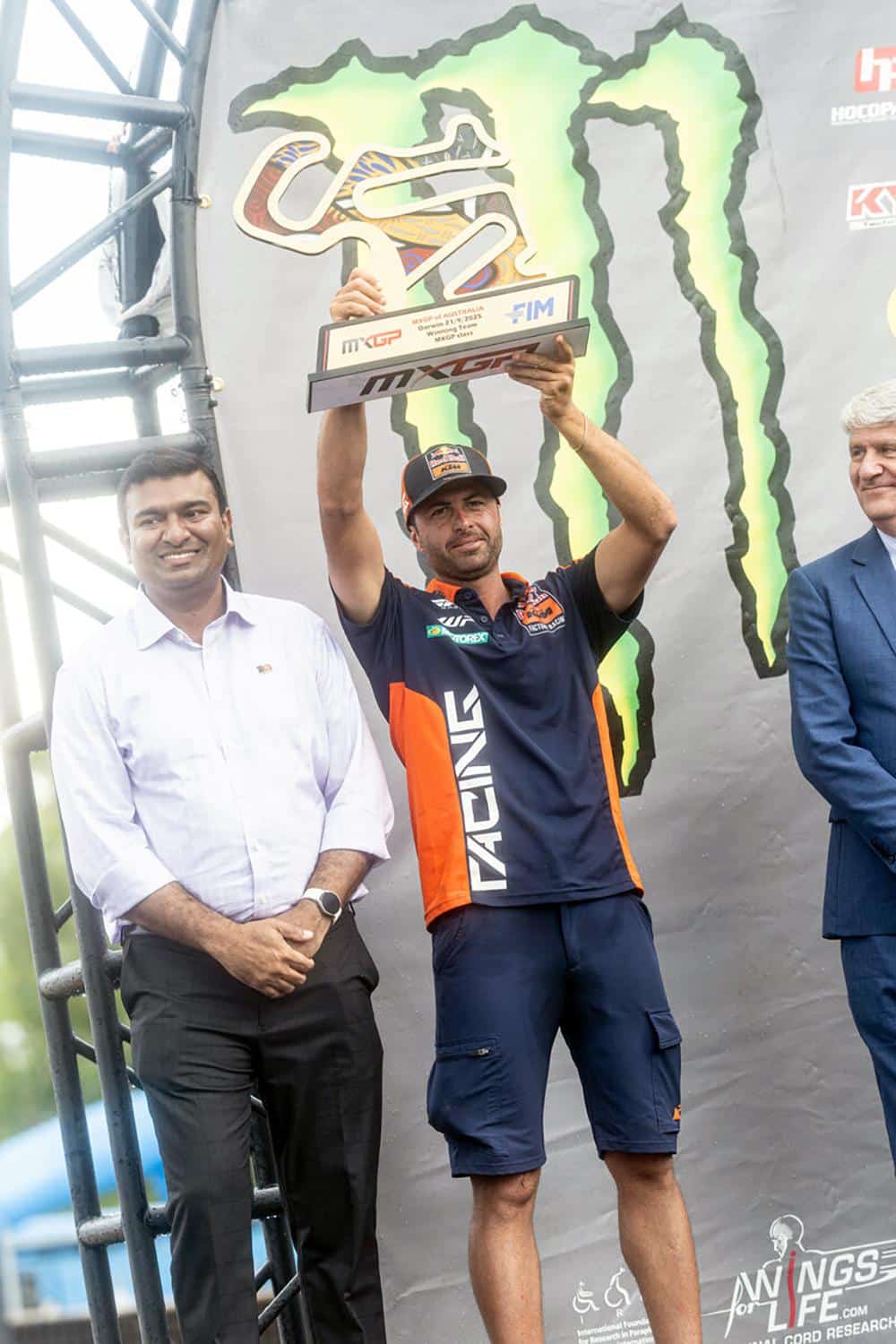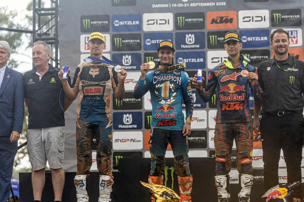 ‘Het is erg fijn om met Simon te werken. Vanaf het moment dat hij voor ons is gaan rijden hebben we in hem geloofd. Hij heeft zich volledig gegeven in de vier jaar dat hij nu voor ons rijdt. Hij had maar één doel voor ogen: wereldkampioen worden. Simon is een harde werker en heeft alles voor zijn sport over. Ik zal zijn eerste GP bij ons nooit vergeten. Dat was Matterley Basin in 2022. Simon won de kwalificatierace op zaterdag en beide manches op zondag, waardoor hij toen de rode plaat kreeg. Vanaf dat moment hebben we hard gewerkt om kampioen te worden. Het geluk was niet aan zijn zijde met blessures in zowel 2023 als in 2024. Toch wist hij beide jaren derde te worden in het wereldkampioenschap. Dit jaar verliep geweldig. We kregen de rode plaat, verloren die in zijn eigen land en kregen de rode plaat weer terug in Letland. Als ik de Simon van vorig jaar vergelijk met die van dit jaar, dan zie ik dat hij fysiek beter voorbereid was, dat zijn rijtechniek is verbeterd en dat hij flexibeler was, waardoor hij meer openstond voor veranderingen. Ik ben er trots op wat wij dit jaar hebben bereikt. Het is fantastisch kampioen te zijn geworden, niet alleen voor Simon, maar ook voor ons team. Onze laatste MX2-titel was in 2019 met Jorge Prado. Des te langer je hebt moeten wachten op de volgende titel, des te fijner het is om kampioen te worden. We staan nu op vijftien wereldtiteDe beste drie van de MX2 van 2025: kampioen Simon Längenfelder, Kay de Wolf (links, tweede) en Andrea Adamo (derde).ls en hebben 171 GP’s gewonnen.’