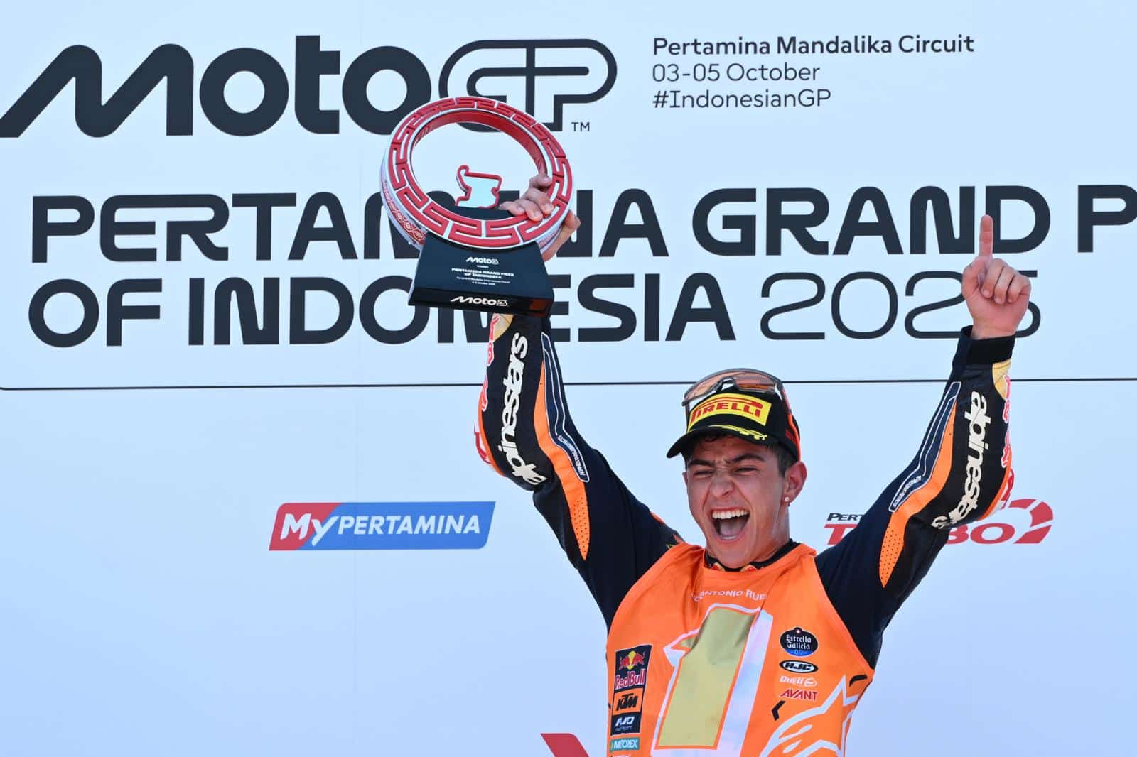 Het was eigenlijk al niet meer de vraag óf, maar alleen nog wanneer José Antonio Rueda de Moto3-wereldtitel zou veiligstellen. De 19-jarige coureur van Red Bull KTM Ajo greep zijn eerste kans meteen aan. Rueda had voorafgaand aan de race al 93 punten voorsprong op Ángel Piqueras – dat moesten er na afloop minstens 100 zijn om de titel definitief te pakken. Ook Máximo Quiles had nog een theoretische kans op het kampioenschap. De beslissing viel eigenlijk op het moment dat Rueda halverwege de race de leiding overnam in een kopgroep van tien rijders, terwijl Piqueras en Quiles door het afsnijden van een chicane een ‘long lap penalty’ kregen en daarmee hun kansen op de overwinning verspeelden. De kopgroep viel verder uiteen door een crash waarbij Taiyo Furusato, Álvaro Carpe en David Almansa betrokken waren. Terwijl Rueda met de titel in het achterhoofd zijn race reed, streden David Muñoz en Adrián Fernández vol voor de dagzege. Het tweetal haalde elkaar meerdere keren in, tot het misging: Fernández dook binnendoor bij Muñoz en raakte hem. Muñoz kwam op nare wijze ten val, bleef in de grindbak liggen en bleek later zijn dijbeen te hebben gebroken. Kort daarna werd de rode vlag gezwaaid, terwijl de voorlaatste ronde bezig was. Fernández reed op dat moment aan de leiding, maar kreeg voor het incident met Muñoz een tijdstraf ter waarde van een dubbele long lap penalty en viel terug naar de zesde plaats in de einduitslag. Rueda werd tot winnaar uitgeroepen, maar belangrijker nog: de wereldtitel was binnen. Mede dankzij de vierde plaats van Quiles en de zevende van Piqueras kon niemand hem nog inhalen. Volgend jaar mag de Spanjaard – die in 2025 al negen races wist te winnen – zijn kunsten vertonen voor Red Bull KTM Ajo in de Moto2 als teamgenoot van Collin Veijer.