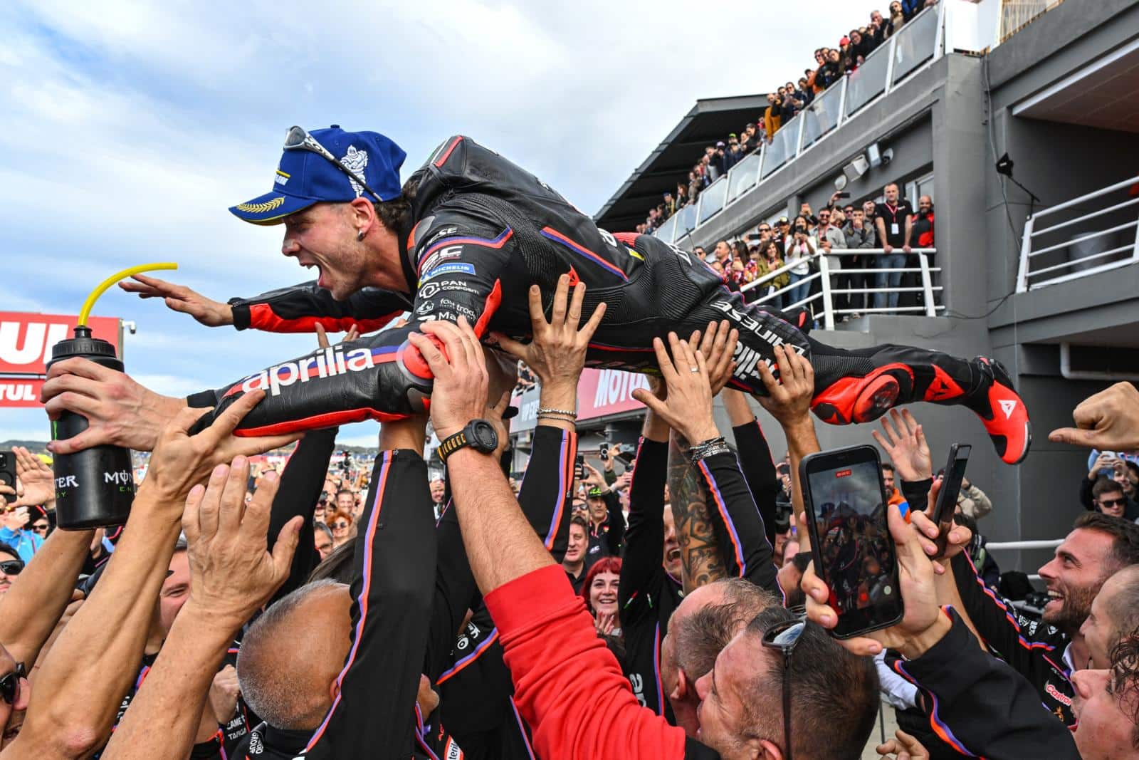 Gelukkig voor Aprilia kwam na het snelle afhaken van Martin de tweede rijder van het team, Marco Bezzecchi, als nieuwe leider bovendrijven. Samen met de technici van Aprilia ontwikkelde de Italiaan de RS-GP tot de grootste uitdager van het almachtige Ducati. Na een enigszins gelukkige zege op Silverstone, omdat Fabio Quartararo met een defecte Yamaha uitviel, werd de combinatie Bezzecchi/Aprilia sterker en sterker. Daarbij hielp de vroegtijdige uitschakeling van Marc Márquez, nota bene door Bezzecchi, natuurlijk mee. Nadat bij de laatste twee GP’s van het seizoen, die van Portugal en Valencia, Alex Márquez beide Sprint-races had weten te winnen, sloeg ‘Bezz’ tweemaal toe tijdens het hoofdnummer, de GP-race. Al met al leidde dit ertoe dat Bezzecchi knap derde in de eindafrekening werd. Het succes van Aprilia werd compleet gemaakt door Raúl Fernández. Nadat de Spanjaard in Australië zijn eerste MotoGP-zege had weten te behalen, zorgde hij er tijdens de laatste GP van 2025 voor dat Aprilia met een één-twee-zege kon gaan overwinteren. Maar Aprilia-racebaas Massimo Rivola bleef realistisch door te benadrukken dat zijn team zeker grote stappen vooruit had gemaakt, maar dat ene Marc Márquez er op het einde van het seizoen niet meer bij was.