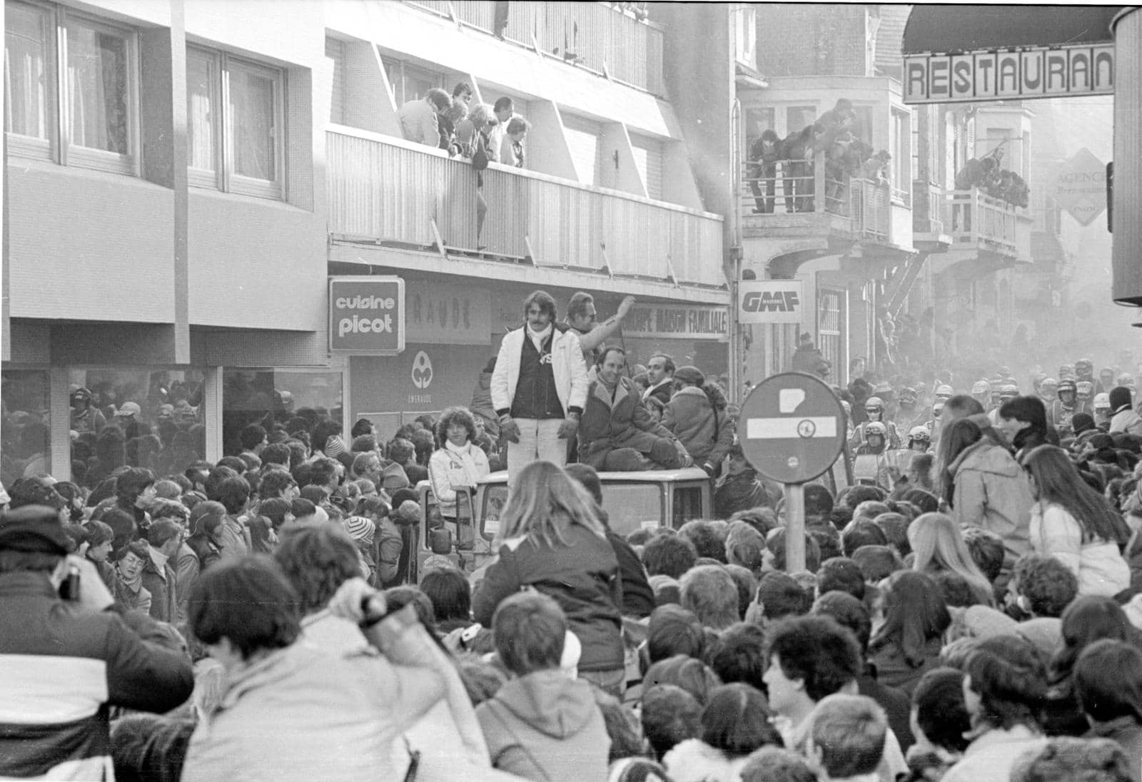 Le Touquet 1981. De deelnemers gaan van het parc-fermé in de stad naar het strand. Ze rijden achter een auto met daarop Thierry Sabine (witte jas) en burgemeester Léonce Deprez (zittend).