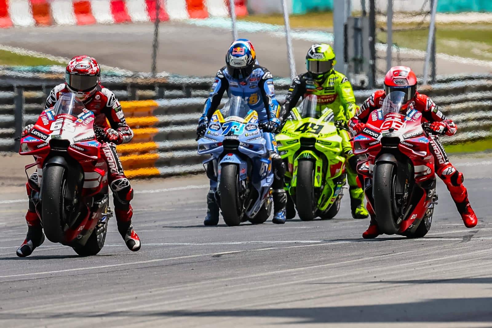 Maar eerst nog het 25e MotoGP-seizoen dat tevens dus een afsluiting van andermaal een technisch tijdperk is. Een tijdperk dat door Ducati de laatste vier jaar werd beheerst bij de coureurs en maar liefst zes achtereenvolgende jaren bij de constructeurs. Tijdens de eerste test van 2026 in Maleisië werd onmiddellijk duidelijk dat het Italiaanse merk ook voor dit seizoen de maatstaf vormt. Want de vijf aanwezige Ducati-coureurs — Fermín Aldeguer is nog herstellende van een dijbeenbreuk — klasseerden zich op de laatste testdag bij de snelste zes. Alleen Marco Bezzecchi (Aprilia) wist als tweede een complete Ducati-dominantie te voorkomen. Álex Márquez, die intussen als ‘Sepang-specialist’ kan worden betiteld, was zowel de snelste over één ronde als over een race-(Sprint)-simulatie. De Gresini-coureur heeft dit seizoen de beschikking over de nieuwste Ducati. Als derde volgde een andere GP26-rijder. Dat was VR46-coureur Fabio Di Giannantonio. Vlak hierachter zaten Pecco Bagnaia en Marc Márquez, oftewel de beide Ducati-fabriekscoureurs. Dat was voor velen een opluchting. Zeker in het geval van Bagnaia. Na een desastreus 2025-seizoen toonde de tweevoudig MotoGP-wereldkampioen zich zeer ingenomen met met name het gevoel in de voorkant van de nieuwe GP26. En Marc Márquez bleek na zijn zoveelste blessureleed onmiddellijk weer hard te kunnen gaan.