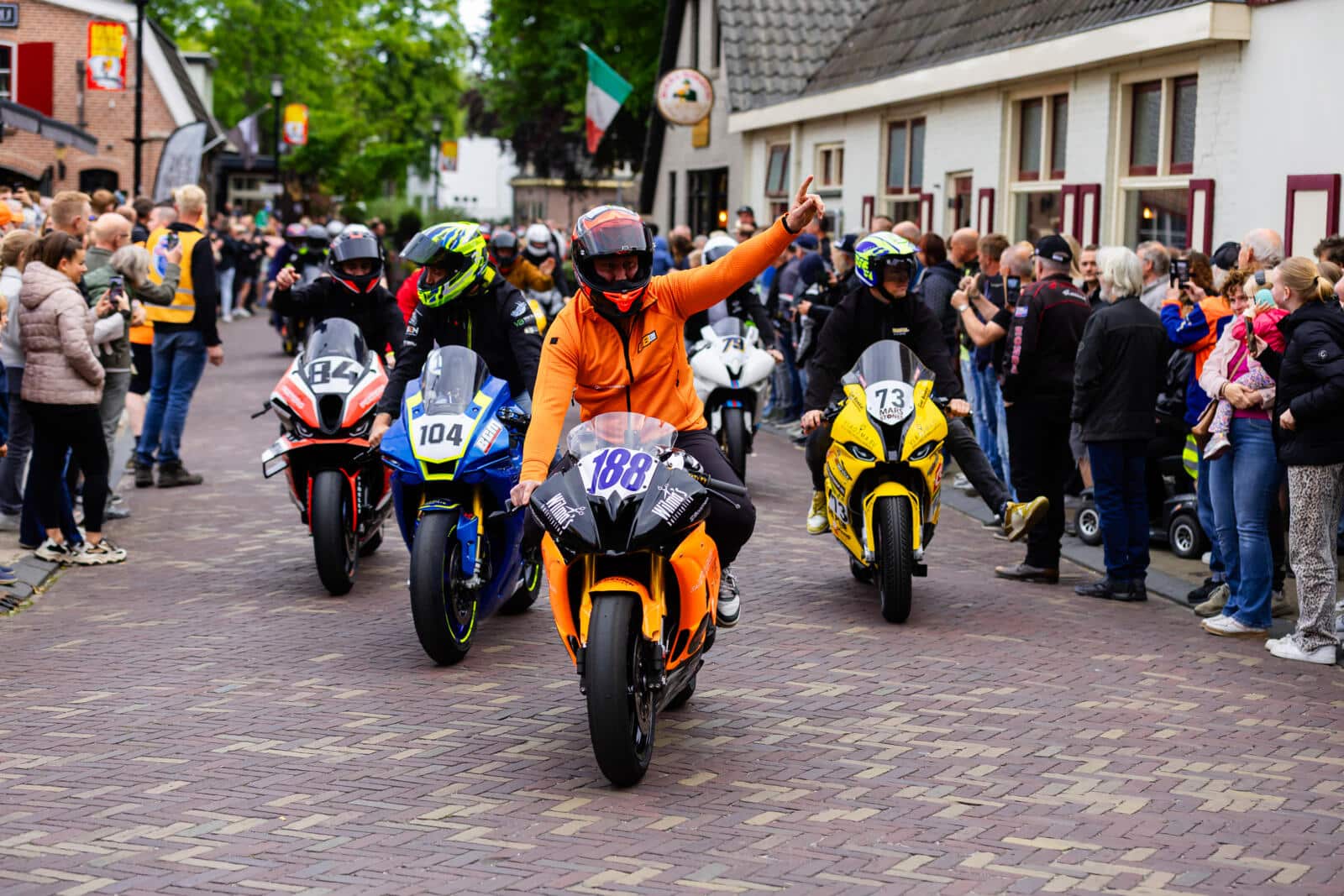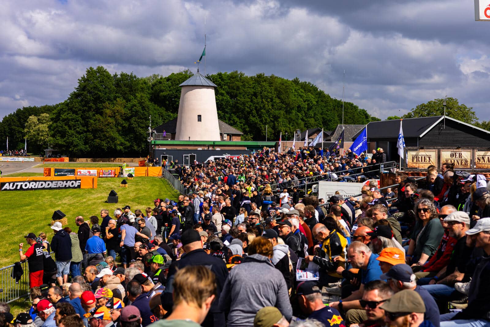 Maar dat was niet de voornaamste reden dat ik vorig jaar graag mijn gezin – mijn vrouw, dochter van vijf jaar en zoon van twee jaar – wilde meenemen naar Hengelo. Want naast de actie op de baan is de toegankelijkheid van het evenement geweldig en bijna uniek voor deze tijd. Dat begon voor ons al bij aankomst, of eigenlijk zelfs al onderweg. De bewegwijzering is uitstekend geregeld: al kilometers voor aankomst word je de juiste kant op geleid, en dat ging naadloos verder op de parkeerplaats. Omdat wij die dag een van de genodigden waren, konden we onze auto dicht bij het rennerskwartier kwijt. Vanaf daar was het nog maar een klein stukje lopen naar de befaamde molen, waar media, sponsoren en genodigden gedurende de dag welkom zijn. Toen we met z’n vieren aan de wandeling wilden beginnen, stopte er een golfkar naast ons. Een zeer vriendelijke vrijwilliger van HAMOVE bracht ons wel even naar de molen. ‘Dit doe ik de hele dag,’ vertelde hij enthousiast. Voor onze kinderen kon de dag na dit ritje al niet meer stuk. En qua gastvrijheid kon HAMOVE op dat moment al geen onvoldoende meer scoren. Natuurlijk snap ik dat je als toeschouwer niet met een golfkar wordt opgehaald, maar dat de organisatie hierover nadenkt voor genodigden zegt veel. En eigenlijk maakt het niet uit waar je bent op het circuit: alle vrijwilligers die het evenement mogelijk maken, laten je voelen dat je welkom bent. Of je nu een kopje koffie haalt, de weg vraagt of de tribune oploopt – overal is diezelfde Achterhoekse gastvrijheid. Ik dacht die dag: dit moet wel een van de vriendelijkste motorsportevenementen ter wereld zijn. Maar natuurlijk werd er ook geracet. We hebben met z’n vieren een tijd bij de Molenbocht gekeken. Ik vind die slingers vanaf de Boschbocht naar de laatste bocht geniaal, als je rijders op hoge snelheid van links naar rechts ziet gaan tussen de weilanden. En dan keihard aanremmen voor die laatste haakse hoek. De kinderen moesten even wennen. Niet aan het geluid – daar hadden we bescherming voor – maar vooral aan de actie, want alles gebeurt toch vrij dicht voor je neus. Maar het duurde niet lang of ze werden steeds enthousiaster. ‘Wie is dat die vooroprijdt?’ vroeg mijn dochter. ‘Dat is Thijs Peeters,’ zei ik. Beide kinderen hadden in Thijs al snel hun held gevonden. En hij won ook: vier keer in totaal, al hebben ze dat niet allemaal gezien. Wel verremde Thijs zich nog een keer in de Molenbocht, waardoor hij via het gras vlak voor ons langs schoot. Dat maakte indruk en daar werd thuis nog lang over nagepraat. Het mooiste van de racerij vonden ze uiteindelijk toch wel de start en de uitloopronde. Dan werd er volop gezwaaid en geklapt naar de rijders. En het leukste: bijna alle rijders zwaaiden terug.
