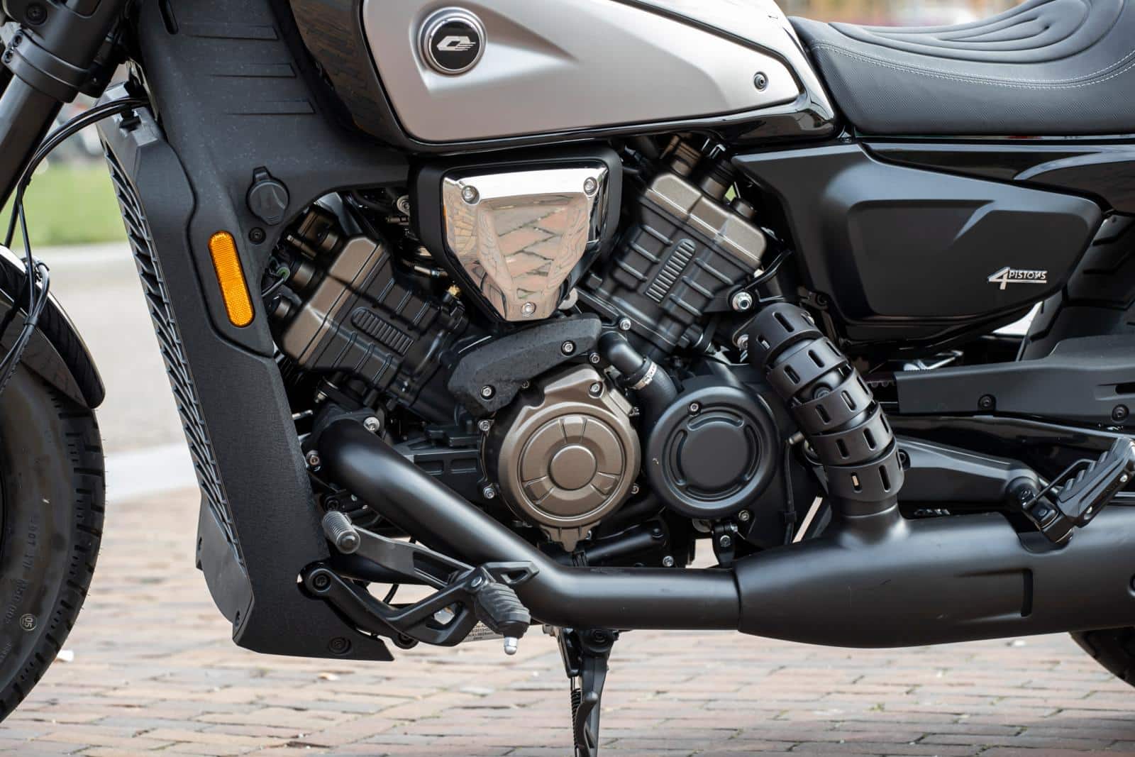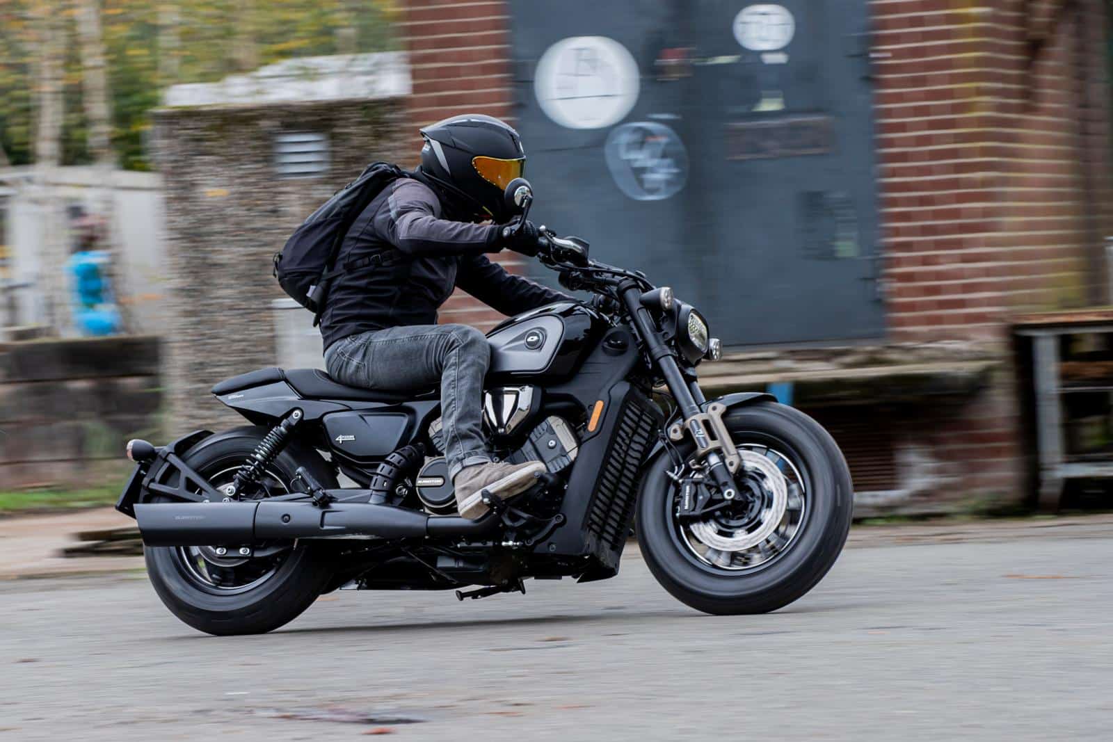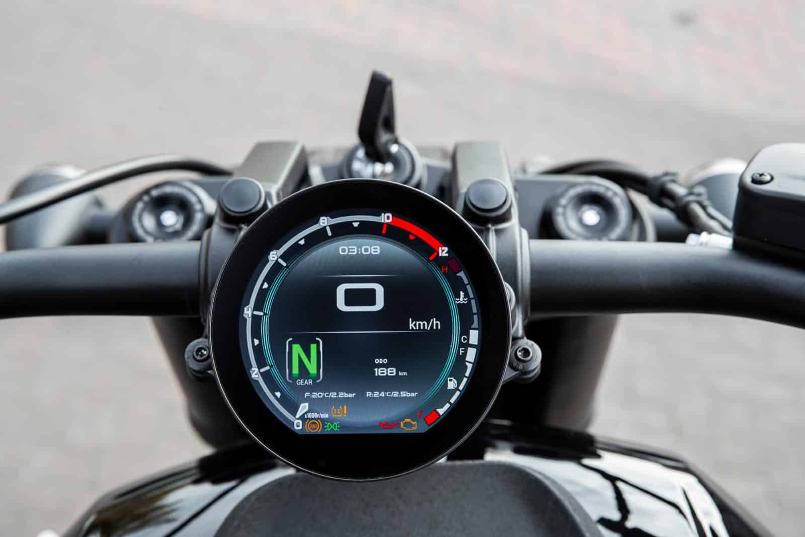 En daar zijn we maar wat blij om. Want de V4 in het vooronder is (nog steeds) een pareltje van een blok. Een 561 cc V4 met een cilinderhoek van 90 graden, goed voor 68 pk bij 10.500 tpm en 54 Nm bij 8.000 tpm. Gretig, toerenhongerig en vooral veel speelser dan je welke andere cruiser ook zou willen. Onderin valt niet al te veel op te rapen – zeker niet wat koppelwaarden betreft – maar draai je het gashendel een tikkeltje verder open, dan kan het plezier beginnen. Van om en bij de 3.500 tot voorbij de 10.000 (!) omwentelingen sleurt het krachthonk door dat het een lieve lust is, en ook qua soundtrack zal je het zelden beter treffen in dit segment. Verwacht geen krachtpatser waar je elke verkeerslichtenspurt mee wint – daarvoor is ’ie onderin net iets te zachtaardig – maar eenmaal aan de kook zet je menig uitdager ongetwijfeld een flinke hak. Het blok reageert boterzacht op het kabelbediende gas en vertaalt elke impuls, met dank aan de riemaandrijving, heel soepel richting achterwiel. De koppeling bedien je makkelijk met twee vingers en schakelen gaat vlot – al is het niet altijd even duidelijk wanneer je geschakeld hebt. Een tikkeltje meer feedback uit de bak was wenselijk geweest.