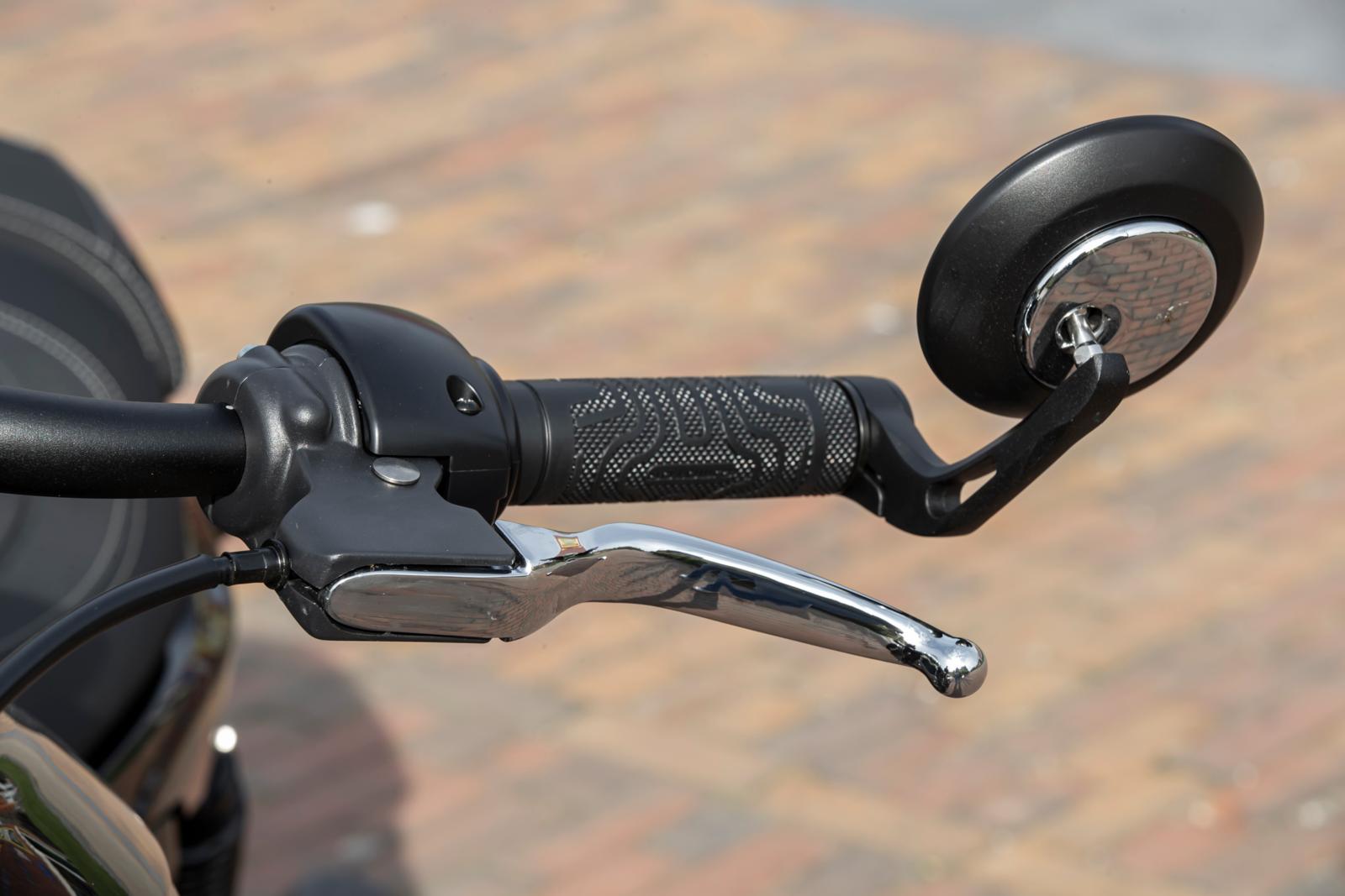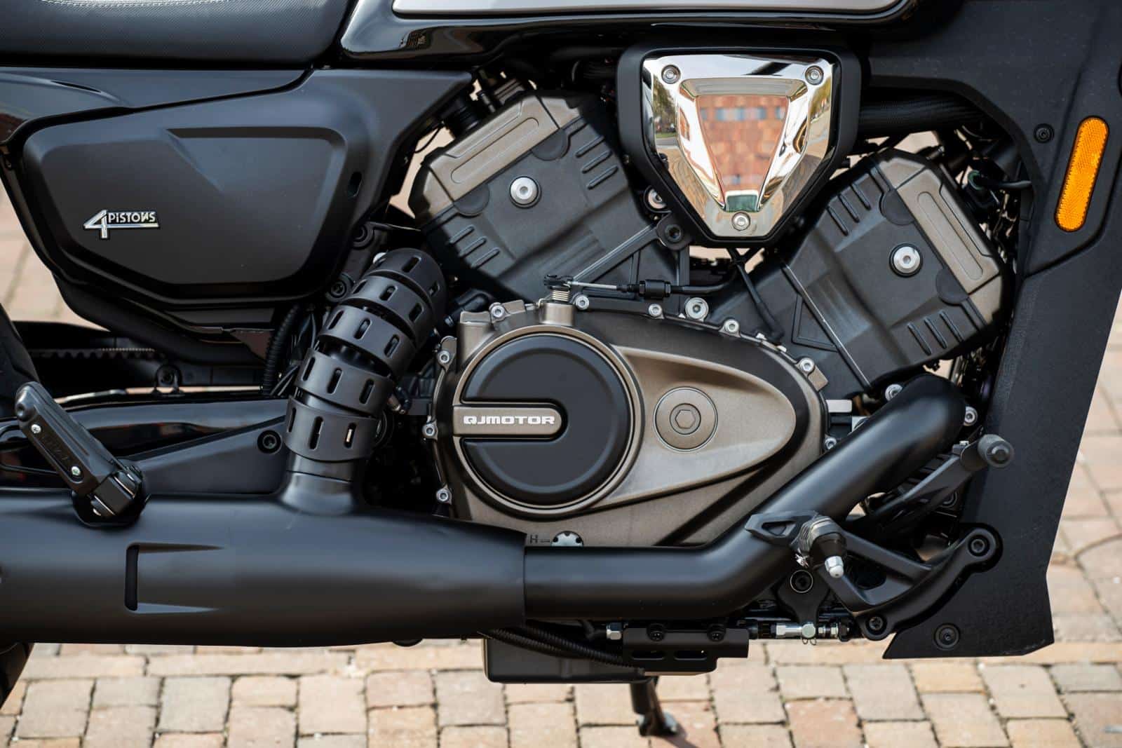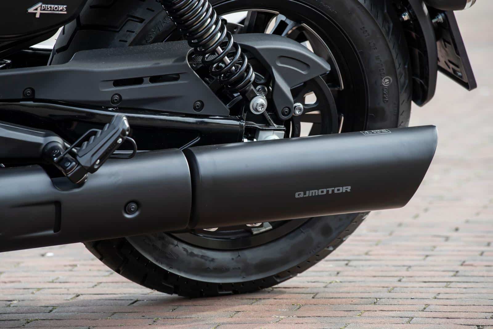 Qua looks heeft QJMotor het op z’n cruisertje – zoals bij nagenoeg elke telg uit z’n gamma – netjes voor elkaar. De SRV 600 V oogt als een volwassen, goed doordachte machine, die prima is afgewerkt. De glanzend zwartgelakte tank, de strakke bilpartij en de opvallende, horizontale ledstrook als koplamp vormen samen een uiterst appetijtelijk geheel, en de messingkleurige accenten op het blok maken het plaatje af. Dat QJ heel goed over de schutting heeft geloerd bij niet nader genoemde Amerikaanse merken mag duidelijk wezen: van de rem- en koppelingshendels, over de knoppenwinkel, tot de koplamp, ballonbanden en richtingaanwijzers toe… Die lijken wel ontwikkeld in Milwaukee. Maar het werkt wel. Beter goed afgekeken dan zelf slecht gemaakt, toch? Oké, het stickertje ‘4 pistons’ op de flanken is zowel overbodig als komisch – alsof iemand ’m zou verdenken van een ontbrekende zuiger – en de plastic afdekplaten over het stalen frame (om het op alu te doen lijken) hebben vooral het effect van een carbonmotiefje op plastic. Maar echt verkeerd is het allemaal niet.