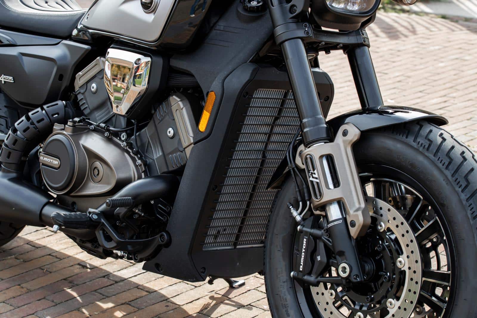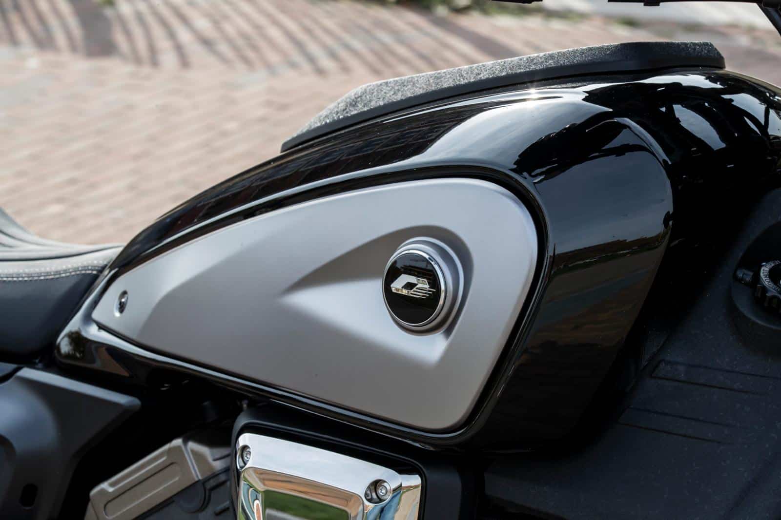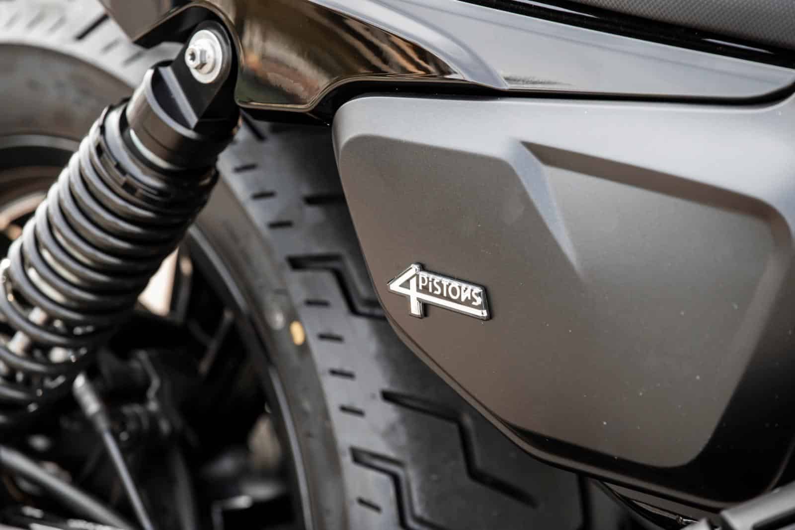 Qua looks heeft QJMotor het op z’n cruisertje – zoals bij nagenoeg elke telg uit z’n gamma – netjes voor elkaar. De SRV 600 V oogt als een volwassen, goed doordachte machine, die prima is afgewerkt. De glanzend zwartgelakte tank, de strakke bilpartij en de opvallende, horizontale ledstrook als koplamp vormen samen een uiterst appetijtelijk geheel, en de messingkleurige accenten op het blok maken het plaatje af. Dat QJ heel goed over de schutting heeft geloerd bij niet nader genoemde Amerikaanse merken mag duidelijk wezen: van de rem- en koppelingshendels, over de knoppenwinkel, tot de koplamp, ballonbanden en richtingaanwijzers toe… Die lijken wel ontwikkeld in Milwaukee. Maar het werkt wel. Beter goed afgekeken dan zelf slecht gemaakt, toch? Oké, het stickertje ‘4 pistons’ op de flanken is zowel overbodig als komisch – alsof iemand ’m zou verdenken van een ontbrekende zuiger – en de plastic afdekplaten over het stalen frame (om het op alu te doen lijken) hebben vooral het effect van een carbonmotiefje op plastic. Maar echt verkeerd is het allemaal niet.