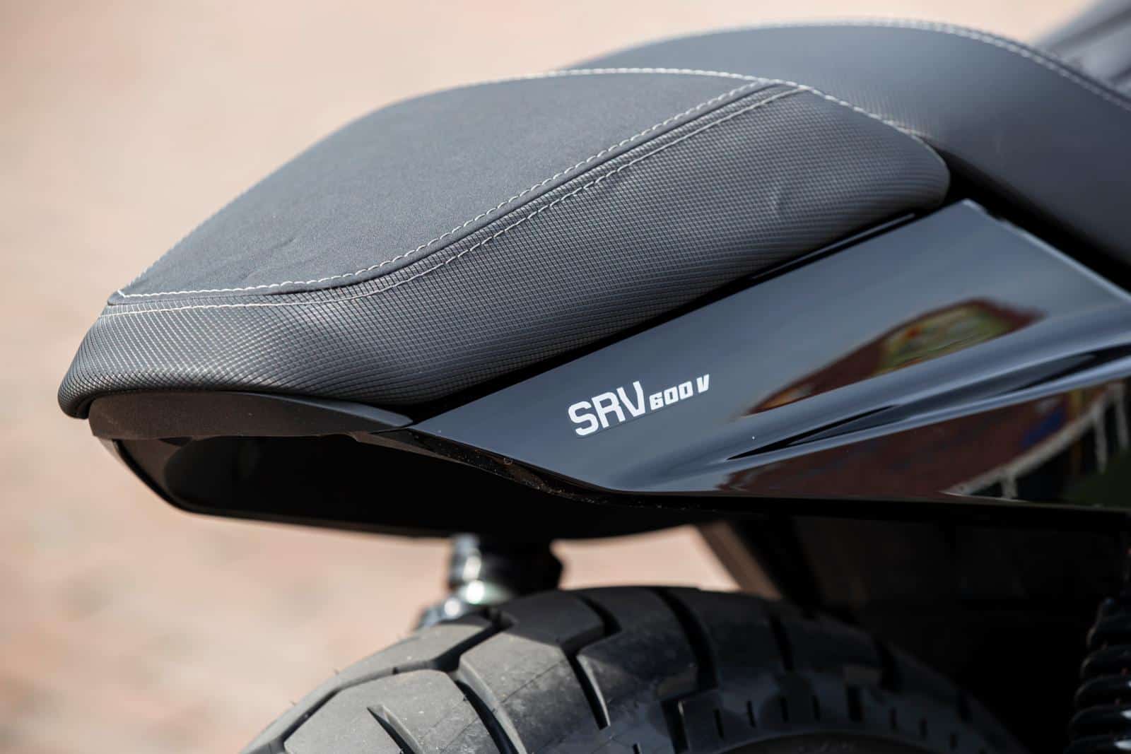 Op een motor zonder ride-by-wire of IMU hadden we geen overdaad aan elektronica verwacht, maar de SRV 600 V komt toch niet onbeslagen op het ijs. Alles wat er wél op zit, doet z’n werk immers prima. Van het mooie, overzichtelijke TFT-dashboard (met o.a. versnellingsindicator én bandenspanningsmeters!) tot de perfect functionerende tractiecontrole, die op het bebladerde wegdek meermaals gepast tussenbeide komt. Voorts noteren we evenmin een exces aan knoppen: startknop/dodemansknop, tractiecontrole en bedieningsknoppen voor het dashboard rechts, en links alles wat met verlichting en claxon te maken heeft. Enig minpuntje: de schakelaar voor de richtingaanwijzers is niet de handigste in gebruik, waarbij een tweede por op de aangeduide richting nodig is om ’m te doven. Niks mis met een oersaai standaardsysteem, QJ.