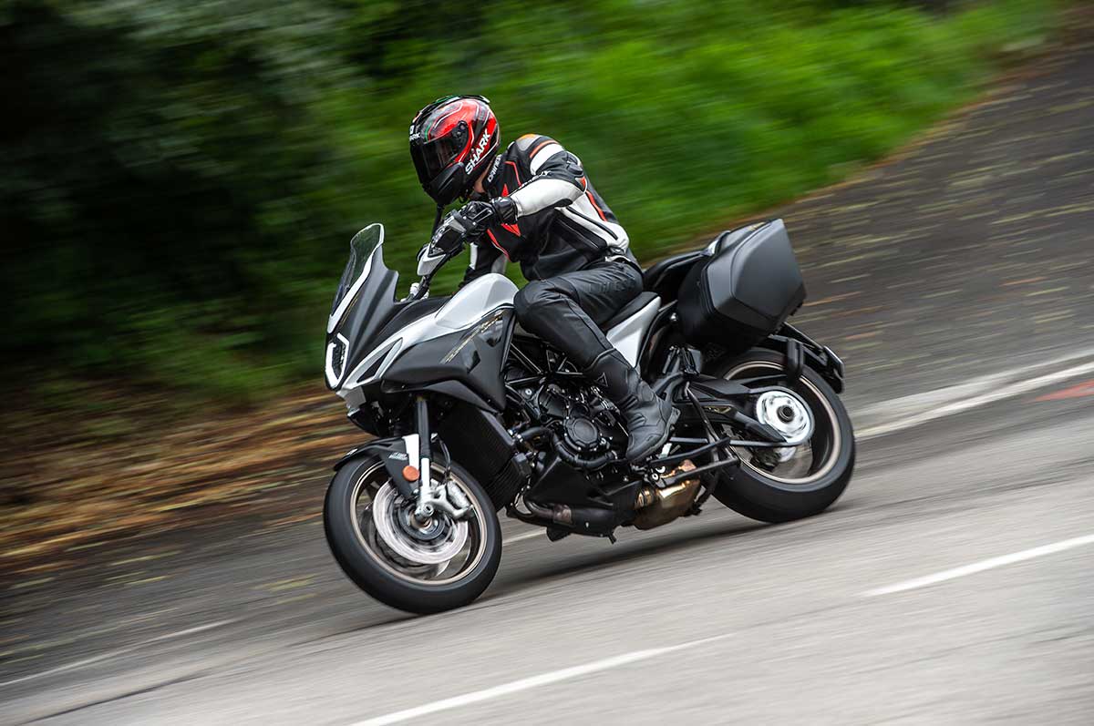 Als het om toercapaciteiten gaat, staat de Turismo Veloce zijn mannetje, hoewel hij voor duogebruik wellicht een tikje te krap is en ook wel wat vermogen tekort komt. Je kunt het windscherm gemakkelijk met één hand verstellen, maar het stelbereik van 60 mm is niet genoeg om je uit de turbulentie te houden. Ik heb af en toe moeite om het TFT-display te lezen. Het dashboard ziet er bijzonder fraai uit, maar het is nogal volgestampt met informatie, waardoor het niet echt overzichtelijk meer is. Positief is dan weer dat de brandstoftank een riante inhoud van 21,5 l heeft, wat een bijzonder acceptabel actieradius van meer dan 300 km oplevert. Verder kan de duorijder zich vasthouden aan zeer degelijke handvatten en behoren praktische zaken als een middenbok, een USB-stopcontact en verwarmde handvatten tot de standaarduitrusting. In de aantrekkelijk gevormde koffers past aan beide kanten een integraalhelm. En dat terwijl de achterzijde van de motor toch nog smaller is dan het stuur.