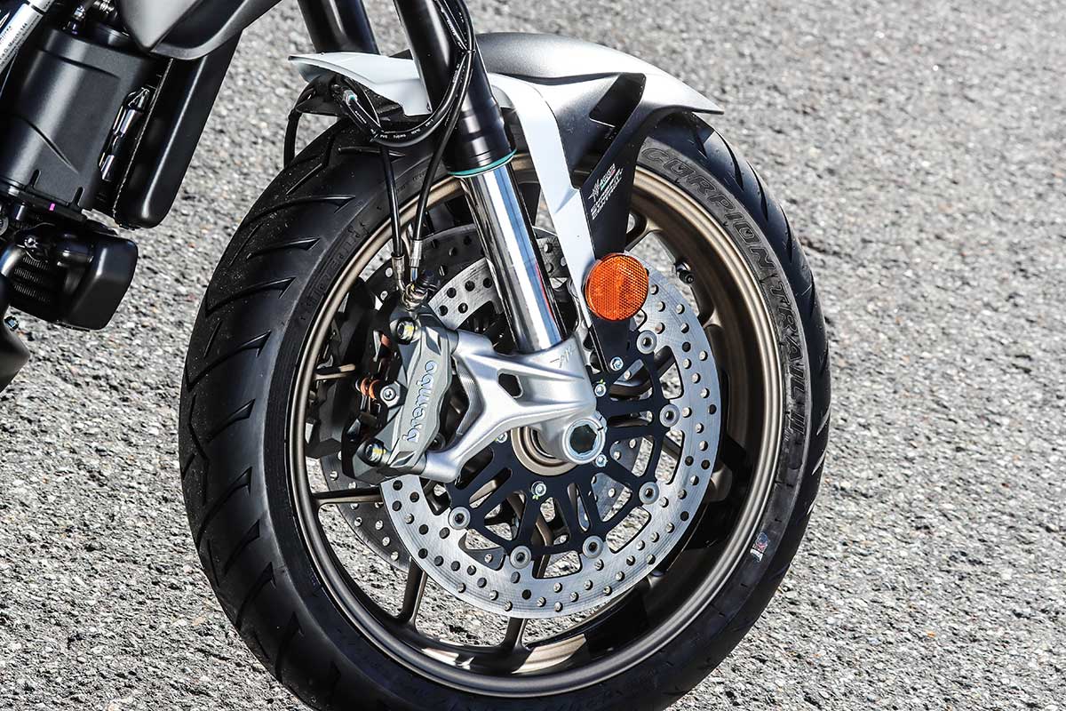 Op andere gebieden presteert de Turismo Veloce als vanouds. Het rijwielgedeelte is voor een sport-toermotor bijzonder wendbaar, geholpen door de in tegengestelde richting draaiende krukas en het bijzonder lage gewicht van slechts 192 kg droog. De MV laat zich met speels gemak van de ene in de andere bocht leggen, waarbij de bochtsnelheid hoogstens wordt beperkt door de riante veerwegen, 160 mm voor en 165 mm achter. Beide versies van de Lusso zijn uitgerust met de semi-actieve Sachs Skyhook vering, in plaats van de Marzocchi voorvork en de Sachs monoschokdemper die je op de standaardmodellen aantreft. Wanneer je een andere rijmodus kiest, wordt de demping van de voor- en achtervering daar automatisch op aangepast. Je kunt de veervoorspanning daarnaast nog met de hand aanpassen, de achterschokdemper heeft daarvoor zelfs een handige handversteller. Met zulke riante veerwegen is het echter niet te voorkomen dat de vering duikt bij het remmen en omhoog komt bij het optrekken. De semi-actieve vering weet dat echter tot een minimum te beperken, vooral in de wat stuggere sportmodus. De kwaliteit van het rijwielgedeelte zorgt ervoor dat de MV erg snel en controleerbaar voelt op bochtige wegen. De Pirelli Scorpion Trail banden leveren een redelijke hoeveelheid grip, er is meer dan genoeg grondspeling en de radiale Brembo remmen staan garant voor een zee aan remkracht.